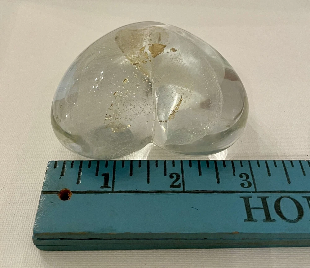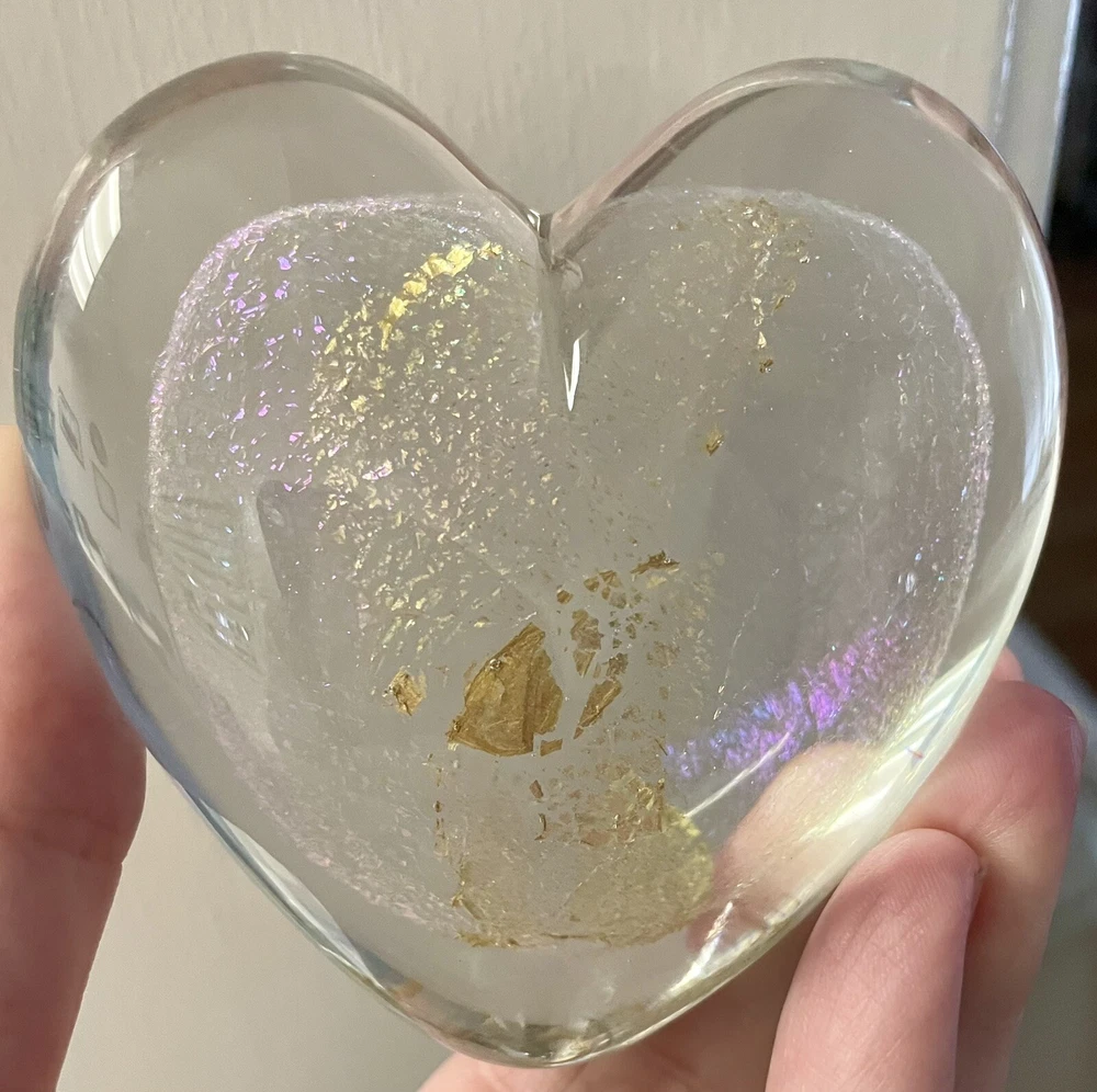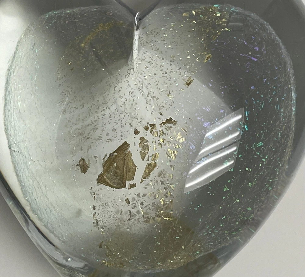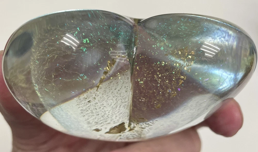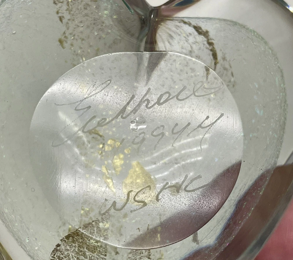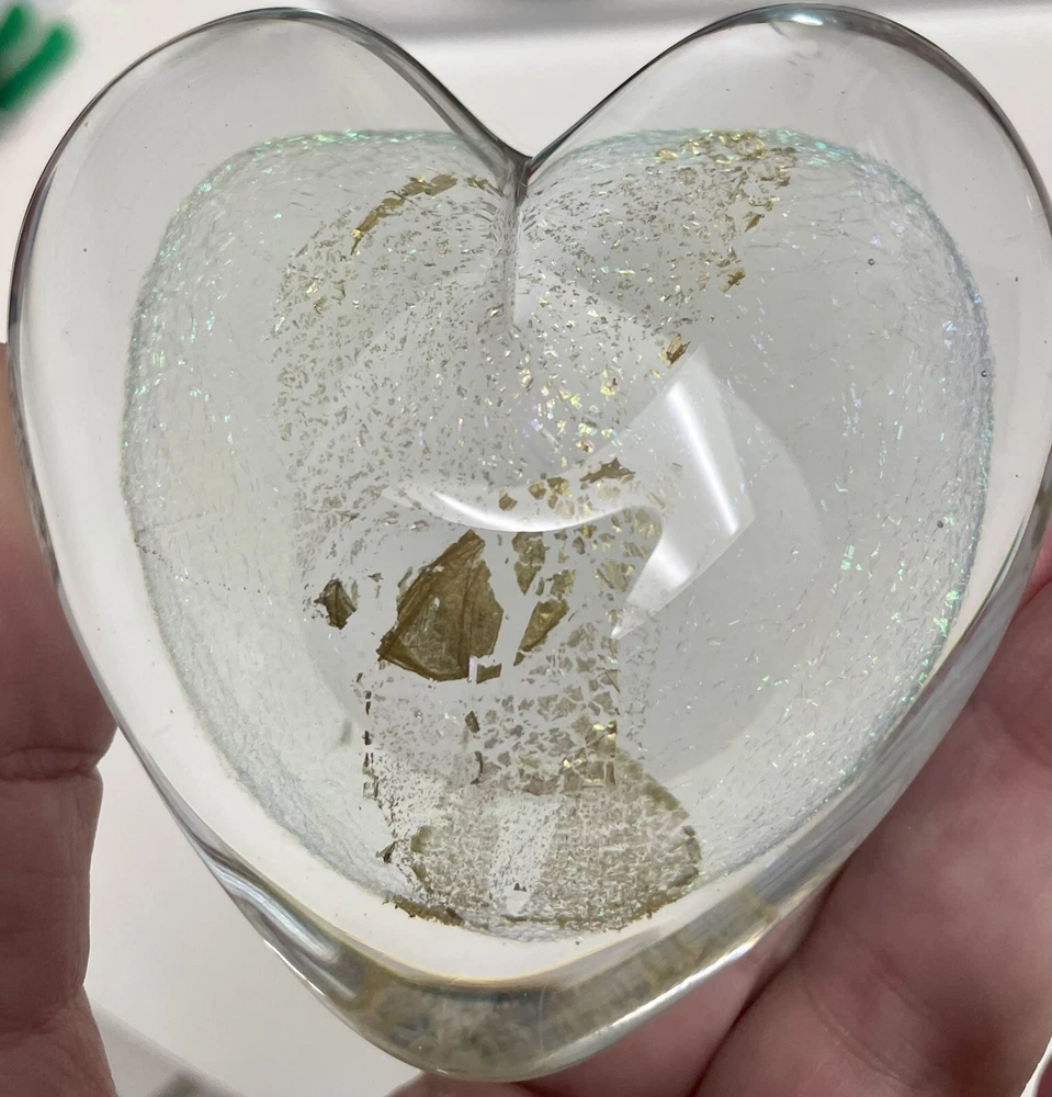 This is a Vintage Eickholt Studio Hand Blown Heart Shaped Art Glass Paperweight. It is signed & dated. Eickholt 1994H WSHC It’s predominantly gold leaf/flakes with subtle twinkles of blue, purple & green accents. It is absolutely beautiful! I used different backgrounds to show the color variance of the paperweight. The intensity of the colors also depends on the angle it is observed & the angle that the light hits. It is in good condition. There are no chips or cracks. It measures approximately 3 1/4”L x 3”W x 1” thick. If you have any questions, please don’t hesitate to ask. Thank you!