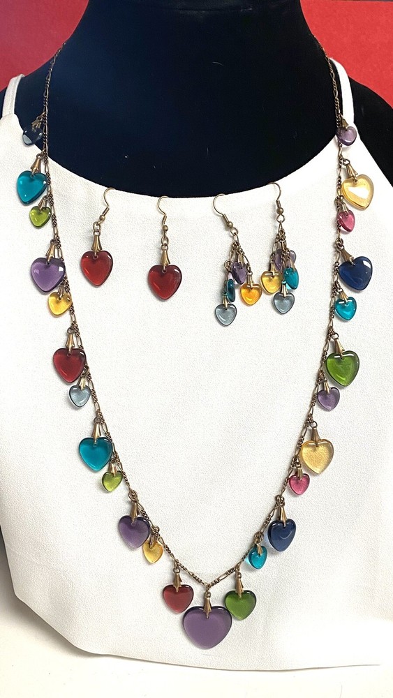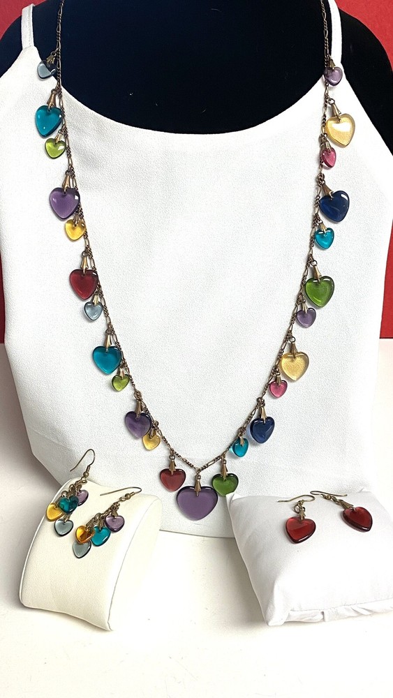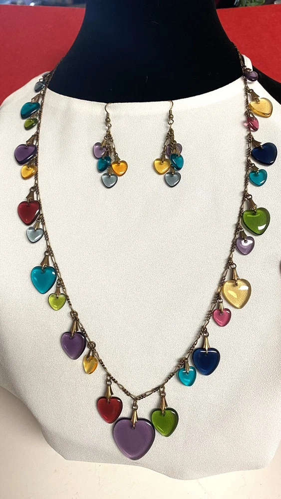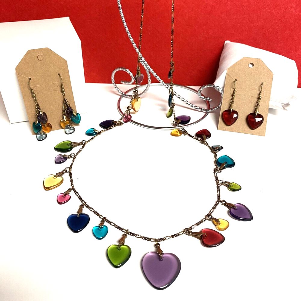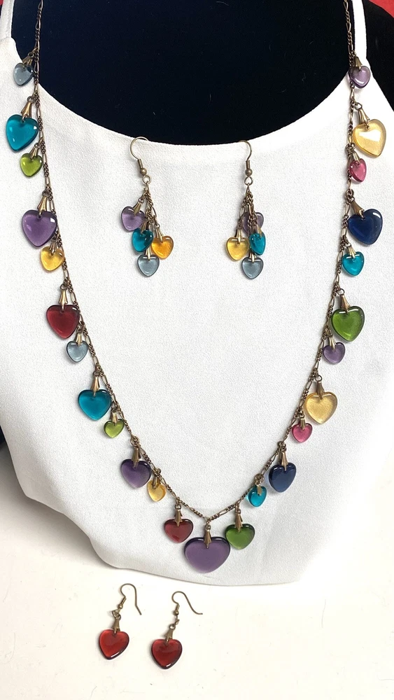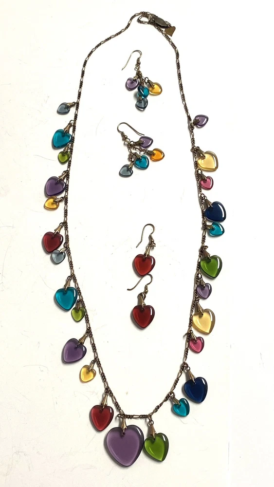This vintage Glass Works Studio necklace and earring set is a stunning addition to any jewelry collection. The set includes a 30" long necklace with heart-shaped glass charms in multicolor and two pairs of matching earrings. The jewelry is made of brass and has a vintage and antique feel. The necklace and earrings are signed by the artist and have a unique and artistic design. The set is perfect for anyone who loves vintage jewelry or wants to add a touch of charm to their outfit. This set is a great gift for a loved one or for yourself. Your purchase will include a Necklace with 2 pairs of Matching pair of Earrings! It's Very RARE to fine Neckless with 2 pair of matching earrings! Thank you for shopping and supporting my small Business :)
