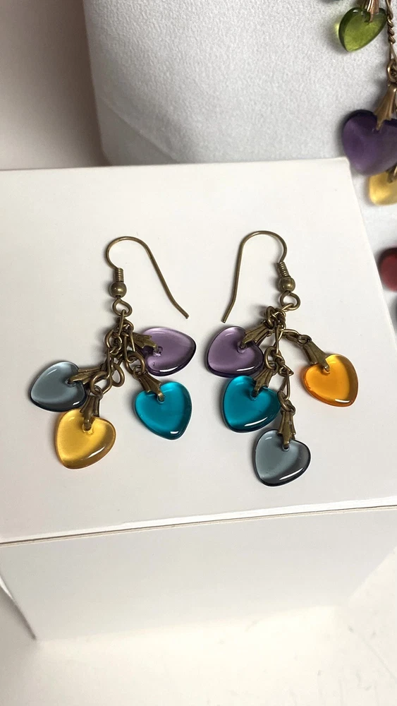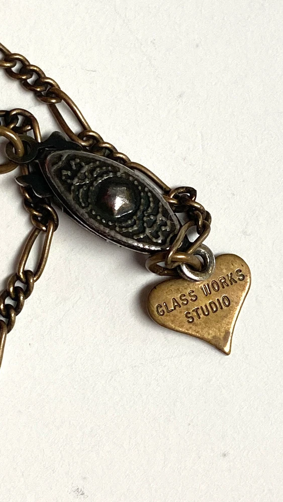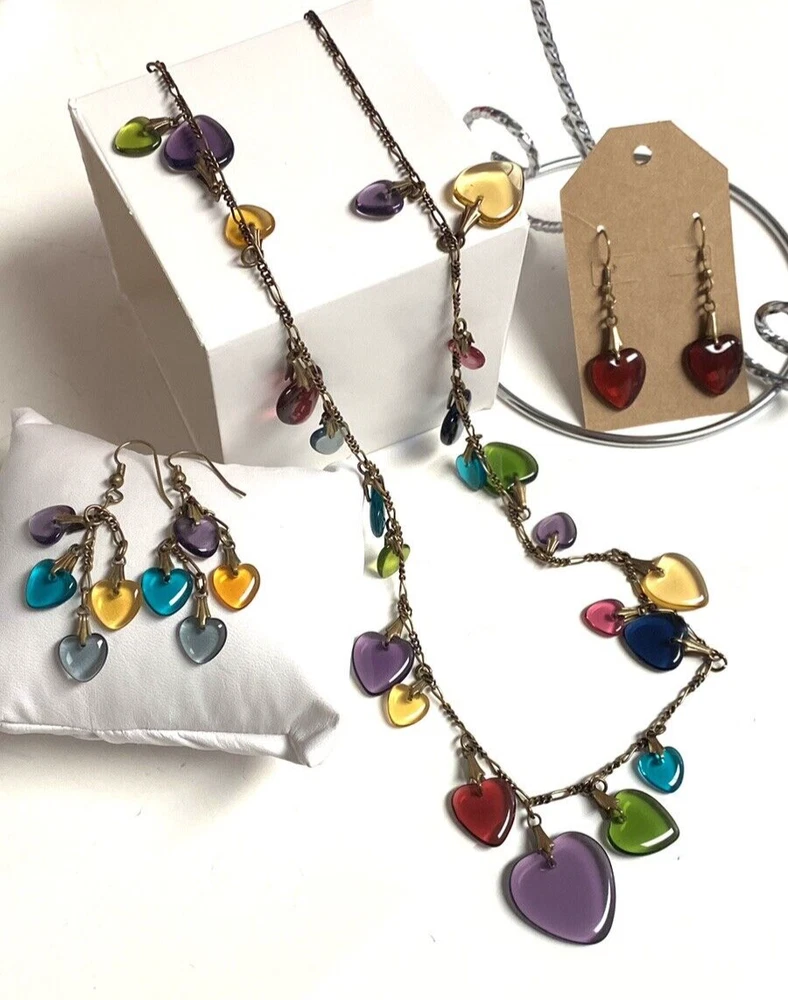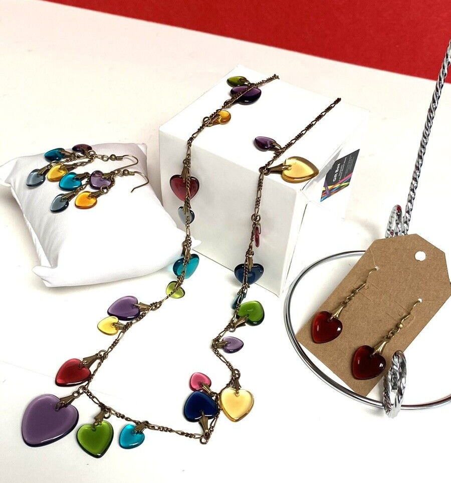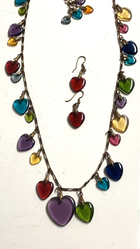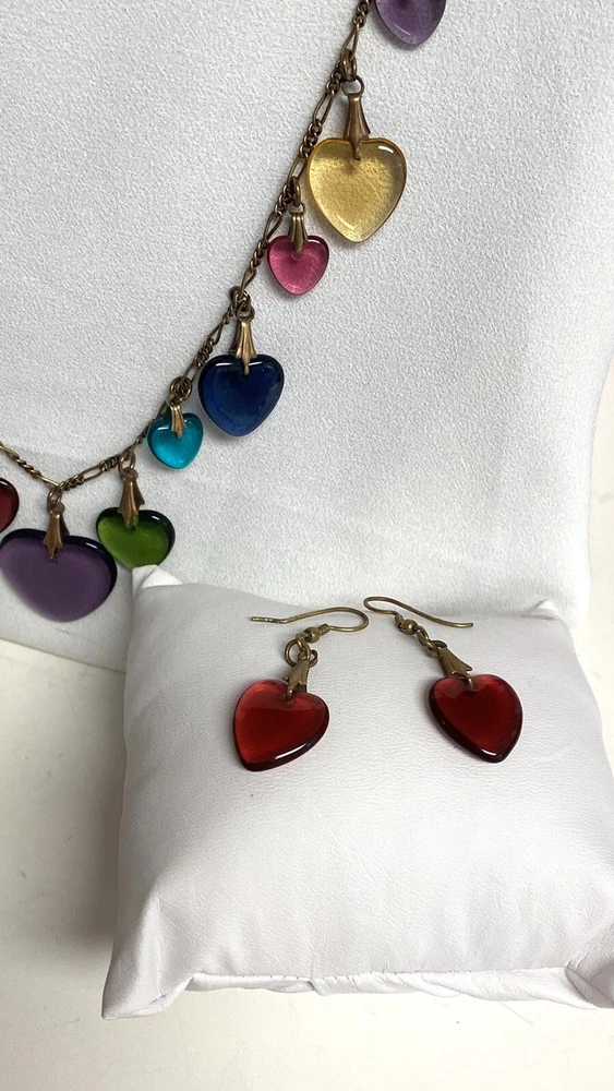 This vintage Glass Works Studio necklace and earring set is a stunning addition to any jewelry collection. The set includes a 30" long necklace with heart-shaped glass charms in multicolor and two pairs of matching earrings. The jewelry is made of brass and has a vintage and antique feel. The necklace and earrings are signed by the artist and have a unique and artistic design. The set is perfect for anyone who loves vintage jewelry or wants to add a touch of charm to their outfit. This set is a great gift for a loved one or for yourself. Your purchase will include a Necklace with 2 pairs of Matching pair of Earrings! It's Very RARE to fine Neckless with 2 pair of matching earrings! Thank you for shopping and supporting my small Business :)