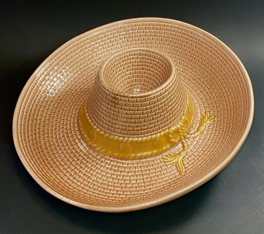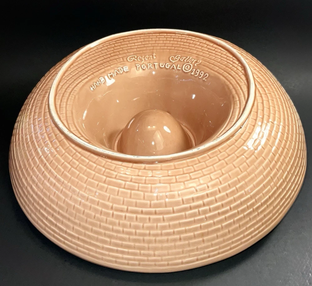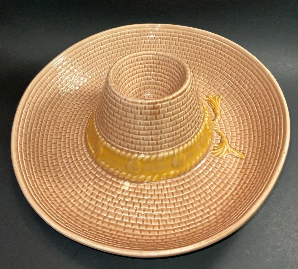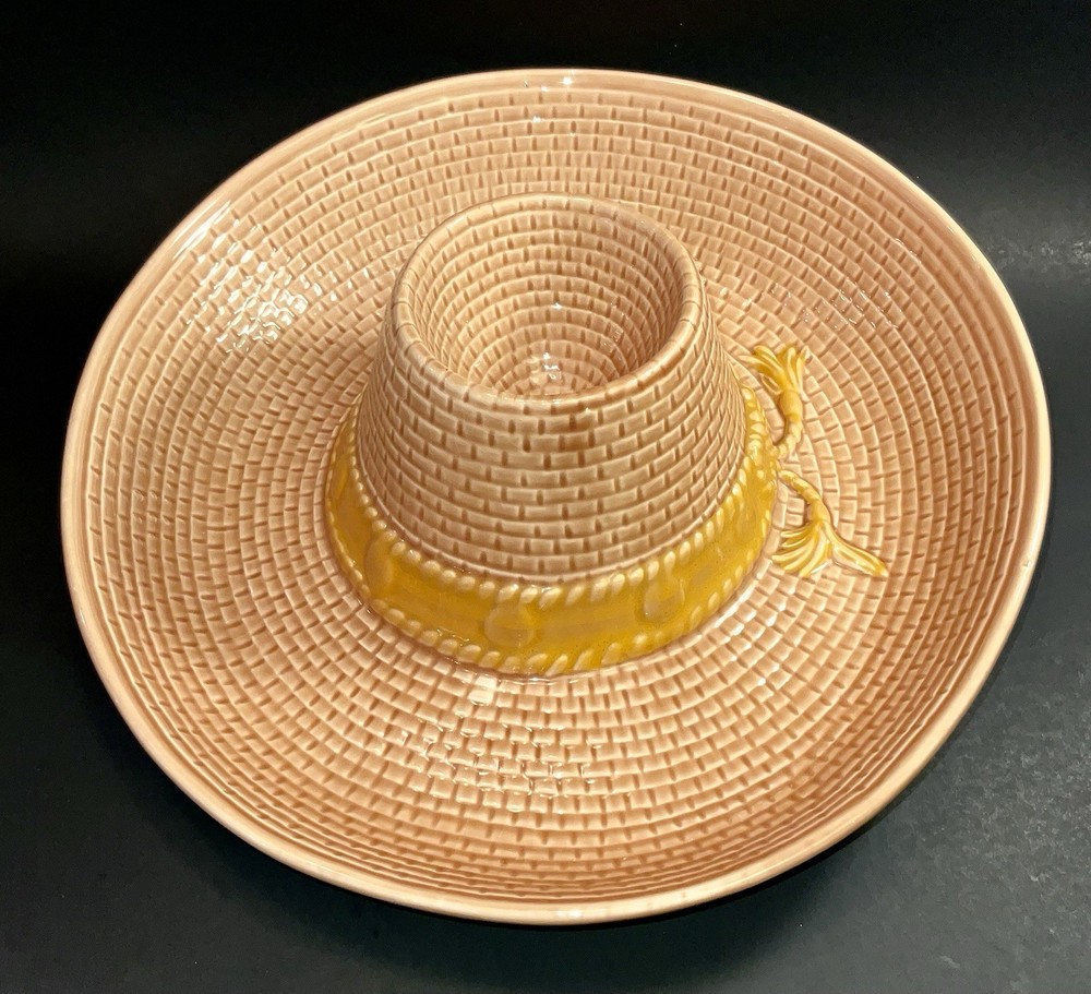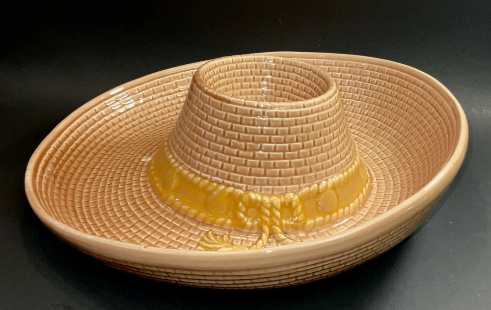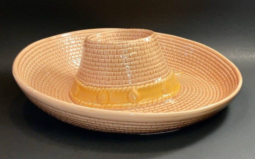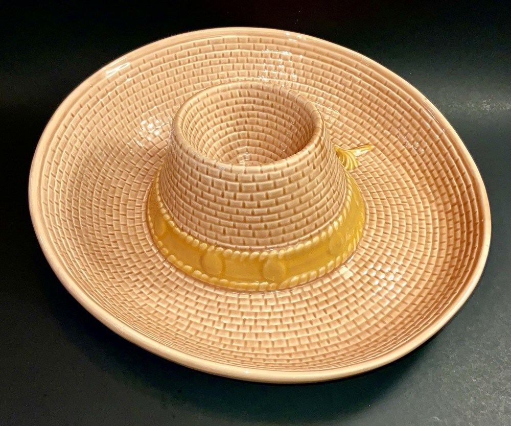 This unique and stylish chip and dip server bowl is perfect for any occasion, whether it's for Cinco de Mayo or just a regular night in with friends and family. The large, round bowl has two compartments, making it easy to serve your favorite snacks and dips. It's made of high-quality ceramic material and has a glossy finish, giving it a contemporary look that will complement any kitchen or dining room decor. The bowl is dishwasher safe and weighs 4nlbs, making it sturdy and durable. It's 14 inches in diameter and 13 inches deep, providing ample space for all of your snacks and dips. The bowl is handmade in Portugal and features a Mexican theme, making it a great addition to any party or celebration. Excellent condition.