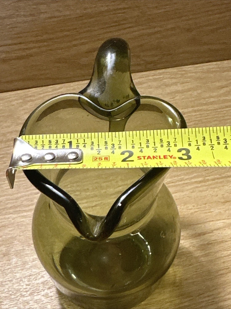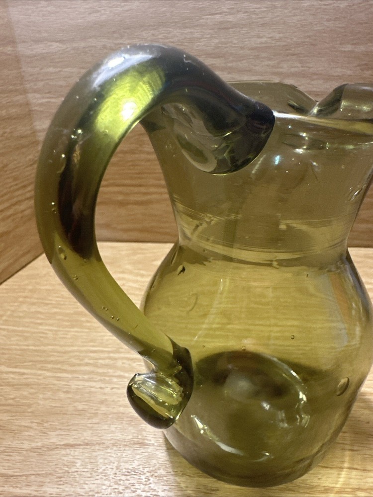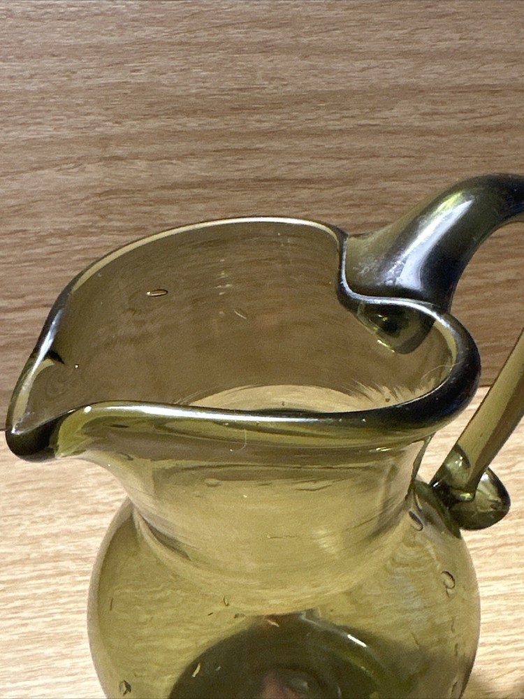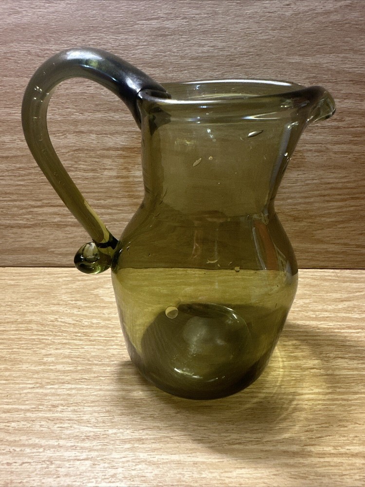 This vintage avocado green blown glass pitcher vase is a unique addition to any collection. The applied handle and air bubble design make it unique. There are quite a few air bubbles. The pitcher is perfect for use in the kitchen as a vase or as a decorative piece. Its studio theme and art glass production style make it a great conversation starter. This item is a vintage original and is made of high-quality glass material and used for shelf display. Gently owned with no breaks or chips. 3” opening. 5.25” tall and 5” wide with handle. A16