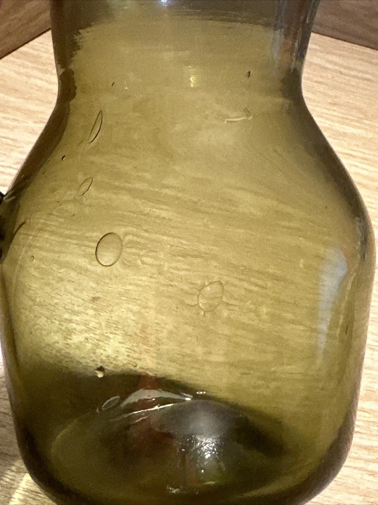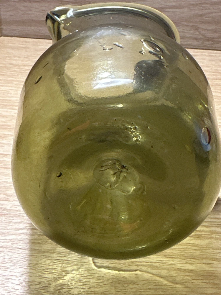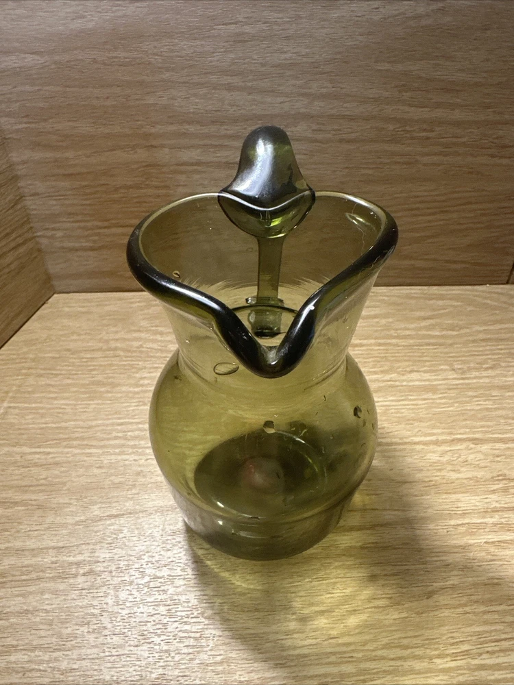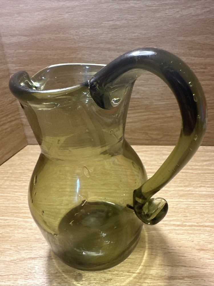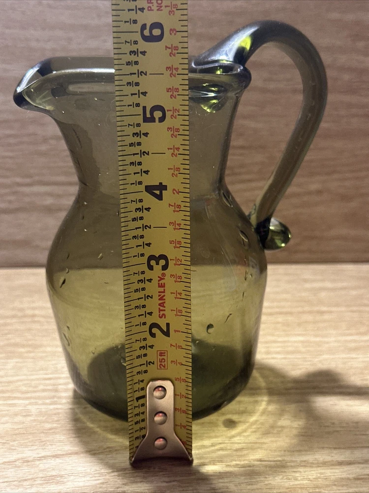 This vintage avocado green blown glass pitcher vase is a unique addition to any collection. The applied handle and air bubble design make it unique. There are quite a few air bubbles. The pitcher is perfect for use in the kitchen as a vase or as a decorative piece. Its studio theme and art glass production style make it a great conversation starter. This item is a vintage original and is made of high-quality glass material and used for shelf display. Gently owned with no breaks or chips. 3” opening. 5.25” tall and 5” wide with handle. A16