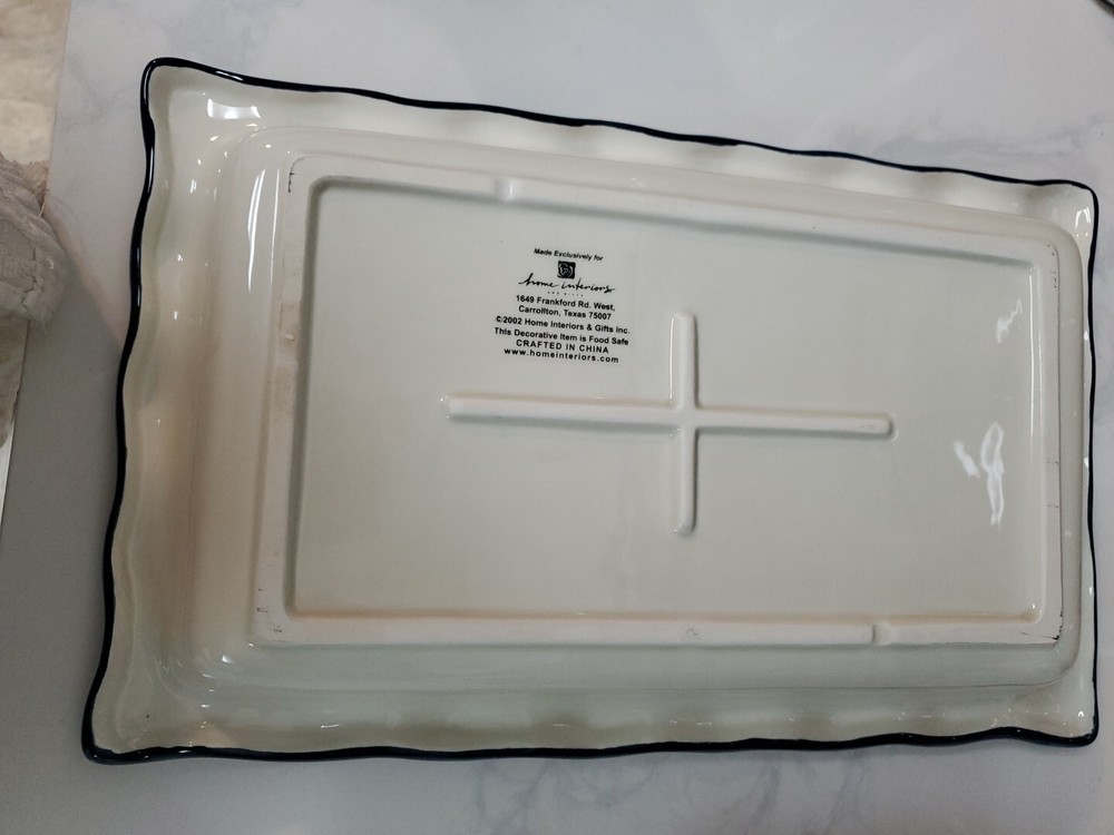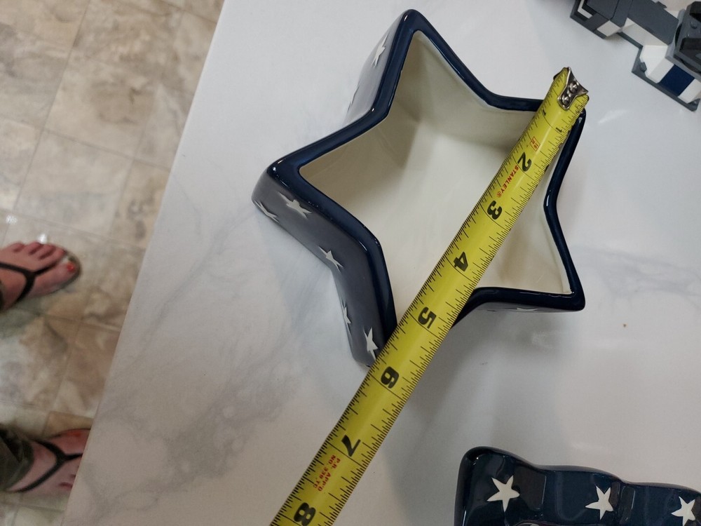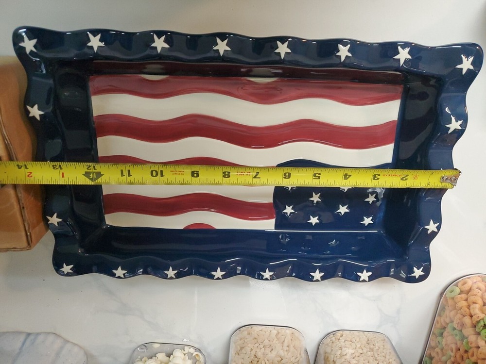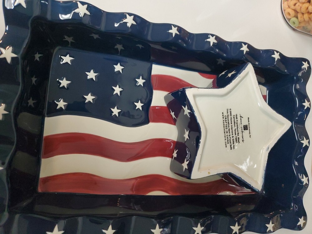 This vintage serving tray set from Home Interiors is the perfect addition to any patriotic gathering. The set includes a large rectangular tray with two compartments, perfect for serving chips and dip or other small appetizers. The glossy finish and multicolor American flag pattern make it a festive and fun addition to any table setting. Crafted from durable ceramic material, this serving tray set is dishwasher safe for easy cleaning and maintenance. Its timeless design and high-quality construction make it a great choice for any kitchen or dining room. Whether you're hosting a party or just looking for a fun and unique piece of servingware, this American flag patriotic set is sure to impress.