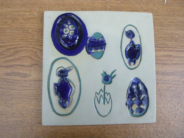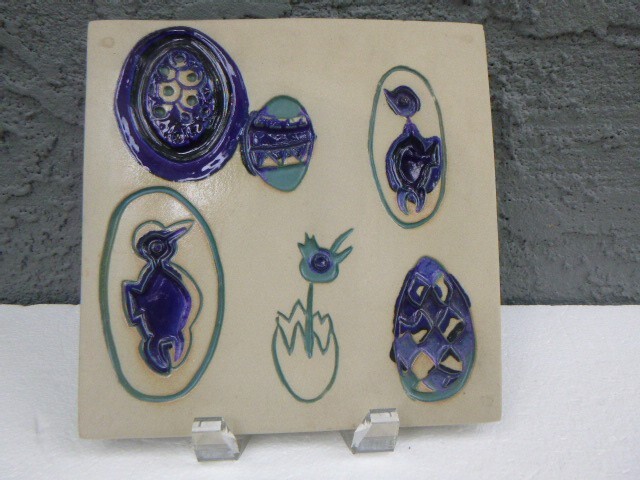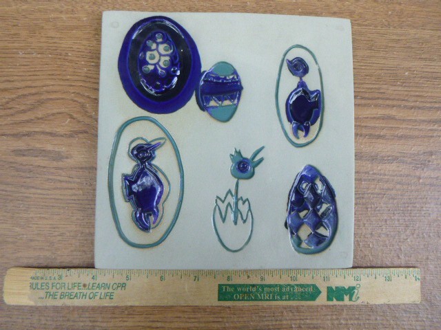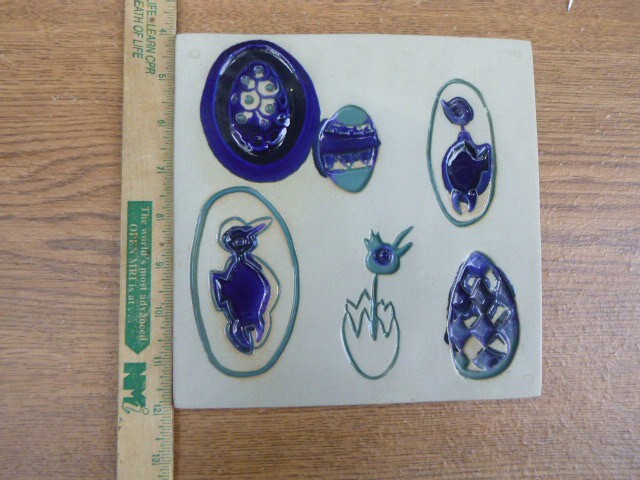 signed Bennington pottery art studio wall plaque tile in Cobalt Blue and Green 8'' x 8''...