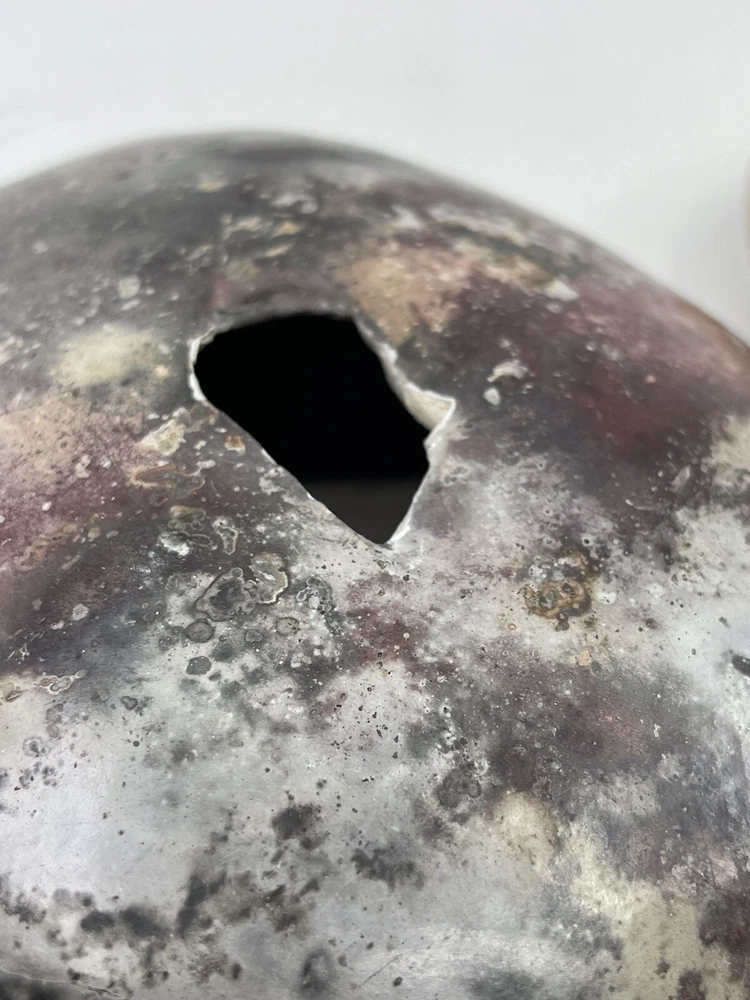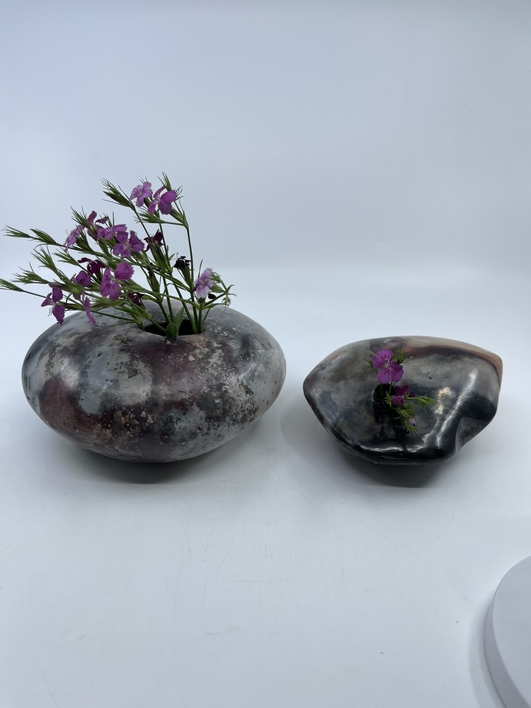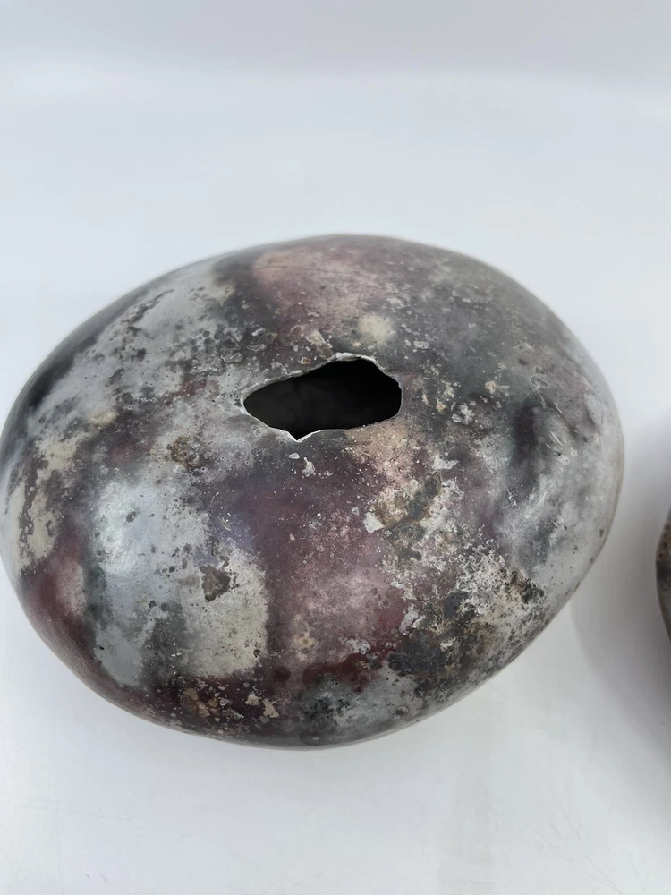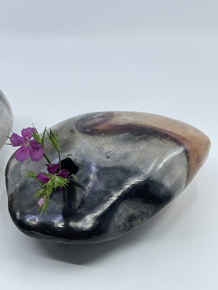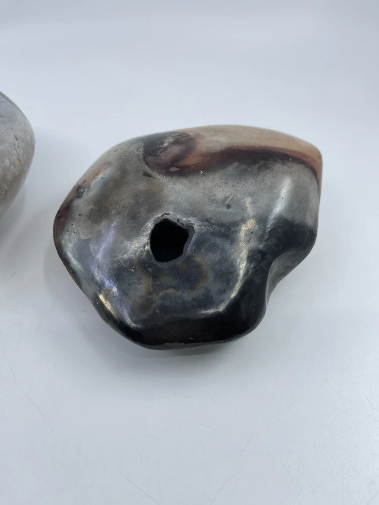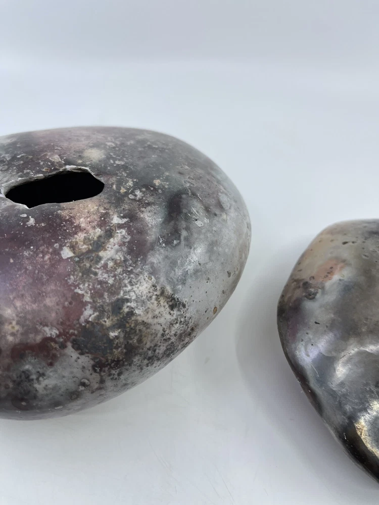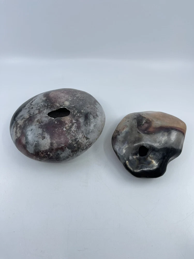 These are absolutely so unusual beautifully made the larger one. The hole is a little bit rougher. I don’t know if that was naturally that way, but it seems fine. Please look up clothes. It could be a little chipped, but I don’t think so. The glaze on these is amazing. It does look like River rock in the water, you can put water or dried flowers, sunny, or by themselves selling as is as a lot