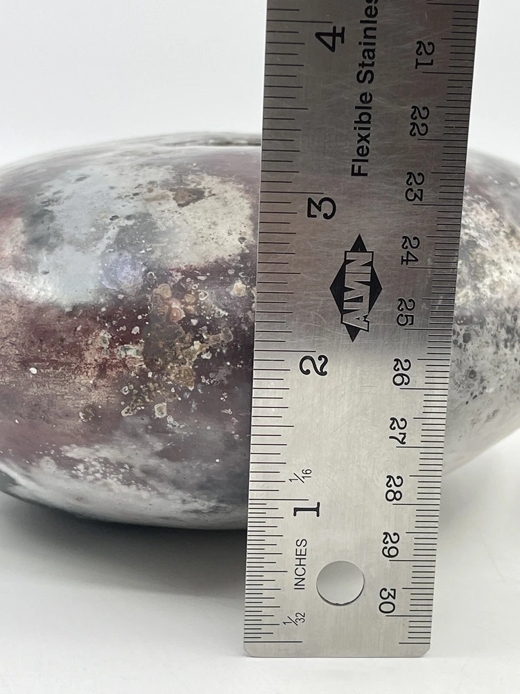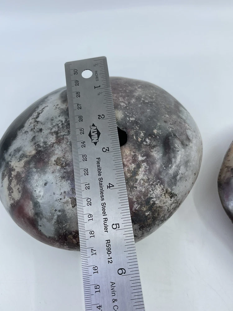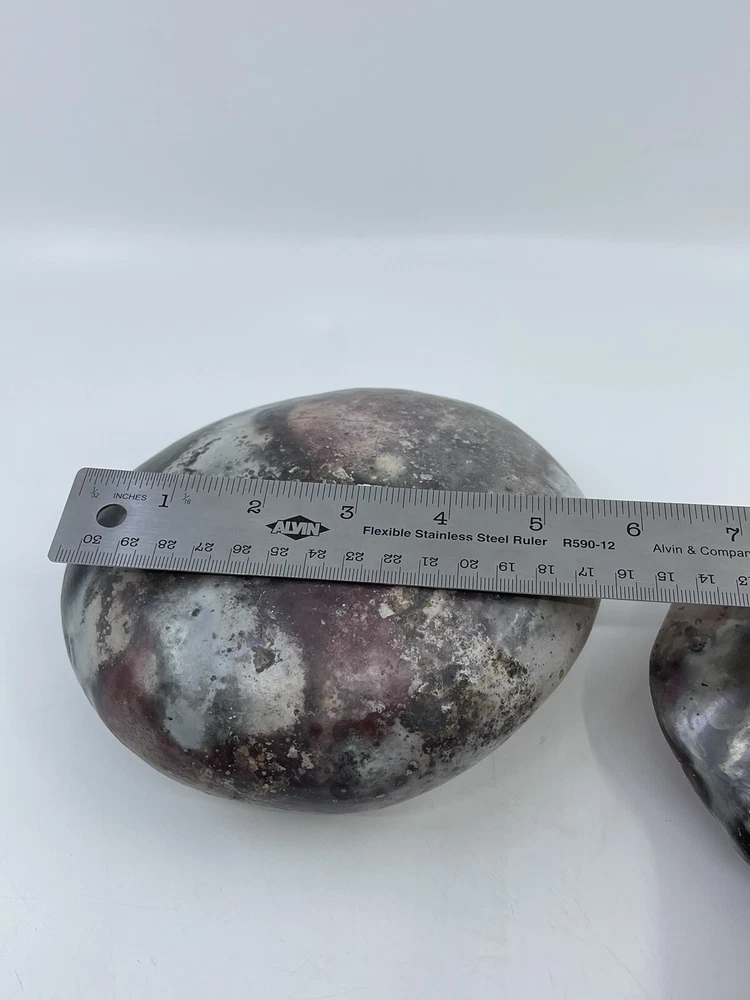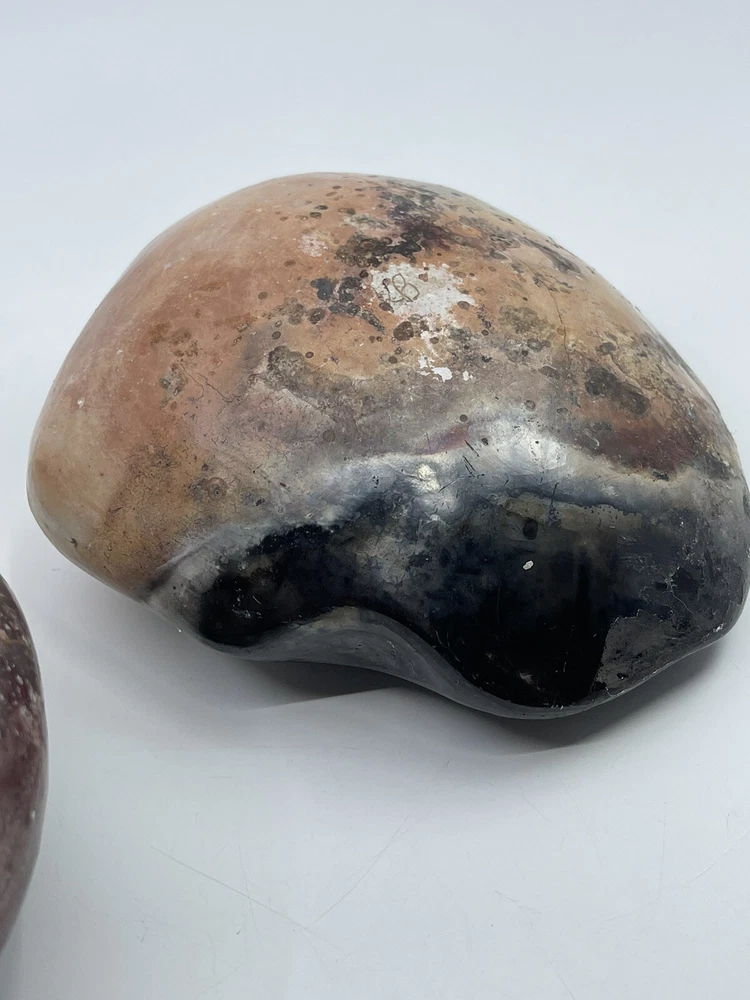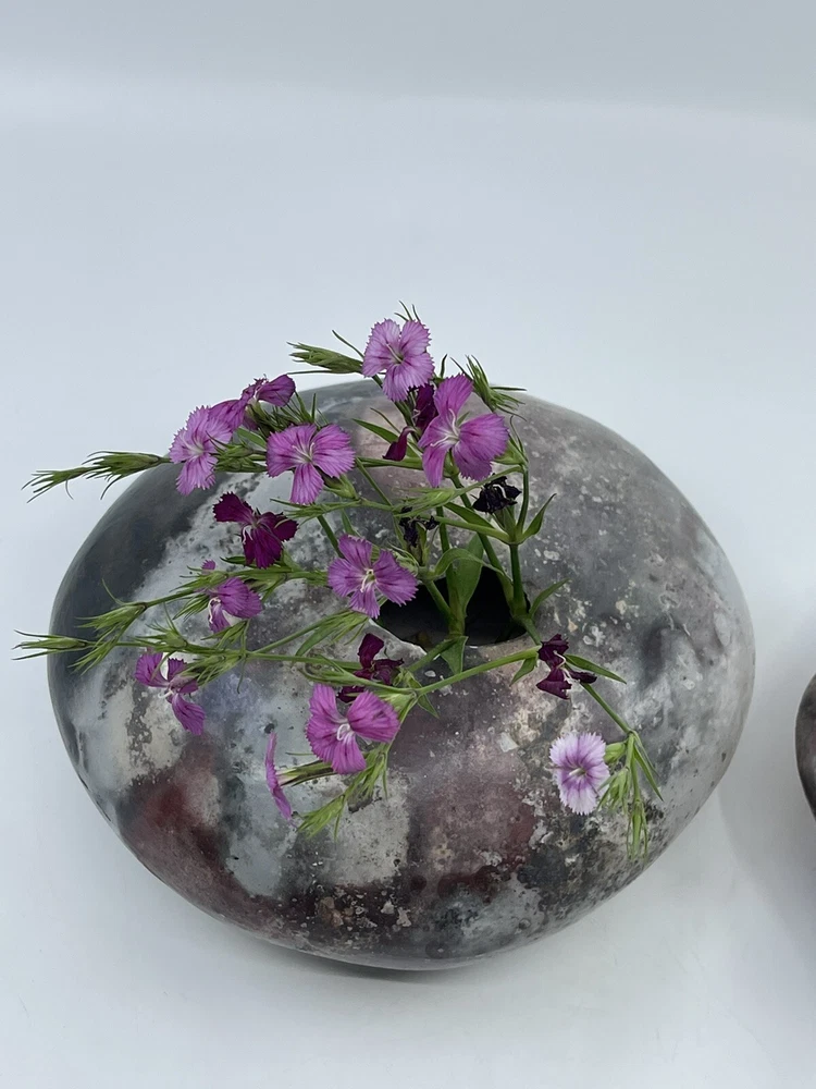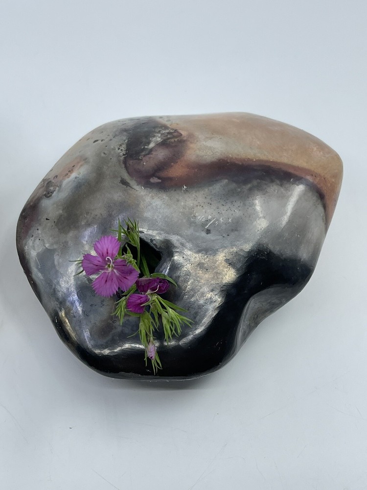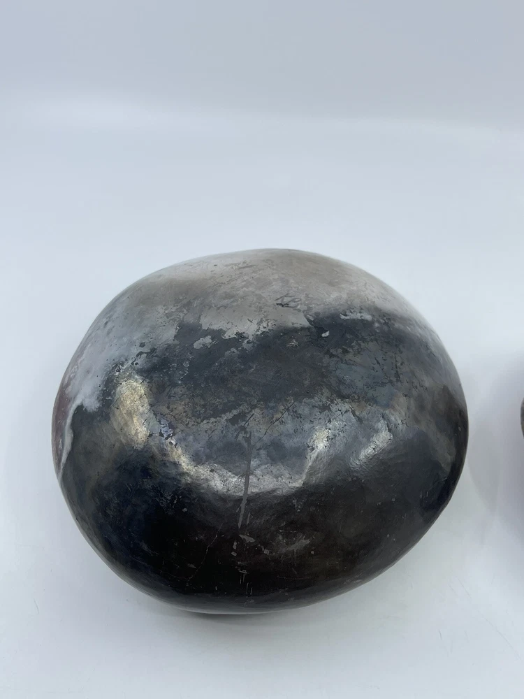 These are absolutely so unusual beautifully made the larger one. The hole is a little bit rougher. I don’t know if that was naturally that way, but it seems fine. Please look up clothes. It could be a little chipped, but I don’t think so. The glaze on these is amazing. It does look like River rock in the water, you can put water or dried flowers, sunny, or by themselves selling as is as a lot