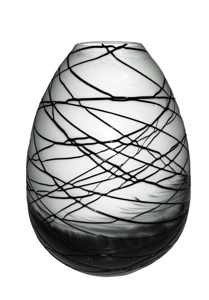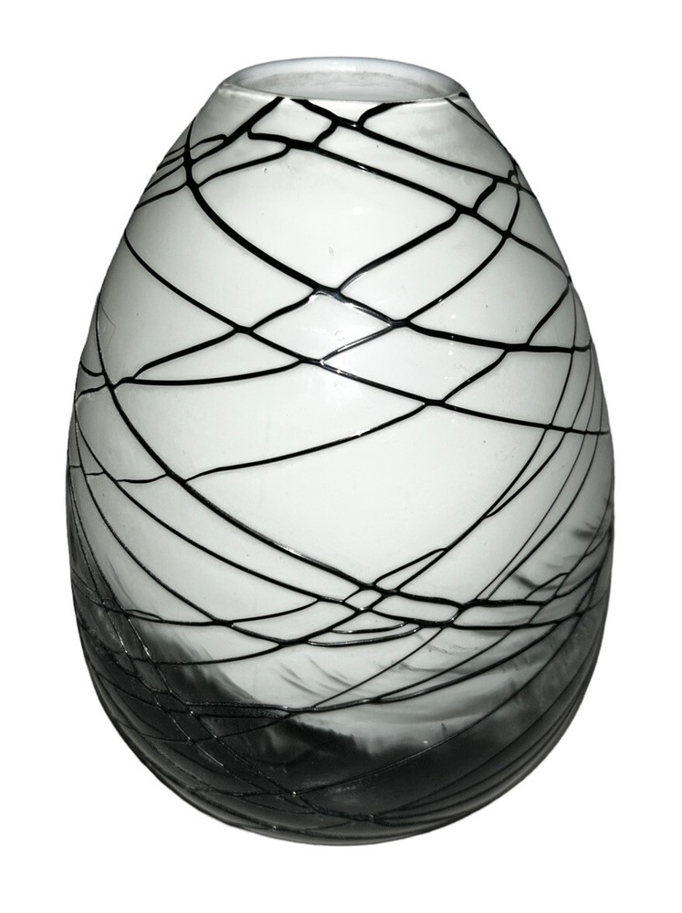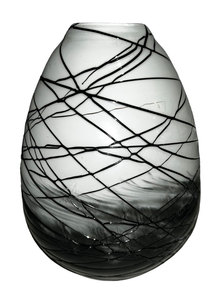 VTG MCM Italian Murano Glass Threaded Art Deco Studio Black White Gray Egg Shape Abstract Vase 8-3/4”H EUC...