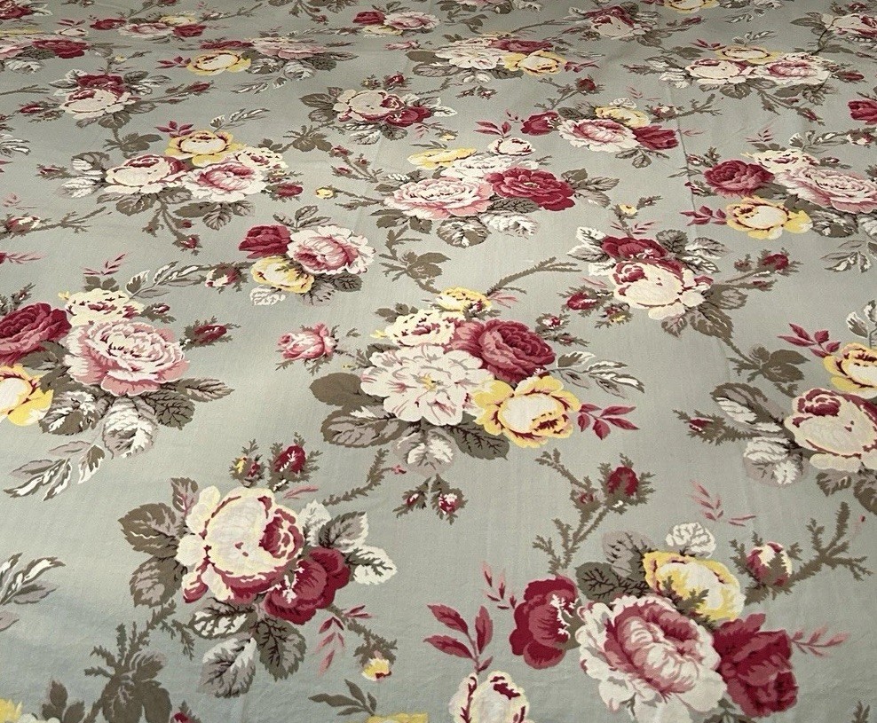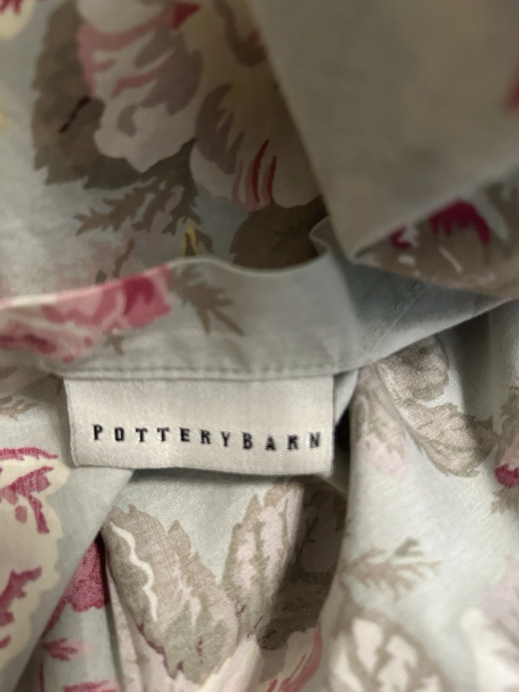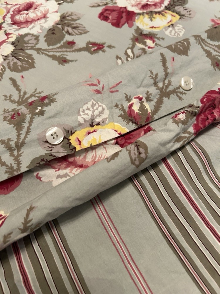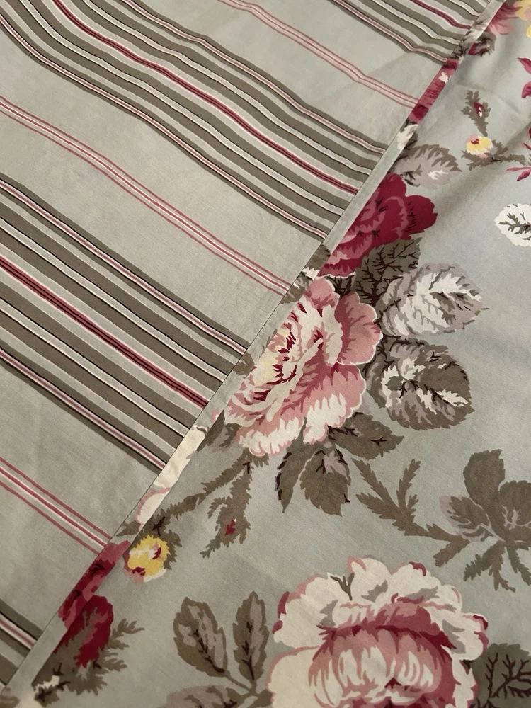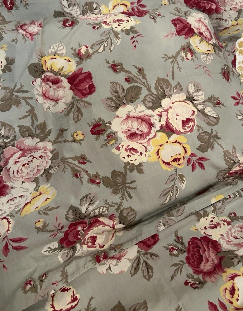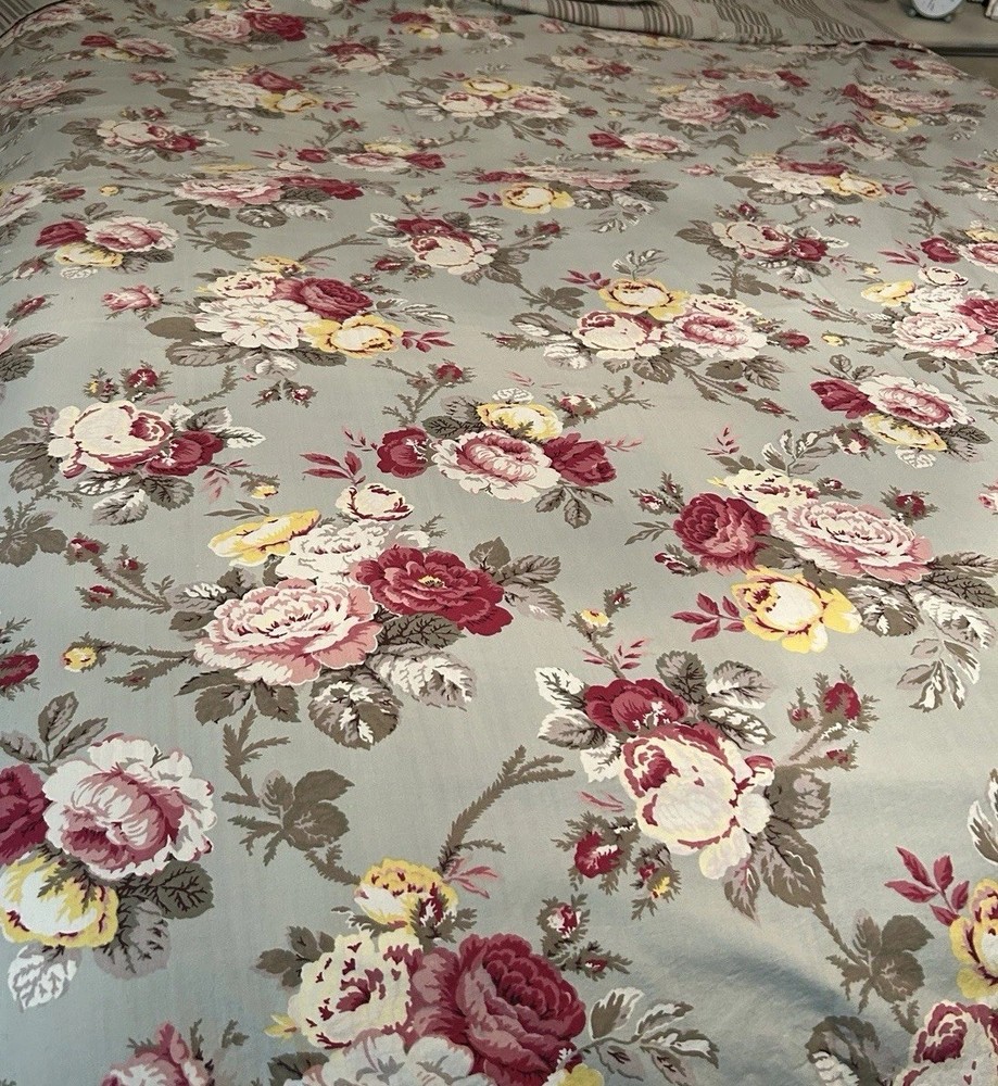 Vintage Pottery Barn Reversible Roses and stripes Queen duvet On one side the perfect blend of cottage roses in red, yellow, and cream with a soft blue greenish backdrop with the reverse side in coordinating stripes. Measurements : 84" x 83" Button enclosure. **Also included is 1 standard Pillow Sham (which is not reversible),florals on both sides. They are both in great condition with no rip or stains. The colors are still vibrant. Please see pictures for more details.