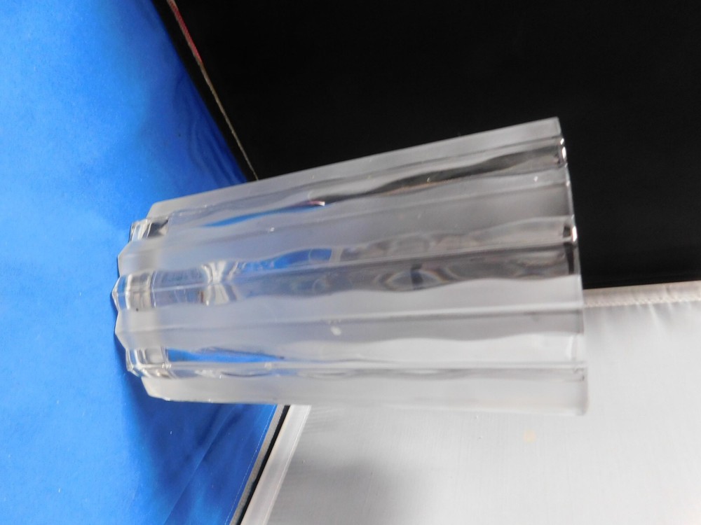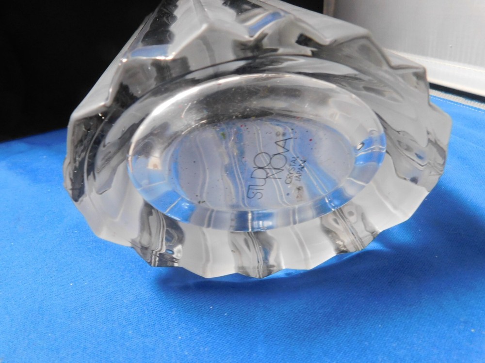 Elevate your space with the timeless elegance of this Studio Nova glass vase. Crafted with a keen eye for detail, the frosted crystal clear glass vase boasts a sophisticated wave pattern, adding a touch of maritime charm to your decor. Its square subject matter and art glass production style speak to its unique and artistic origins, making it a standout piece for any collector or interior designer. Measuring at 8 inches in height, this vase is versatile enough for a prominent display on a mantel or as a subtle accent on a bookshelf. The studio-crafted technique ensures that each piece is one-of-a-kind, with its own patterns and nuances that reflect the artisan's hand and the material's natural beauty.