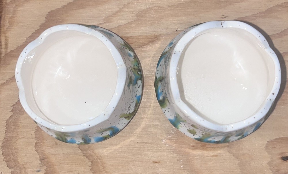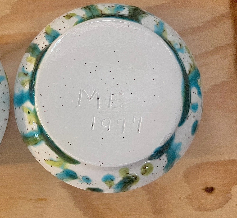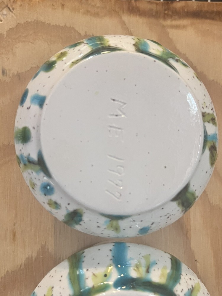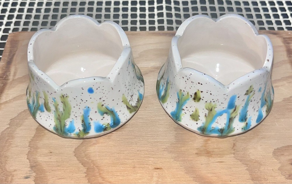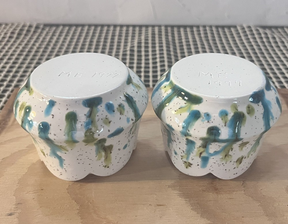 Add a touch of art to your home decor with this vintage set of two studio art pottery candle holders. These holders feature a unique tulip shape and are made of high-quality ceramic material with a glossy finish. The abstract multicolor pattern adds a whimsical and mystical touch to any room, making them suitable for tea light and mini candles. The candle holders were handmade in the United States in the 1980s using the art pottery production technique. They are signed and incised with a backstamp, making them an original piece of art. These decorative candle holders are perfect for any art lover or Zen enthusiast and will add a touch of color and texture to any room.