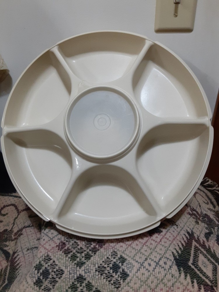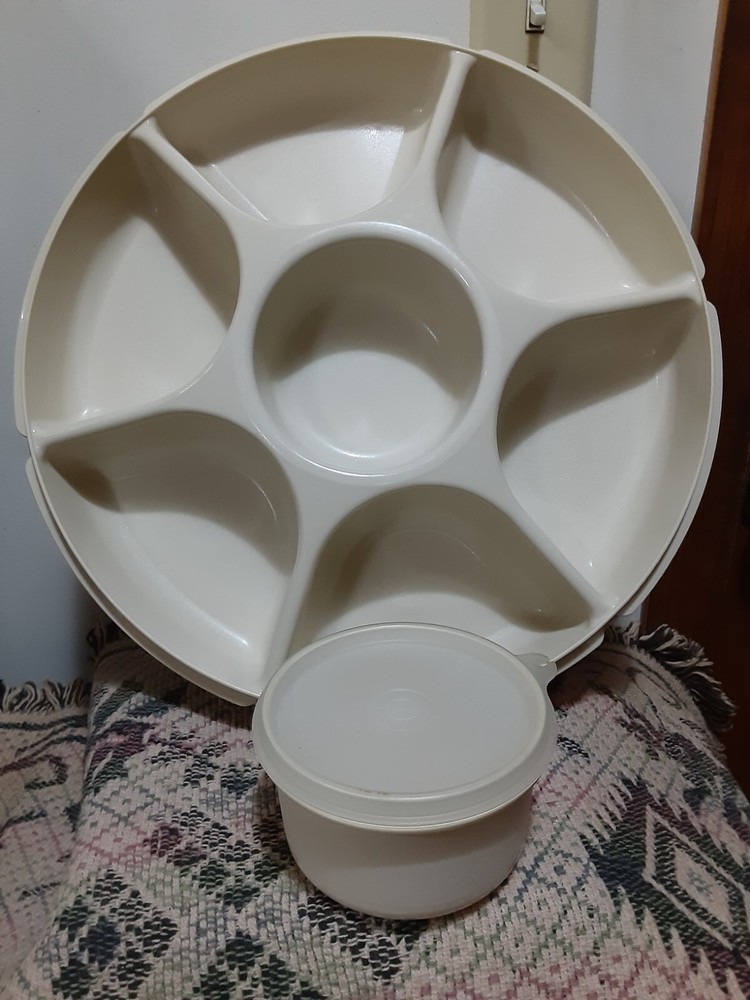 UP FOR SALE IS THIS VERY NICE VINTAGE TUPPERWARE VEGGIE AND DIP TRAY. THE VEGGIE TRAY AND THE DIP CONTAINER COME WITH LIDS. ALL IN GREAT PRE-OWNED CONDITION. I ONLY SHIP TO AN ACTUAL ADDRESS, NO P. O. BOXES OF ANY TYPE. ALL MY ITEMS COME FROM ESTATE SALES AND AUCTIONS. IF YOU ARE SENSITIVE TO SMELLS OR PETS, PLEASE THINK BEFORE YOU BID ON MY ITEMS. I DO NOT KNOW WHAT TYPE OF HOME THEY COME FROM.