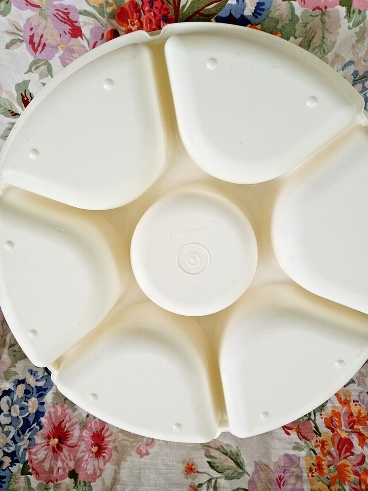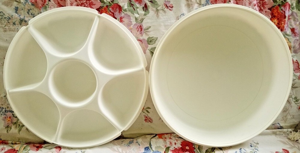 VTG TUPPERWARE DIVIDED VEGETABLE RELISH CHIP & DIP SERVING TRAY W/DIP BOWL & LID. Excellent pre-owned condition. No utensil marks. Thank you for looking!