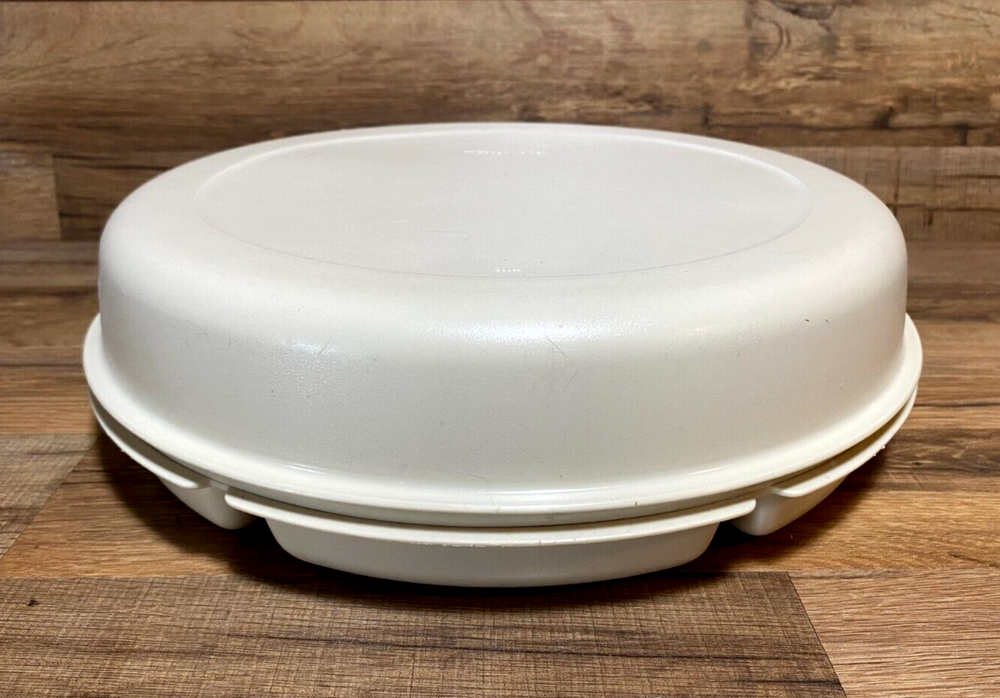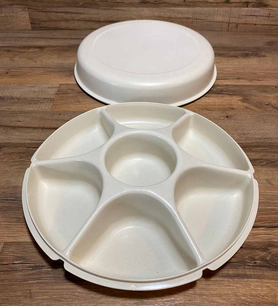 VTG. TUPPERWARE - LARGE 14" DIVIDED SERVING TRAY- VEGGIE FRUIT CHIPS DIP - 1666 USED - CLEAN - NO ISSUES - VERY GOOD USED CONDITION - SEE PICTURES This vintage Tupperware set includes a large 14" divided serving tray with a snap lid, perfect for serving vegetables, fruit, chips, or dip. The round tray is in an almond color and made of plastic, featuring a vintage/retro style. It has a capacity for quite a bit of food and is ideal for food storage and organization in the kitchen. SEE WHATS ON SALE - VISIT OUR EBAY STORE SEE OUR OTHER LISTING - SAVE $$$ ON COMBINED SHIPPING CORELLE - CORNING WARE - PYREX - PFALTZGRAFF - IKEA - SANGO - HOME TRENDS - TUPPERWARE