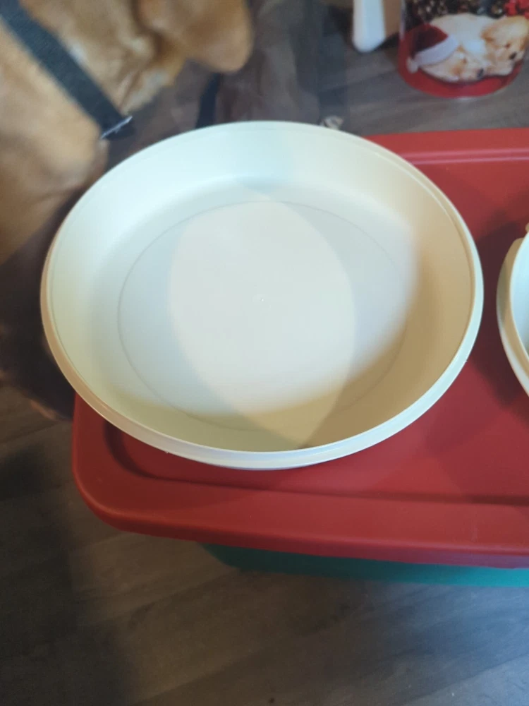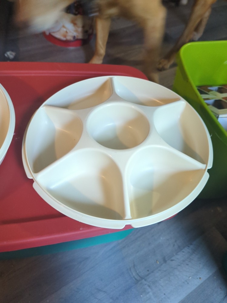 This vintage Tupperware tray and lid set is perfect for your next party or gathering. With seven slots and a snap-on lid, it's great for organizing and serving veggies, fruit, dips, and snacks. The large 13 inch size and round shape make it a stylish addition to any kitchen or dining room. Made of durable plastic, this original Tupperware tray and lid set is easy to clean and will last for years to come. The almond color and classic design add a touch of nostalgia to your serving ware collection. This set includes a tray with 7 compartments, an insert, and a snap-on lid. Bring some vintage charm to your next party with this Tupperware set.