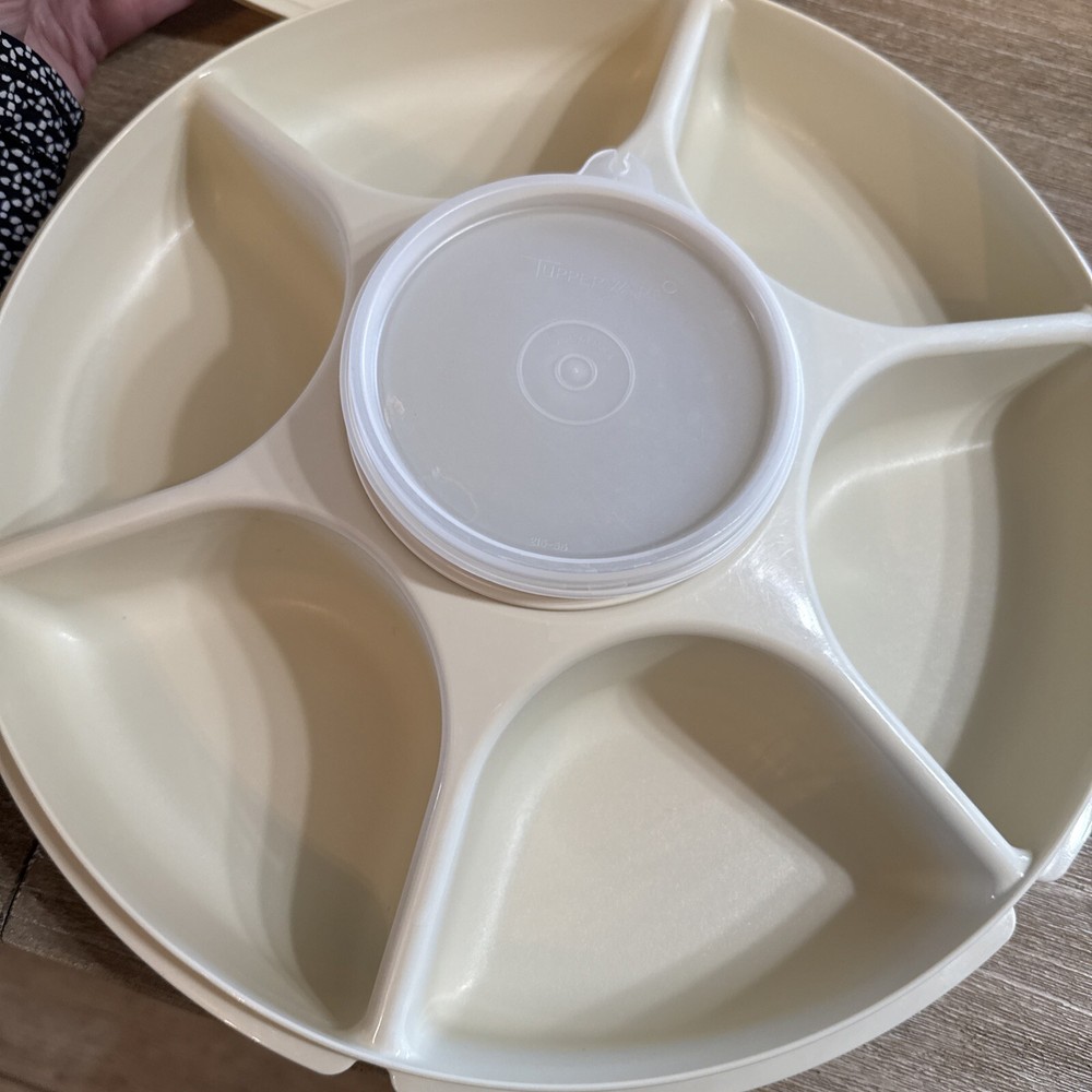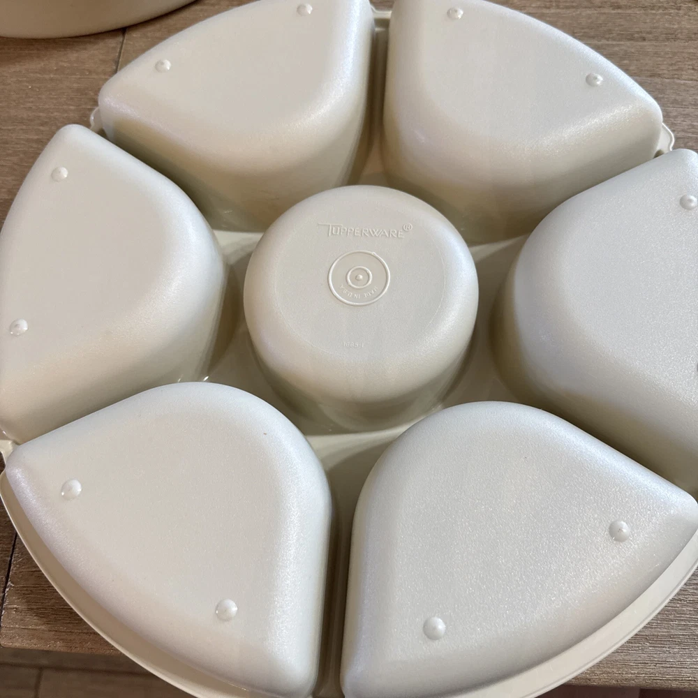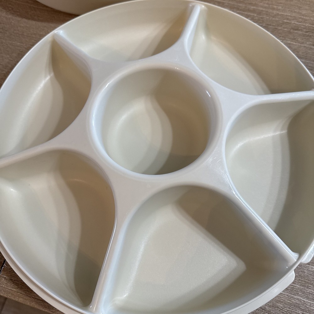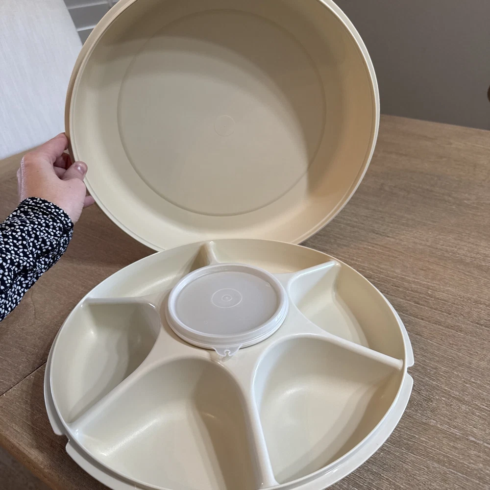 This vintage Tupperware set includes a large round tray divided into 7 compartments for serving veggies, fruits, dips, or snacks. It comes with a snap-on lid, making it ideal for parties. The item is made of plastic, easy to clean, and features a vintage design from the United States. With a size of 13 inches in length and width, this Tupperware set is a nostalgic and practical addition to any kitchen or home. Bowl is 1667-1. See photo for interior condition of bowl and for condition of the set.