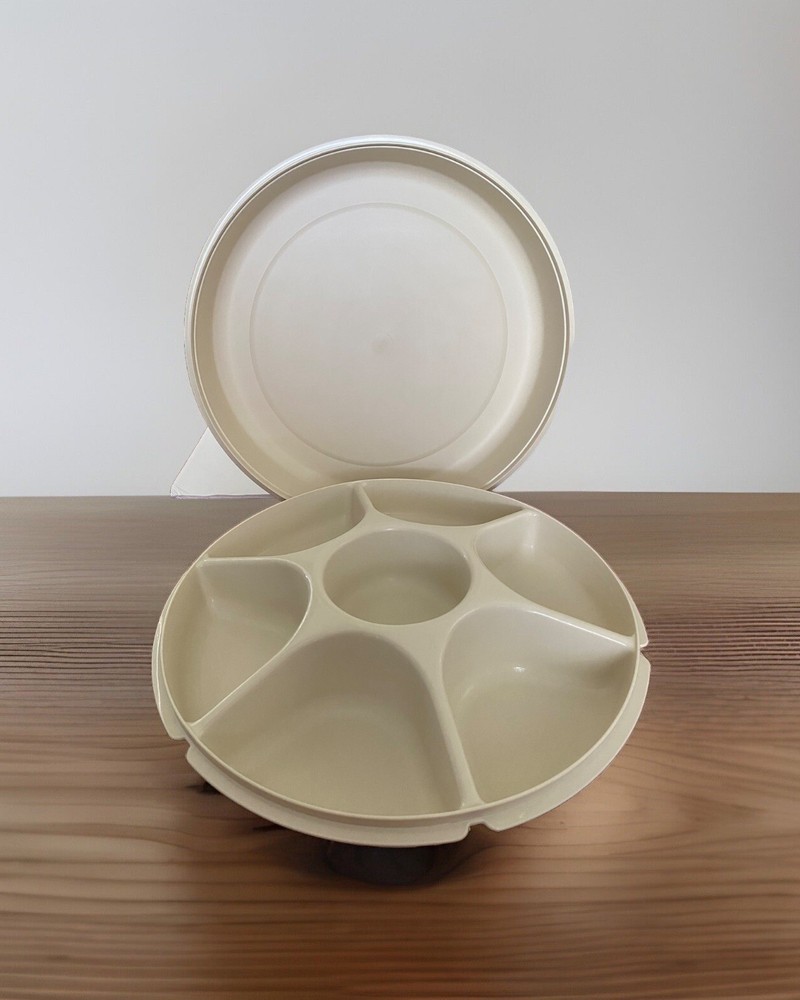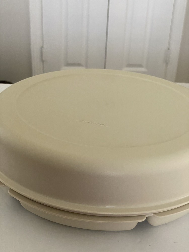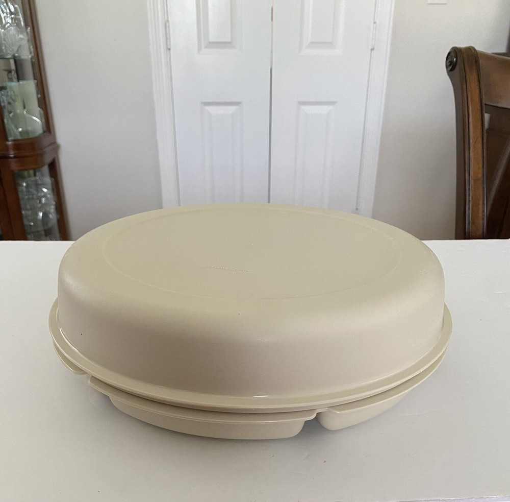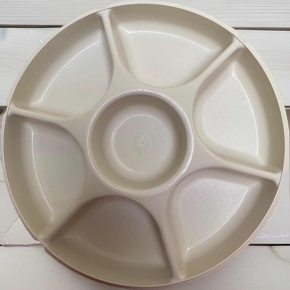 Vintage 1970’s Tupperware 13” Almond Divided Veggie Fruit Dip Snack Party Tray 1665-3 with Sealed Tight Lid 1666-1. No Center Bowl. Shows No Signs of Wear Excellent New Like Condition.
