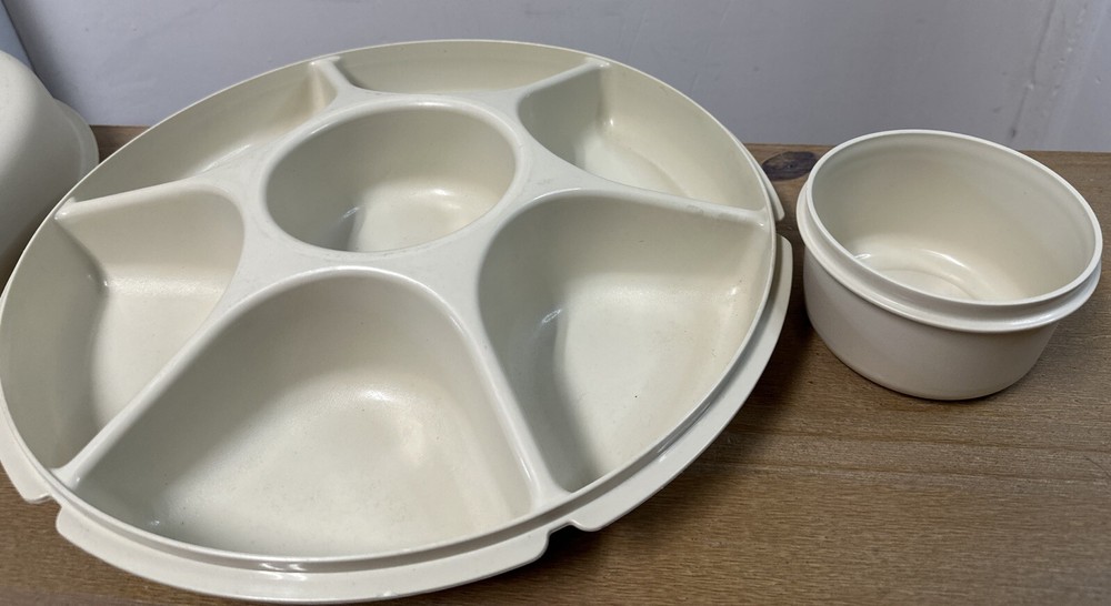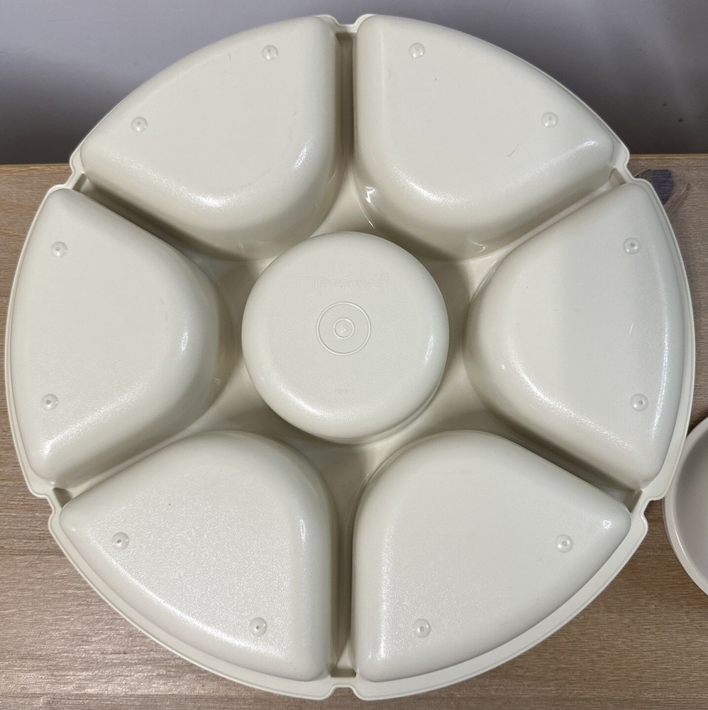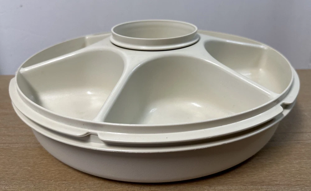 Awesome vintage Tupperware party tray with removable dip cup and lid. Lid sits perfectly under tray when not in use. Very good used condition.