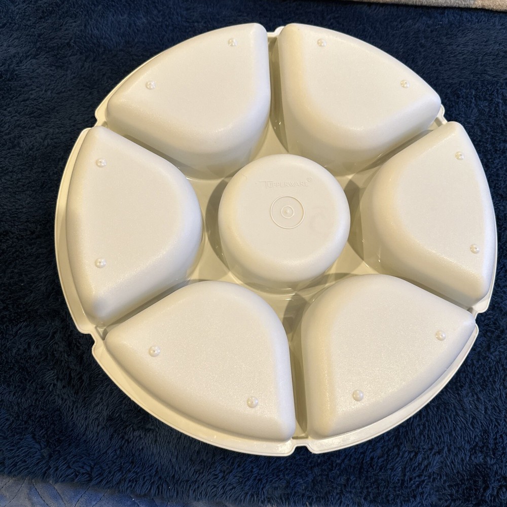 VTG Tupperware 13” Divided Veggie Fruit Dip Snack Party Tray PART # 1665- 1 INFO: Vintage preowned, still in good usable condition ! Didn’t notice any staining on it even with its prior use. This was hand-washed. Would make a great Tupperware replacement piece. Features six 2-cup/500 mL compartments and one 14-oz./400mL center bowl compartment 13 ½ x 3 ¾ "/34 x 9.5 cm