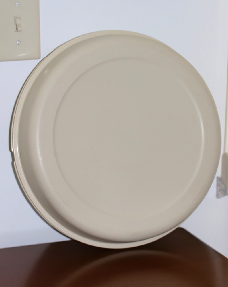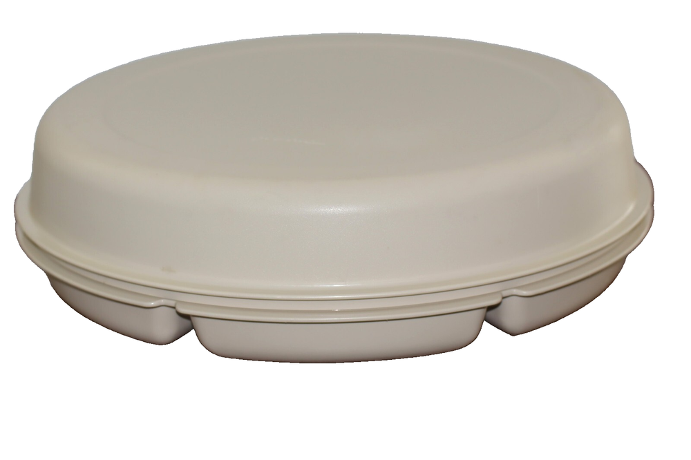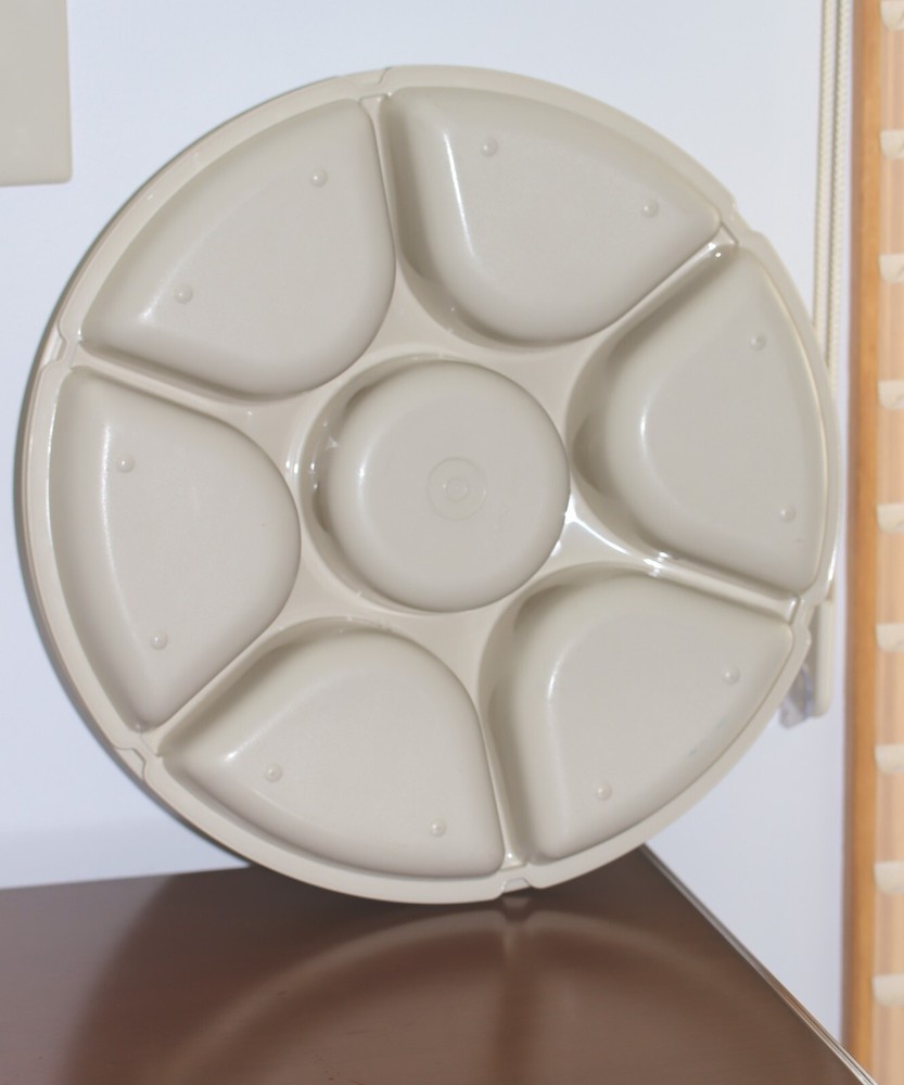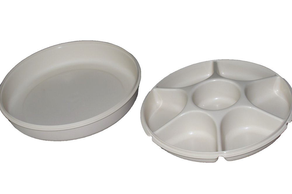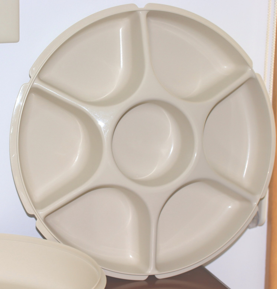 This vintage Tupperware tray is perfect for serving veggies, fruits, and dips at your next party or gathering. The tray has a large size of 14 inches in diameter and features a solid pattern in almond color. It has seven compartments, including a top and bottom, and is made of durable plastic material. The tray has a vintage and retro style with a food and kitchen theme. It is an original piece from the Tupperware franchise and has a squeeze-on lid type. The item length is 14 inches, and it has seven slots for serving different foods. This Tupperware tray is a must-have for any collector or anyone who loves vintage kitchenware. Tray-1665-3 Lid-1666-3-perfect for take a longs to picnics/gatherings-or family get togethers-7 generous compartments-can be used for veggies & dip or chips & dip or fruit tray or a snack tray or even a dessert tray-sold as is-final sale-no returns-pictures serve as part of my description.