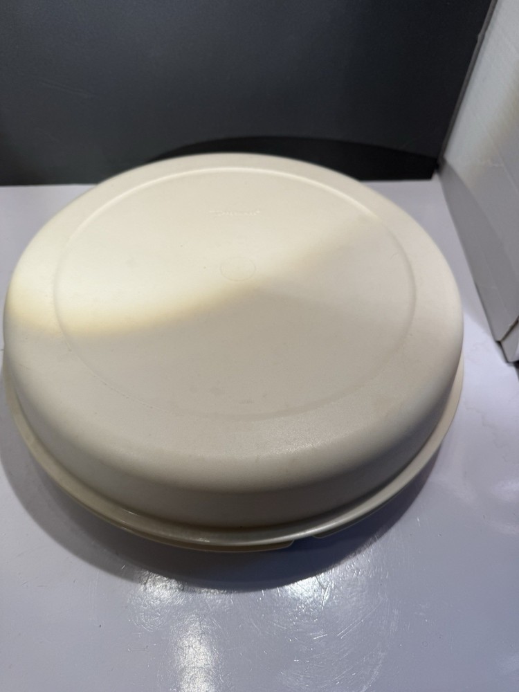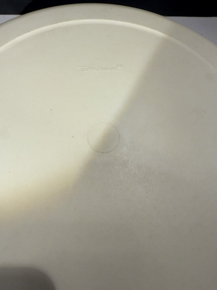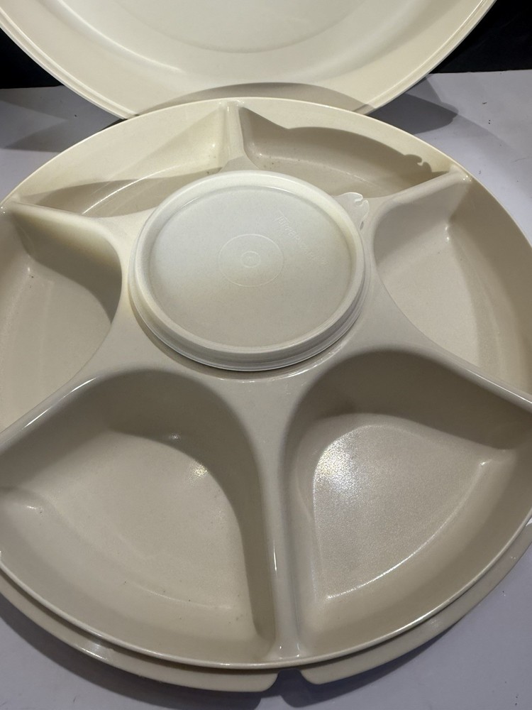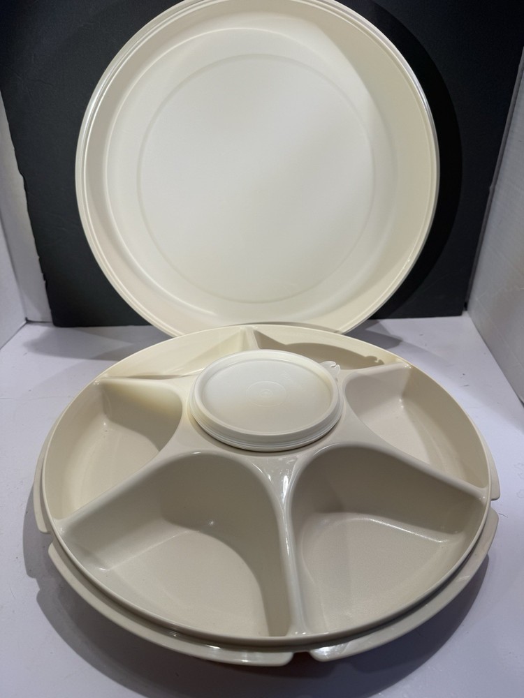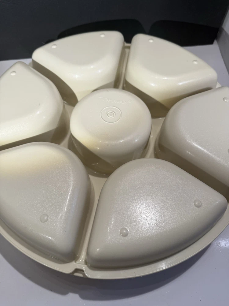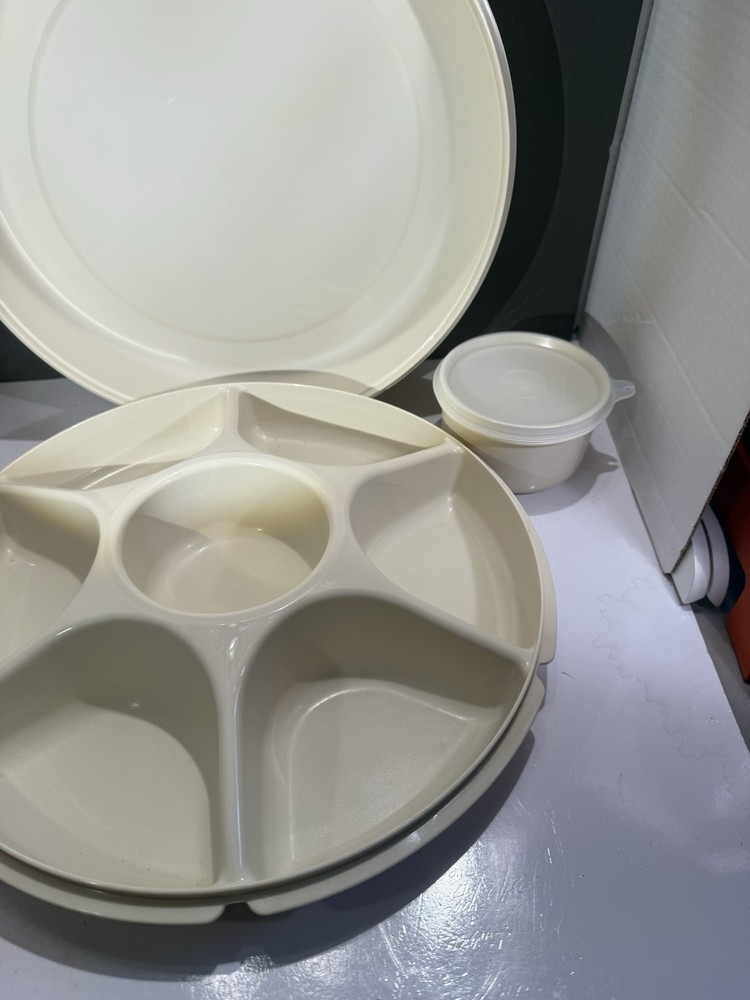 This vintage Tupperware divided serving tray and dip bowl with lids is a must-have for any collector or kitchen enthusiast. The tray is made of durable plastic and features seven compartments, making it perfect for serving a variety of snacks or appetizers. The dip bowl is also included, along with its own lid, for added convenience. The tray and bowl are both almond in color and have a retro/vintage style, adding a touch of charm to any kitchen or dining room. This set includes four items in total, and is an original licensed reproduction from Tupperware. The tray measures 13 inches in length and width, and stands 4 inches tall. Don't miss out on adding this unique and functional vintage Tupperware set to your collection!