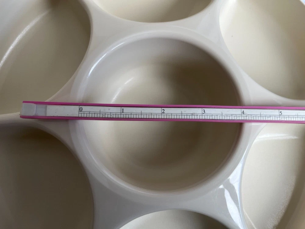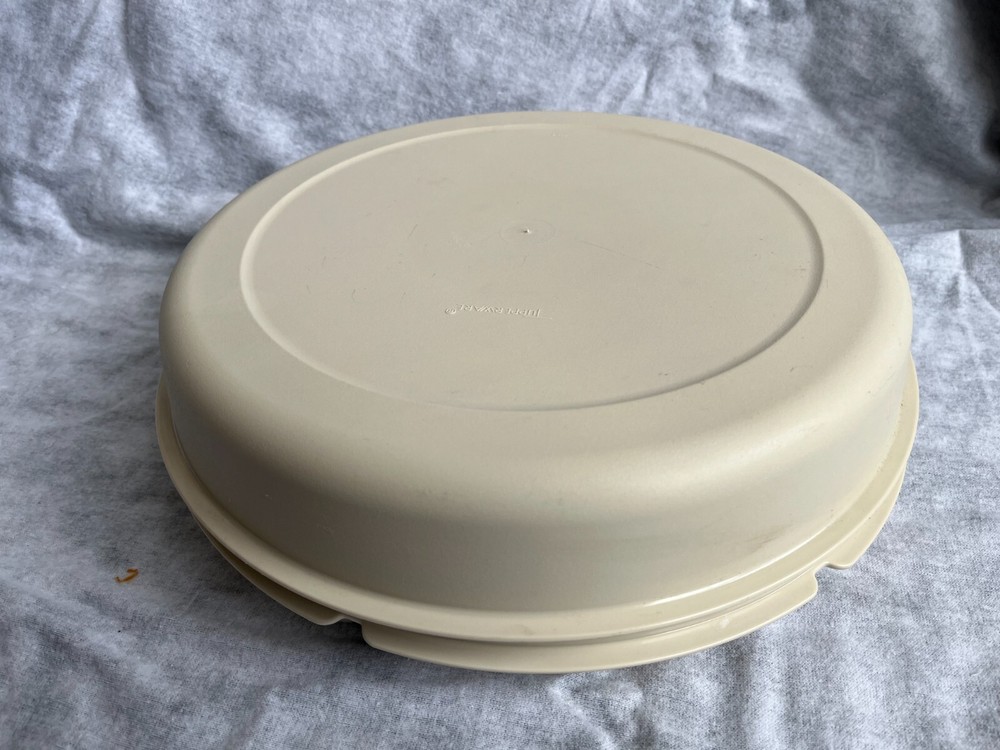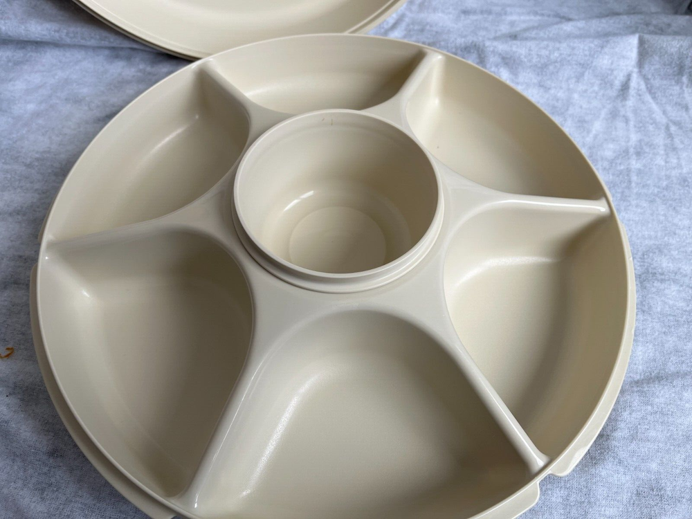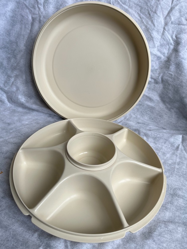 This is a vintage Tuppeware veggie/fruit divided trap with a center slot for dip (insert cup included). Center dip hole is approx. 4" in diameter. Overall unit is apprx. 13" in diameter. I tend to ship fast, so please ask any questions before you purchase. Thank you and happy ebaying!