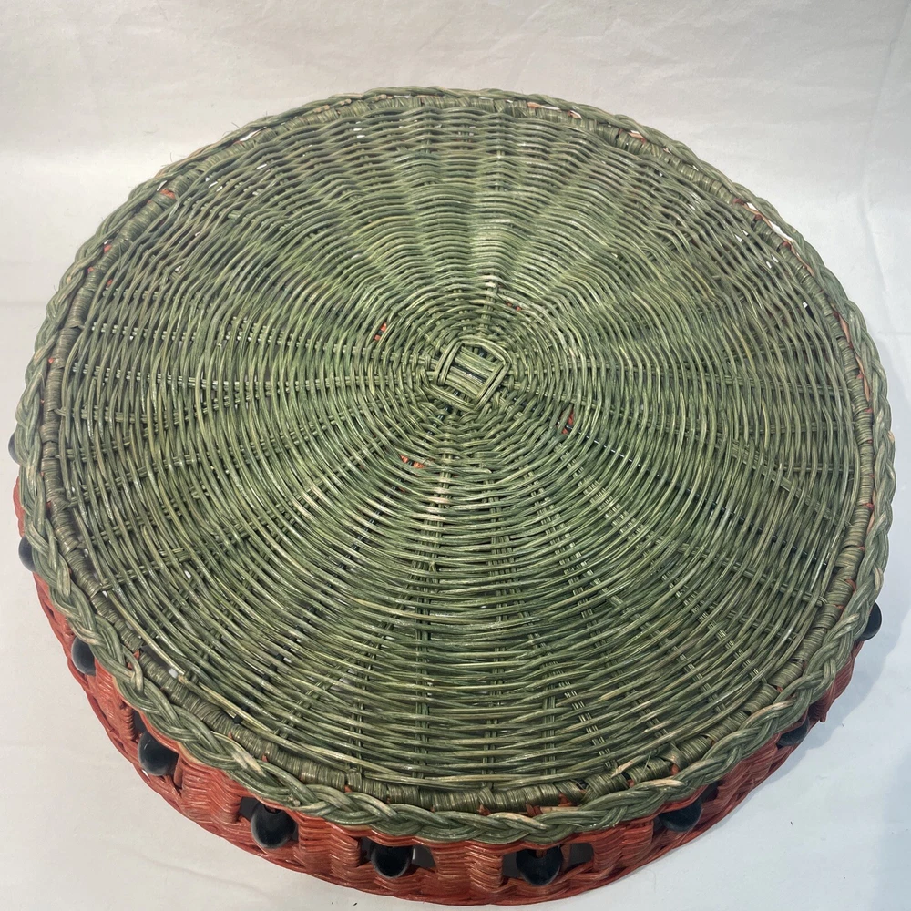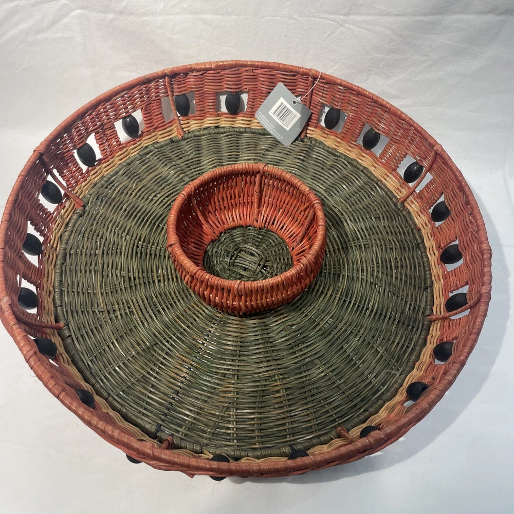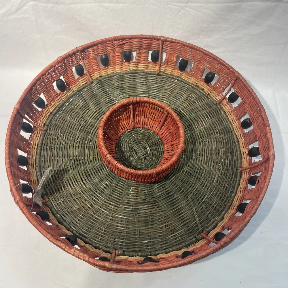 This vintage serving tray is perfect for any occasion, whether it's a bachelorette party or just a casual get-together with friends. The round watermelon pattern adds a touch of fun and whimsy to your table setting, while the sturdy wicker material ensures that it will last for many years to come. With two compartments and a large size of 15 inches in diameter, this tray is perfect for serving chips, dip, or other small snacks. The multicolor design is sure to catch the eye of your guests, and the easy-to-fill feature makes it a convenient addition to your dinnerware collection. Add a touch of style to your table with this charming serving tray.