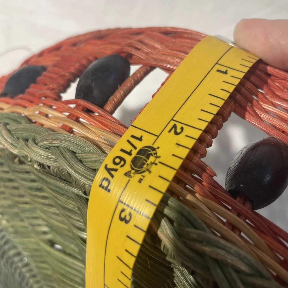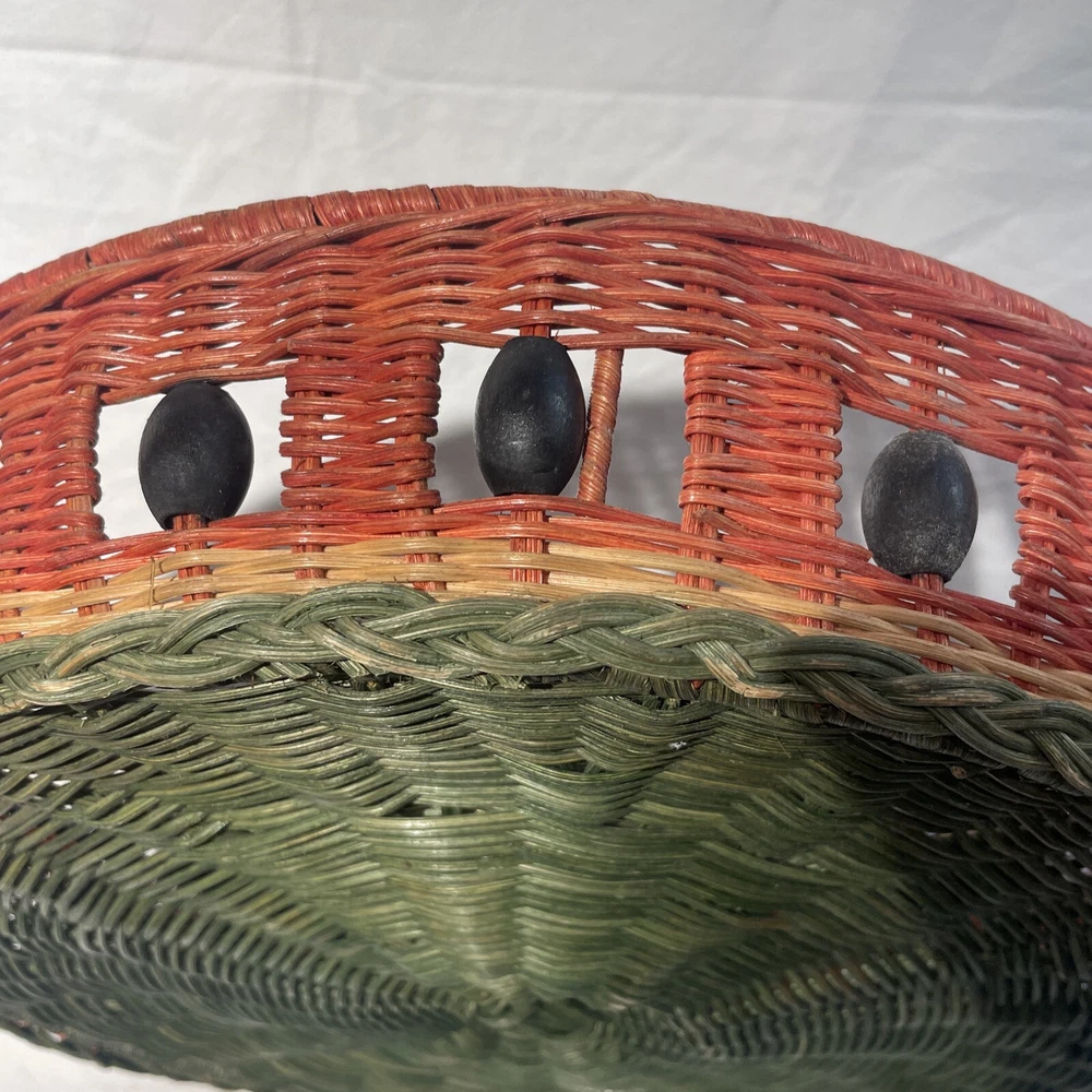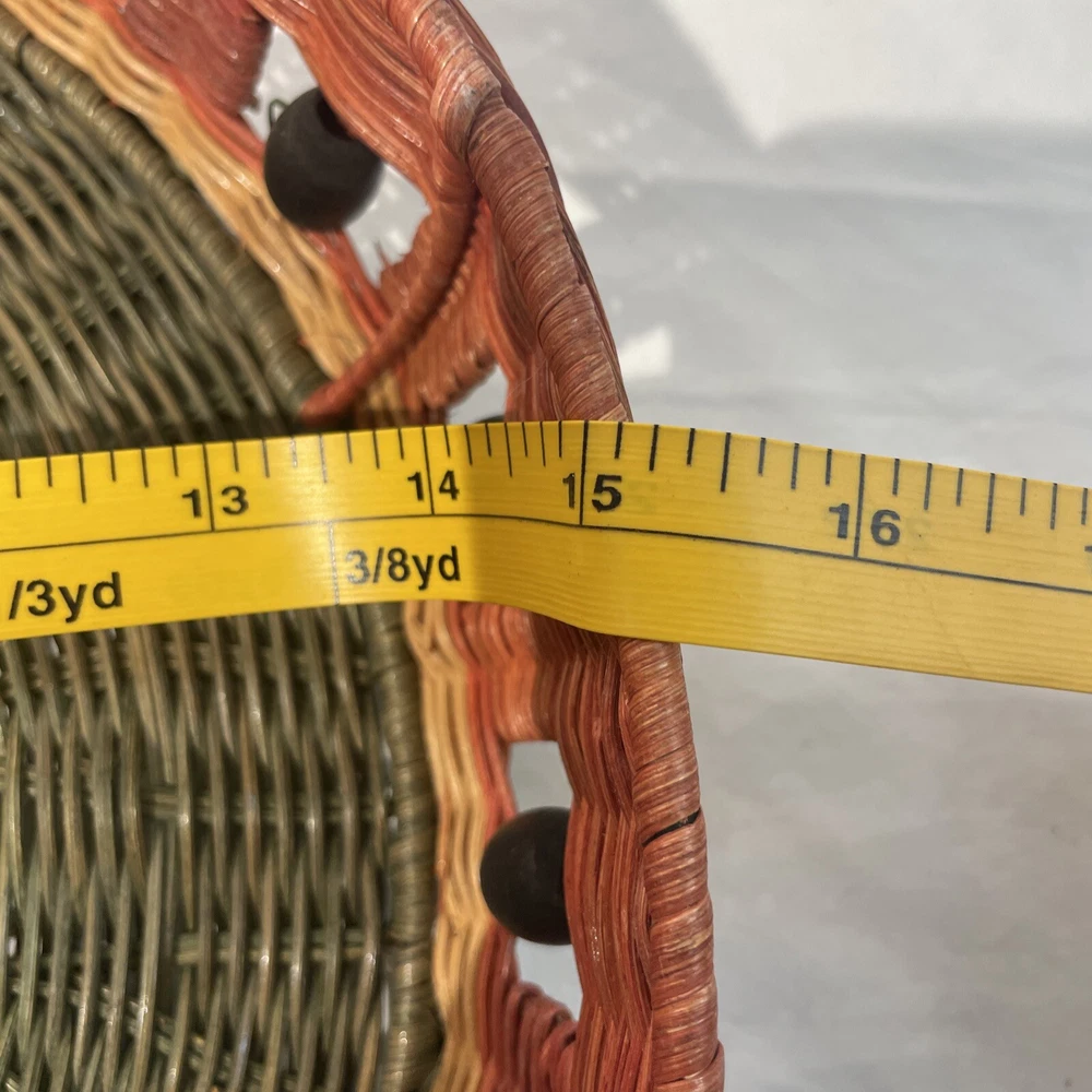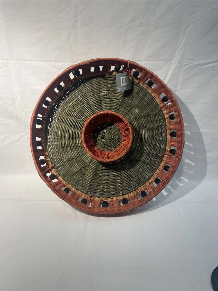 This vintage serving tray is perfect for any occasion, whether it's a bachelorette party or just a casual get-together with friends. The round watermelon pattern adds a touch of fun and whimsy to your table setting, while the sturdy wicker material ensures that it will last for many years to come. With two compartments and a large size of 15 inches in diameter, this tray is perfect for serving chips, dip, or other small snacks. The multicolor design is sure to catch the eye of your guests, and the easy-to-fill feature makes it a convenient addition to your dinnerware collection. Add a touch of style to your table with this charming serving tray.