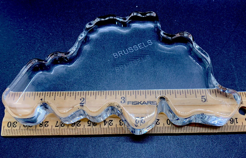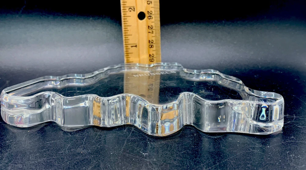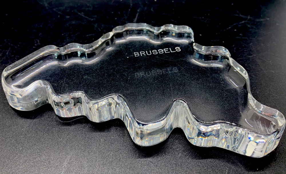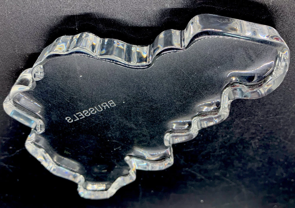 Val Saint Lambert crystal shaped like Belgium, word Brussels engraved.