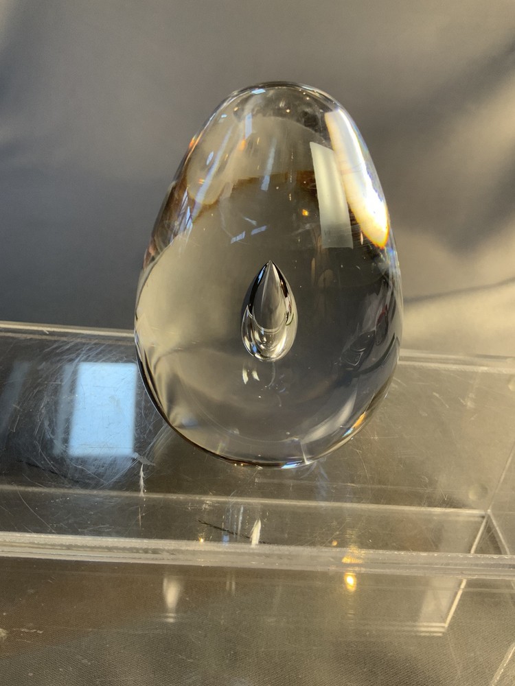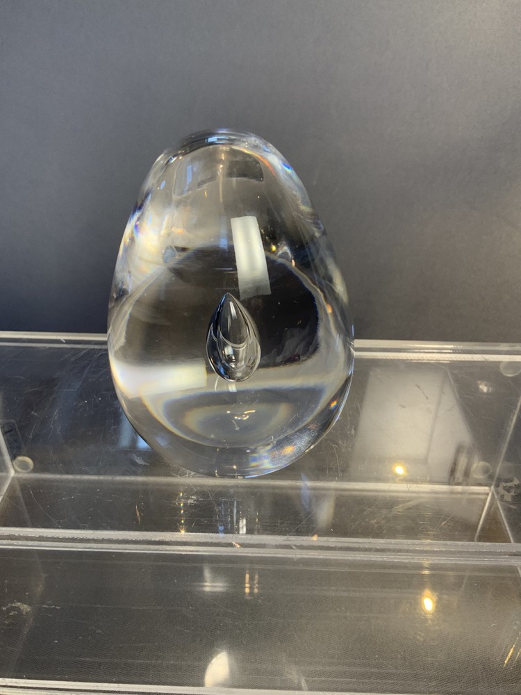 Val St. Lambert Egg Shaped Controlled Teardrop Bubble Clear Paperweight. Approximately 3.5” high. Signed/Incised on the bottom. Excellent pre-owned condition.