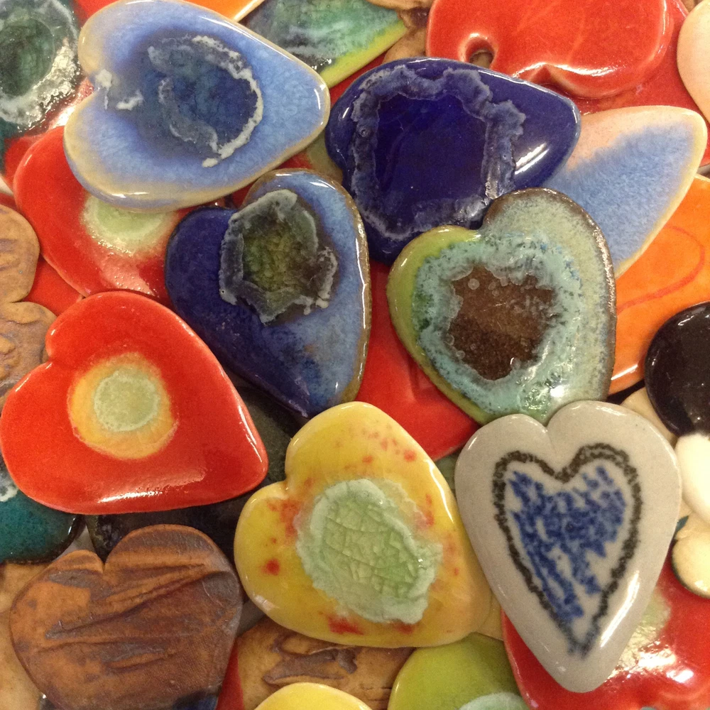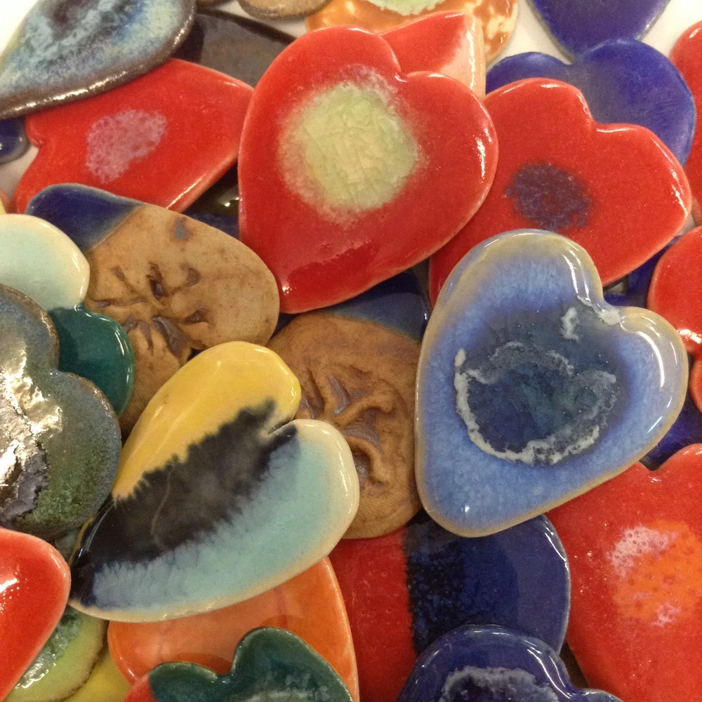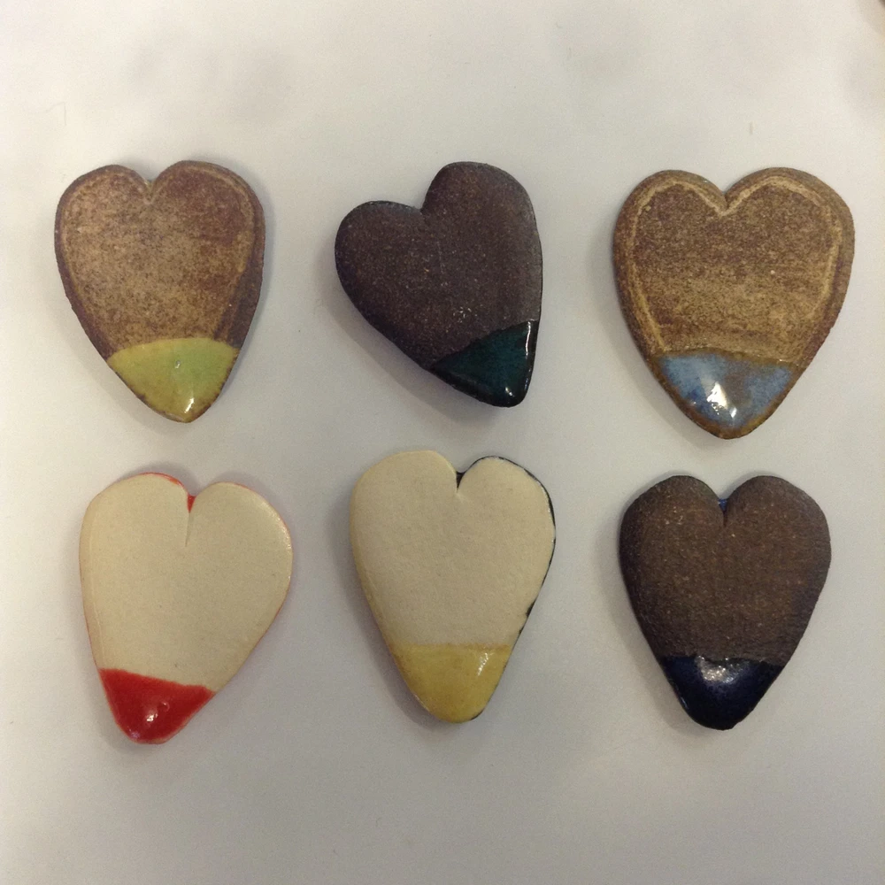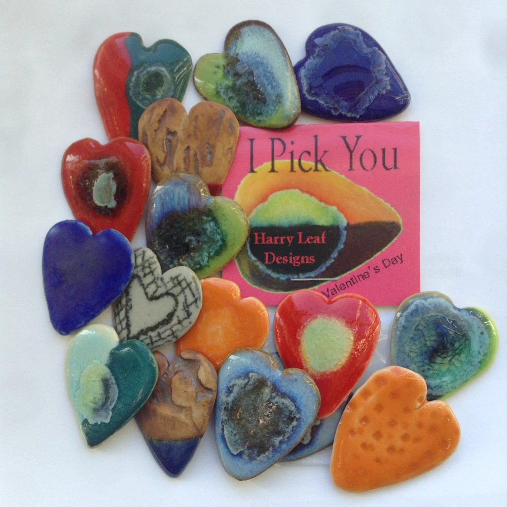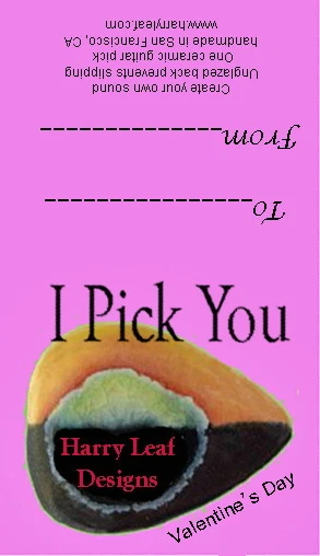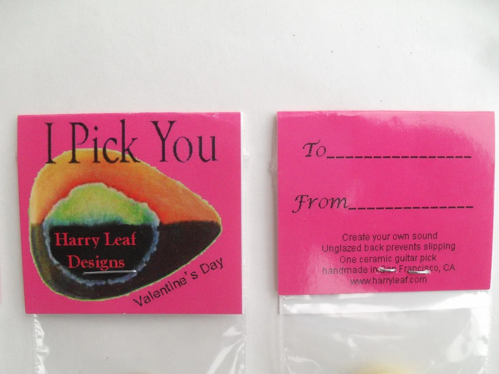 This sale is for ***A RANDOM VARIETY OF THREE HEART SHAPED GUITAR PICKS.*** All three are made of a stoneware clay. There are a variety of glaze techniques used to produce many different effects. The back on all are glazed solely on the tips which is helpful for easy gripping. You can look at my other listings to see detailed descriptions of the different glazing techniques I use. Since this is a Valentine's special I will pick out the variety of three and try to give a nice grouping with different techniques. These picks are perfect for the guitarist who enjoys playing with a solid rigid pick. The unglazed side gives traction to the pick so it is easy to grip. The unglazed side also is glazed at the tip for a uniform texture on both of the portions that contact the guitar strings. On the picks that incorporate recycled glass, the recycled glass is used to make a statement about the the need for reusing and recycling materials as well as for the amazing design it naturally gives the pick when it melts with the glaze. Where the glaze meets the glass it is slightly textured but not at all sharp. With all of the picks you will find different textures, thicknesses, colors, designs and weights which will be fun for the guitar enthusiast to try out. Each pick will come packaged in Valentine's Day packaging so you can give them all to one friend or spread the love, even keeping one for yourself. It is a wonderful gift for a friend or relative who plays guitar who wants to try something new. These picks give a brighter sound than a traditional plastic pick. They are great for classical guitar playing or for any style that needs to pick individual strings. Or just as a gift/art statement to let someone know that you know how important their guitar playing is to them. Dimensions(approximate because each one varies a little): 1 inch wide and 1 1/4 inches tall, and about 2mm thick. Product Features Size: About 1 3/8" X 1 1/8" Made of different stoneware clays and glazed with a variety of glazing techniques. You will receive a variety of three different picks. The back is glazed on the tip only. The exposed clay makes for easy gripping. Can be washed with soapy water. May not be suitable for young children. Each guitar pick is handmade by Harry Leaf in his studio in San Francisco, CA.
