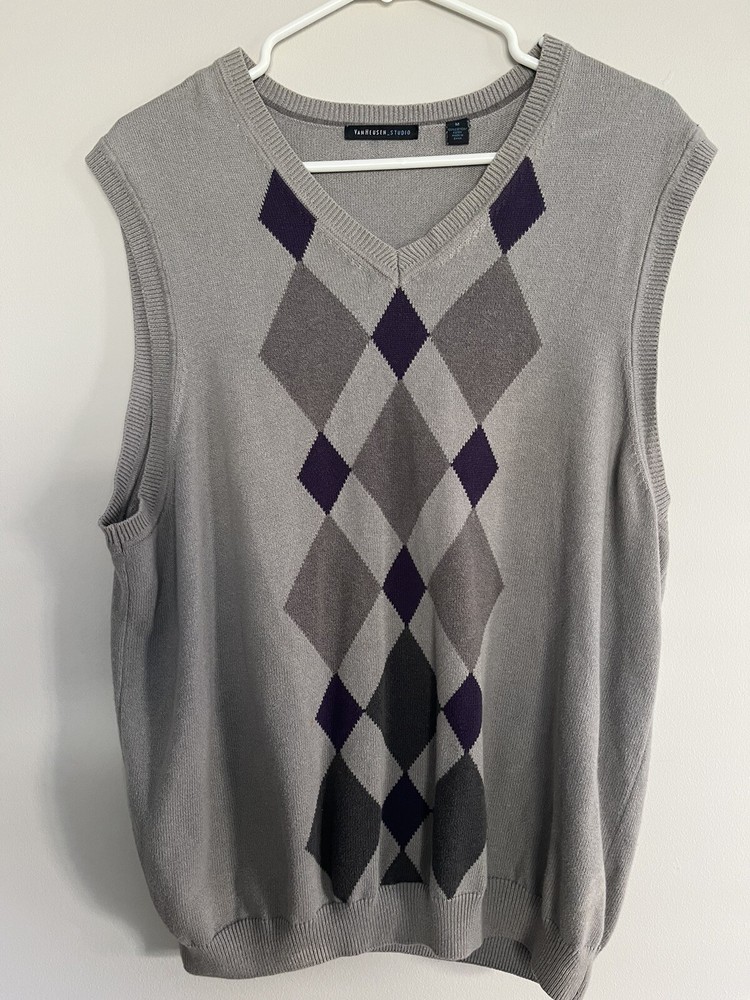 Van Heusen Studio Men V-Neck Vest Gray Purple Diamond Argyle Pattern Size Medium. Checkout our store for other items ***NO RETURNS***