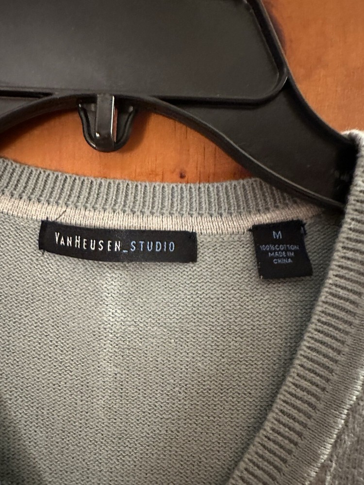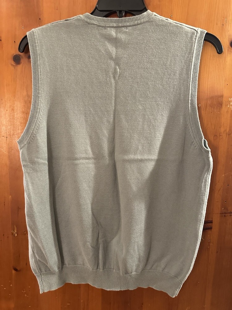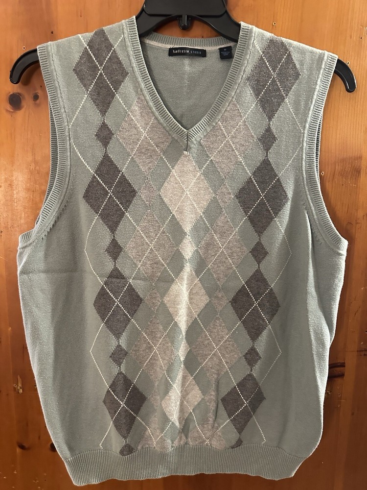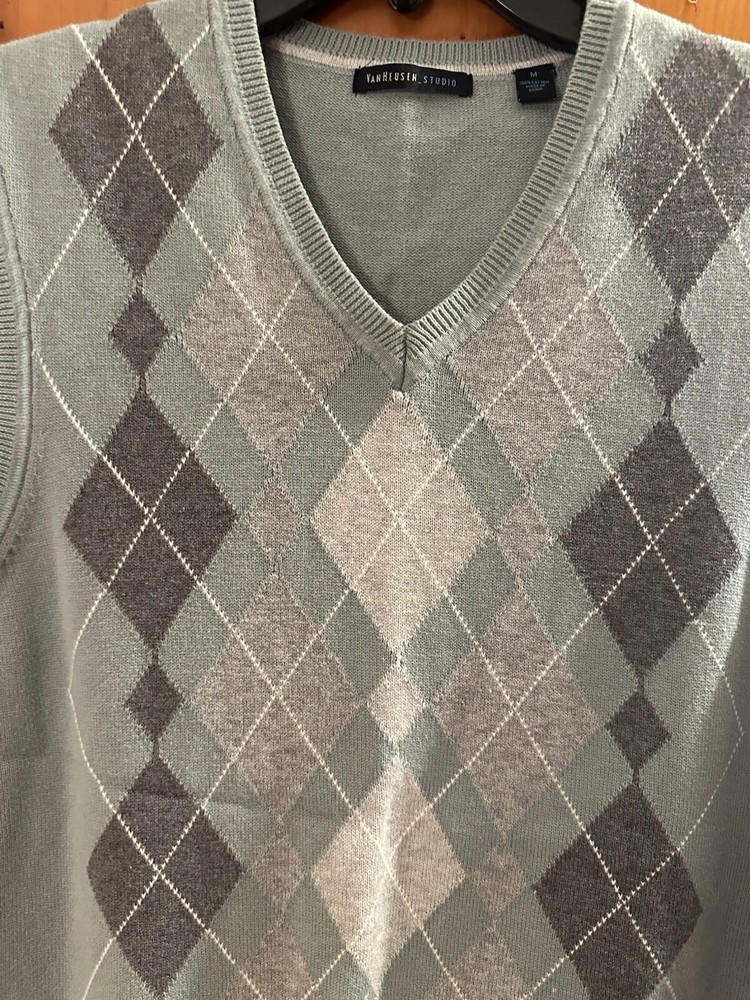 Preowned- Good condition Van Heusen Studio Men's Sweater Vest in Mint Green & Gray, featuring a diamond pattern and V-neck design. Made of 100% cotton in a tight-knit fabric, this vintage piece is a size medium. It is sleeveless and suitable for casual occasions, with a classic and preppy style perfect for all seasons. This pullover vest is machine washable and offers a lightweight, stretchy fit.