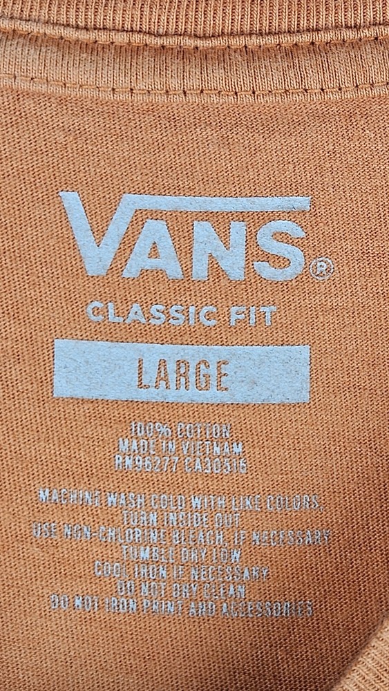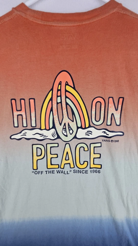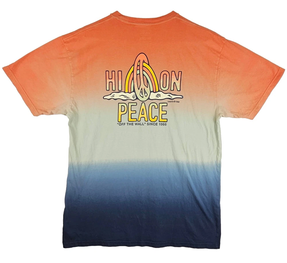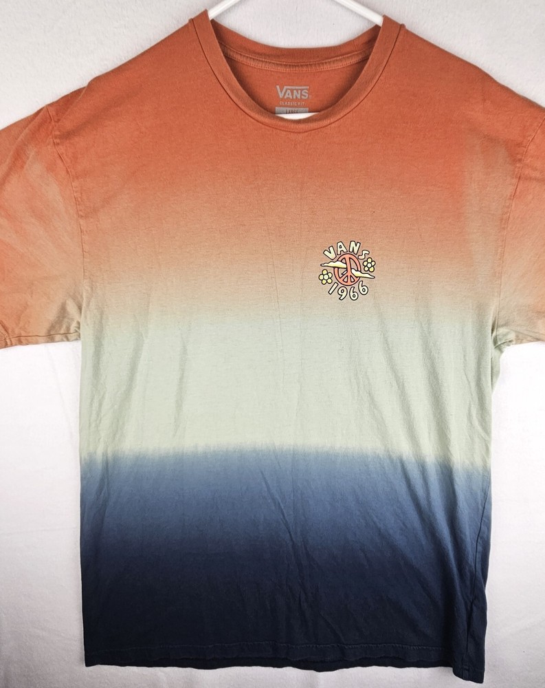 Express yourself with the Vans Men's Dip Dye "Peace of Mind" T-shirt. This colorful T-shirt features a unique pattern with a Peace character accent and the iconic Vans logo. Made of 100% cotton, this T-shirt is not only comfortable but also breathable, making it perfect for any season. The short-sleeved crew-neck T-shirt comes in a classic fit, making it suitable for men of all sizes. It is also machine washable, ensuring easy care. Wear this T-shirt for any occasion, whether you're going out with friends or relaxing at home. The Vans Peace on Mind T-shirt is a must-have for any wardrobe. ***PRE-OWNED MENS SIZE LARGE ***PLEASE SEE ALL PHOTOS AS THEY ARE A PART OF THE ITEM DESCRIPTION AND CONDITION. THANKS FOR LOOKING!