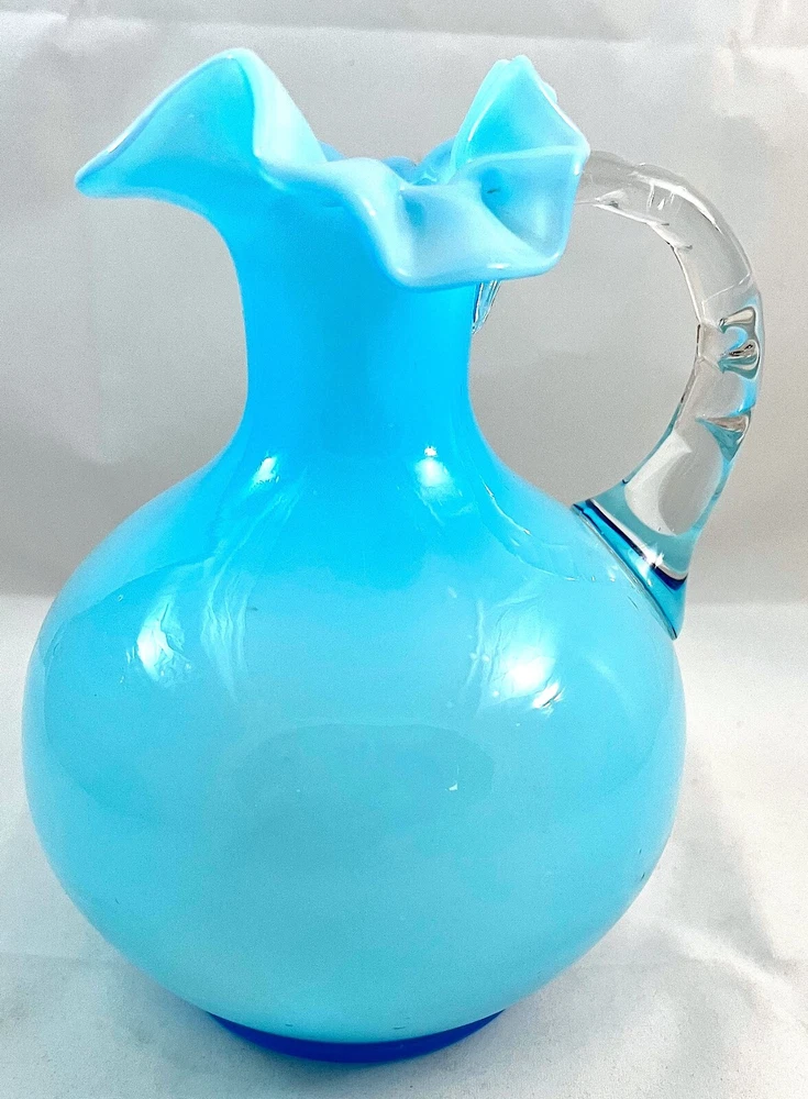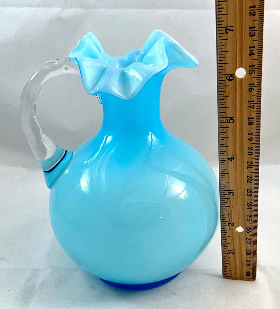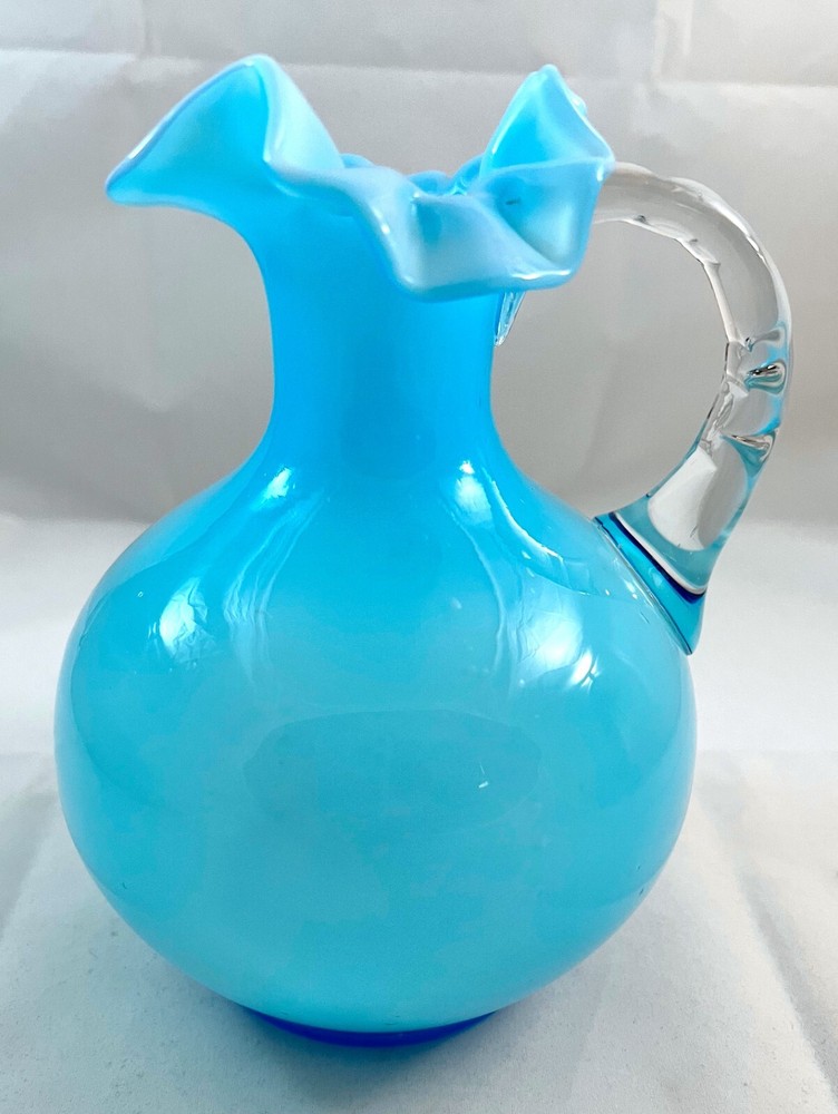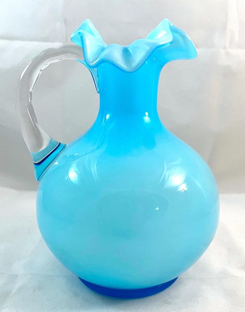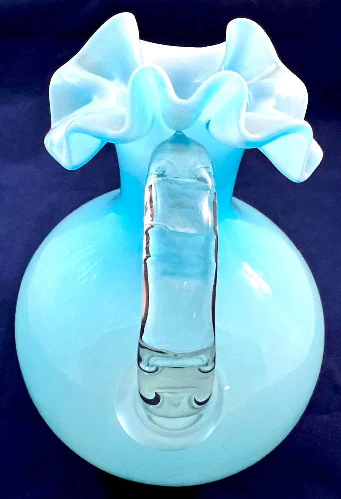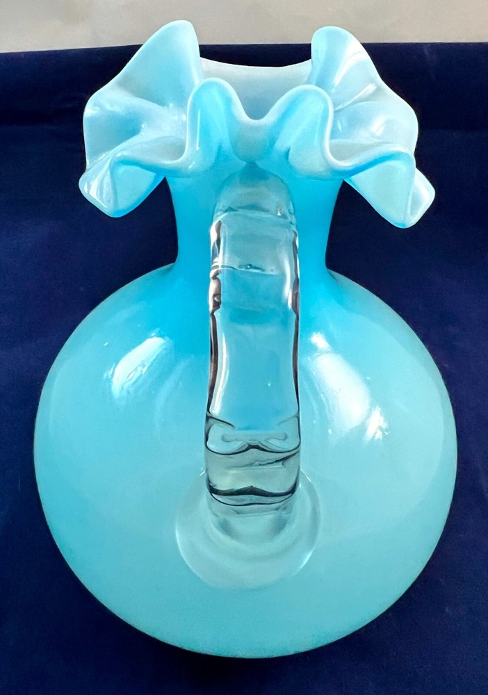· Gorgeous Fenton blue glass pitcher-shaped vase with handle · Graceful ruffled or crimped top rim · Fenton’s overlay line of glass pieces · Size: approximately 7” high · Features: Clear applied handle, elegant ruffled top rim, overlay line of glass · Made in U.S.A. by Fenton 1940’s-50’s, no markings · Highly collectible cottage, mid-century décor Condition: Excellent condition, no chips, cracks, fading, clouding, or repairs BUYER PAYS SHIPPING COSTS. ALL OF THE PICTURES IN THIS LISTING ARE TAKEN OF THE ACTUAL OBJECT(S) THAT IS(ARE) FOR SALE. All items ship within ONE business day after payment is received. Just so you'll know, I’m not a professional seller; I'm a schoolteacher. I enjoy history and love finding tasteful collectible, vintage, antique, and even contemporary items that I think might one day become collectibles to share with family and friends. Please see all photos, as they are part of the description. My photos are ALWAYS of the actual object(s) that you are buying. Ask questions before purchasing; returns usually are not accepted unless the item is damaged in shipping or described incorrectly. That being said, if you have a problem with an item you receive, please feel free to contact me before leaving feedback, and I will make it right. I value my impeccable feedback record and always strive for 100% customer satisfaction. While you’re at it, please take a minute to look at the other BachMozart vintage, antique, one-of-a-kind, and collectible listings...they’re all beautiful!!!!! Check out my great feedback record and bid with confidence! I will gladly combine items to save on shipping costs. To purchase multiple items , put the items you wish to buy in the cart, then click on "Request Total". I will then send you an invoice including the combined shipping cost, which in most cases will be discounted. After receiving the invoice, make payment. I accept all payment methods approved by eBay. Note: My packages sometimes weigh a bit more than some other sellers because they most often are double boxed for extreme safety. Almost everything I sell is rare or one-of-a-kind and would either be impossible or very difficult to replace. I make every effort to pack your purchase so that you receive it in undamaged condition! ABOVE ALL, THANK YOU FOR BEING A VALUED CUSTOMER AND STOPPING BY!