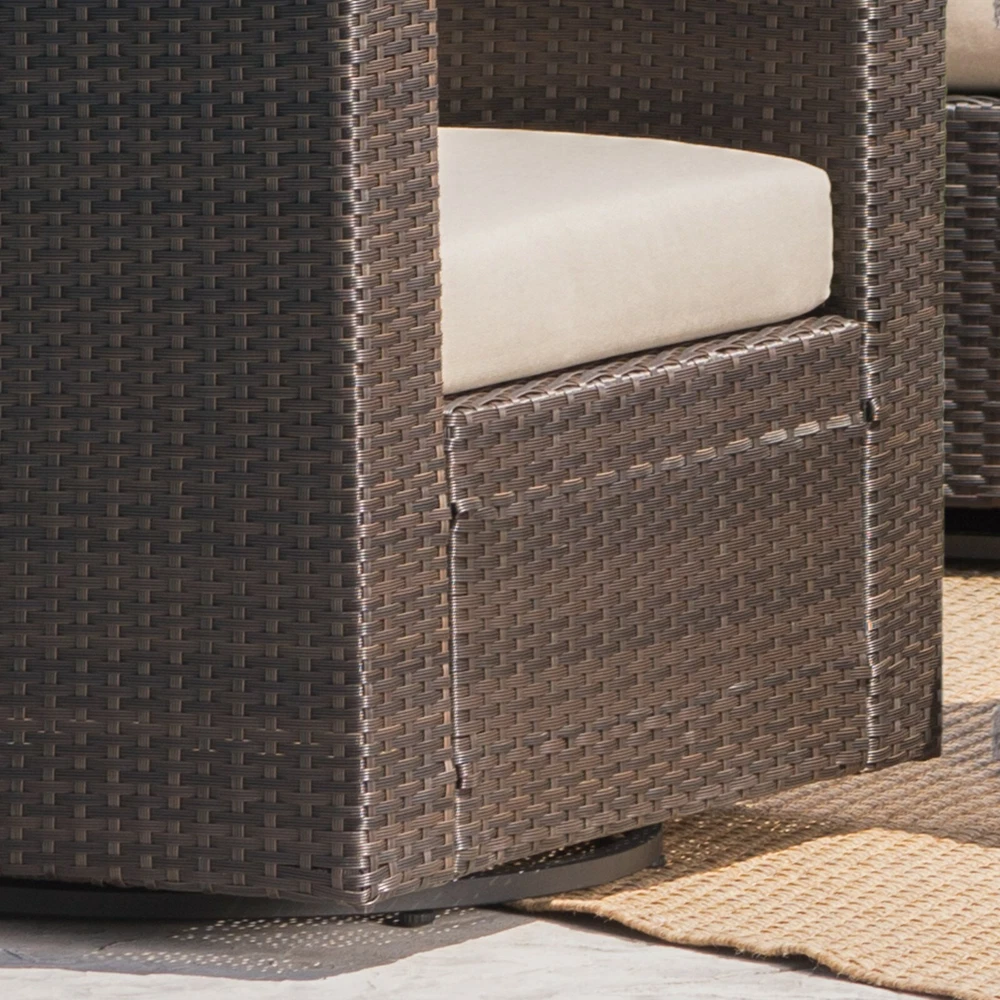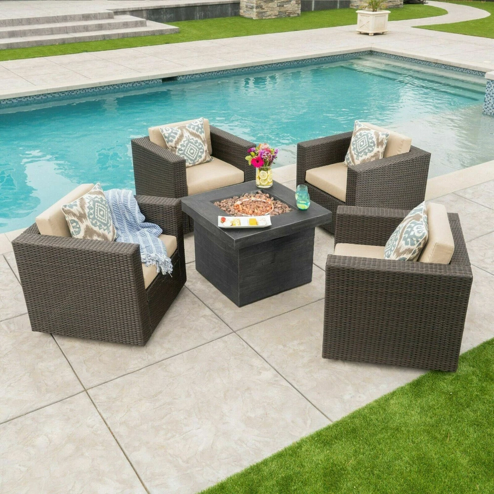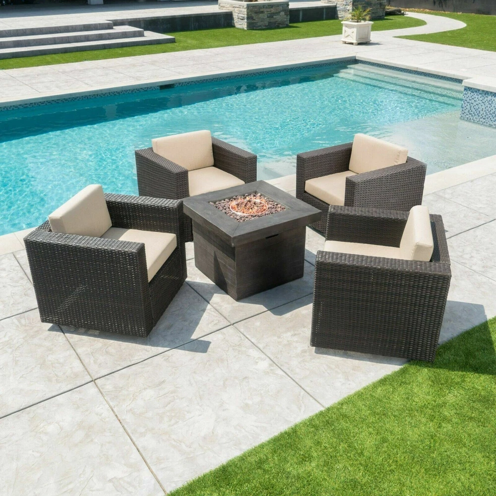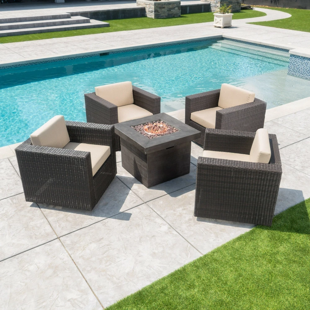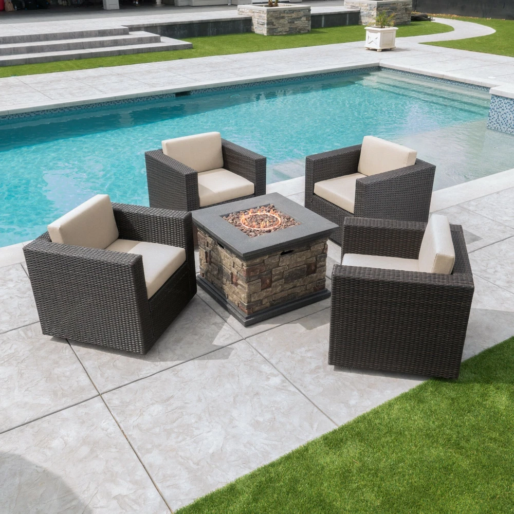 No need to go camping to enjoy all the romance and excitement of an evening spent around the fire. Now you can have a fire pit in your backyard without smelling like smoke. This safe, gas-burning fire pit and four accompanying swivel club chairs means that friends and family have a great way to spend evenings outside enjoying the night air and talking or telling ghost stories. Product Details: Includes: Four (4) Club Chairs and One (1) Fire Table Chair Material: Polyethylene Wicker Chair Frame Material: Iron Chair Cushion Material: Water Resistant Fabric Composition: 100% Polyester Fire Table Material: Magnesium Oxide Wicker Finish: Dark Brown Cushion Color: Beige Table Finish available in Gray, Brown, or Stone/Brown Assembly Required Dimensions: Chair Dimensions: 32.08"D x 30.31"W x 27.95"H Seat Width: 25.25" Seat Depth: 22.75" Seat Height: 15.00" Fire Table Dimensions: 32.20"D x 32.20"W x 23.80"H PROP 65 WARNING