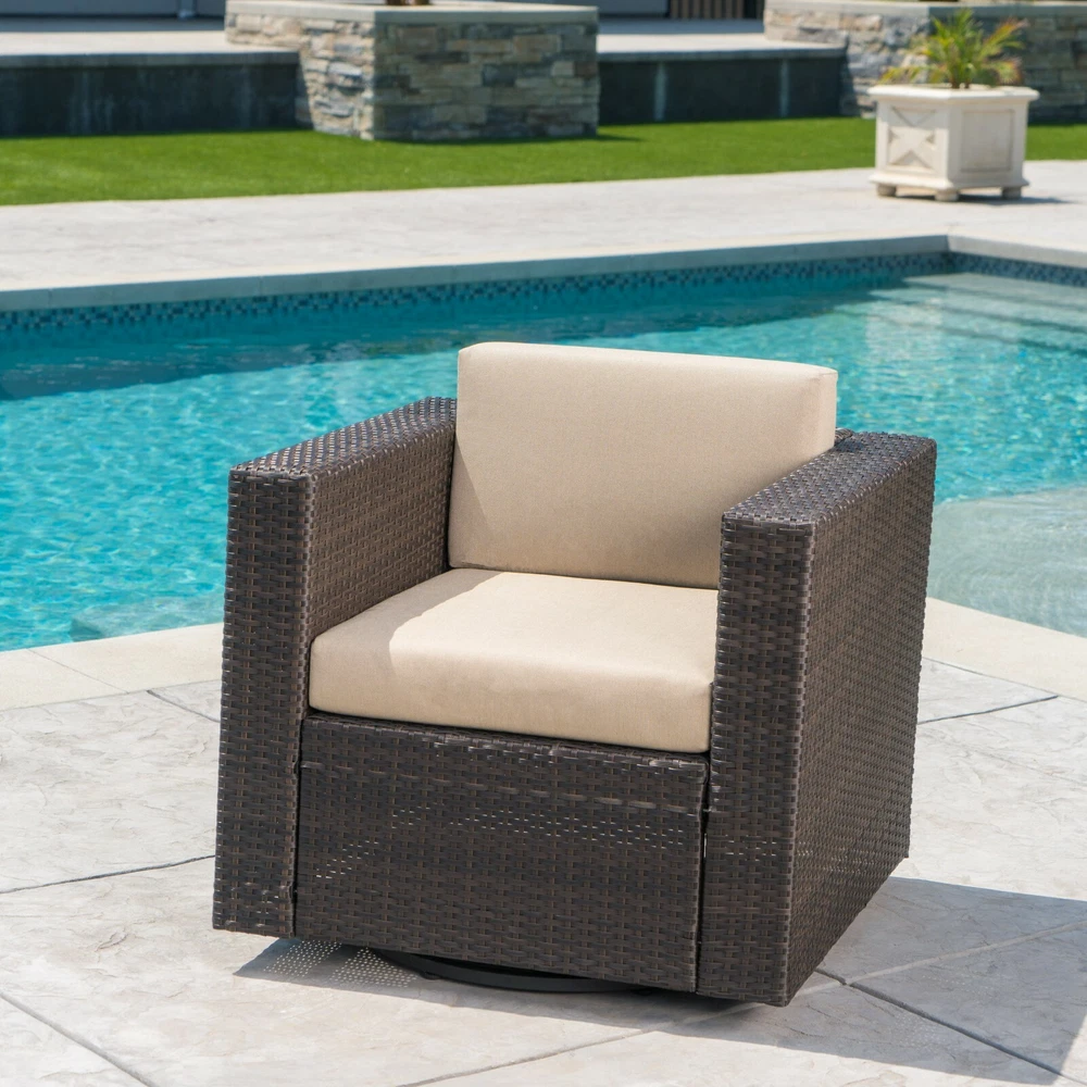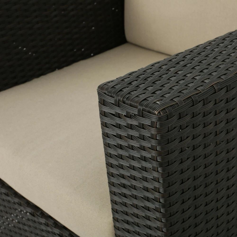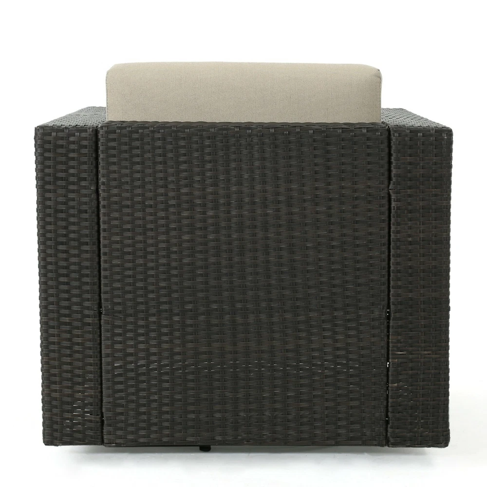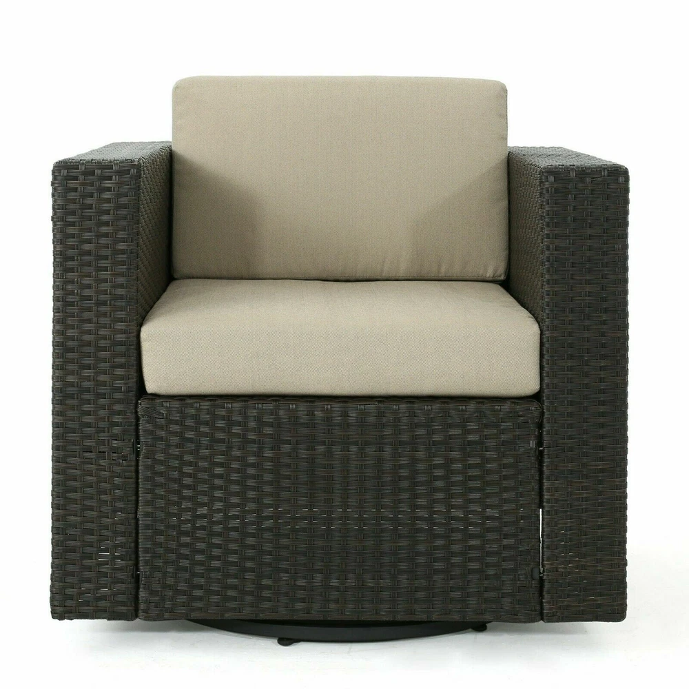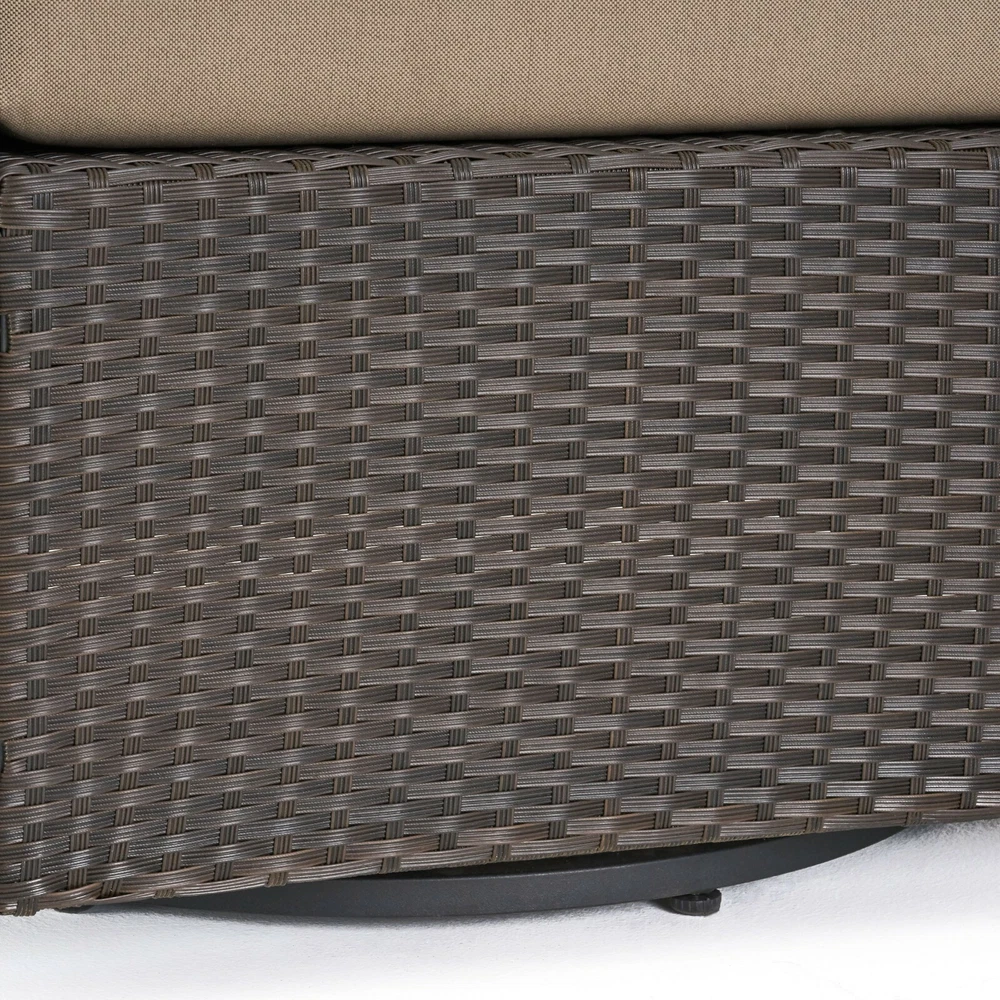 No need to go camping to enjoy all the romance and excitement of an evening spent around the fire. Now you can have a fire pit in your backyard without smelling like smoke. This safe, gas-burning fire pit and four accompanying swivel club chairs means that friends and family have a great way to spend evenings outside enjoying the night air and talking or telling ghost stories. Product Details: Includes: Four (4) Club Chairs and One (1) Fire Table Chair Material: Polyethylene Wicker Chair Frame Material: Iron Chair Cushion Material: Water Resistant Fabric Composition: 100% Polyester Fire Table Material: Magnesium Oxide Wicker Finish: Dark Brown Cushion Color: Beige Table Finish available in Gray, Brown, or Stone/Brown Assembly Required Dimensions: Chair Dimensions: 32.08"D x 30.31"W x 27.95"H Seat Width: 25.25" Seat Depth: 22.75" Seat Height: 15.00" Fire Table Dimensions: 32.20"D x 32.20"W x 23.80"H PROP 65 WARNING