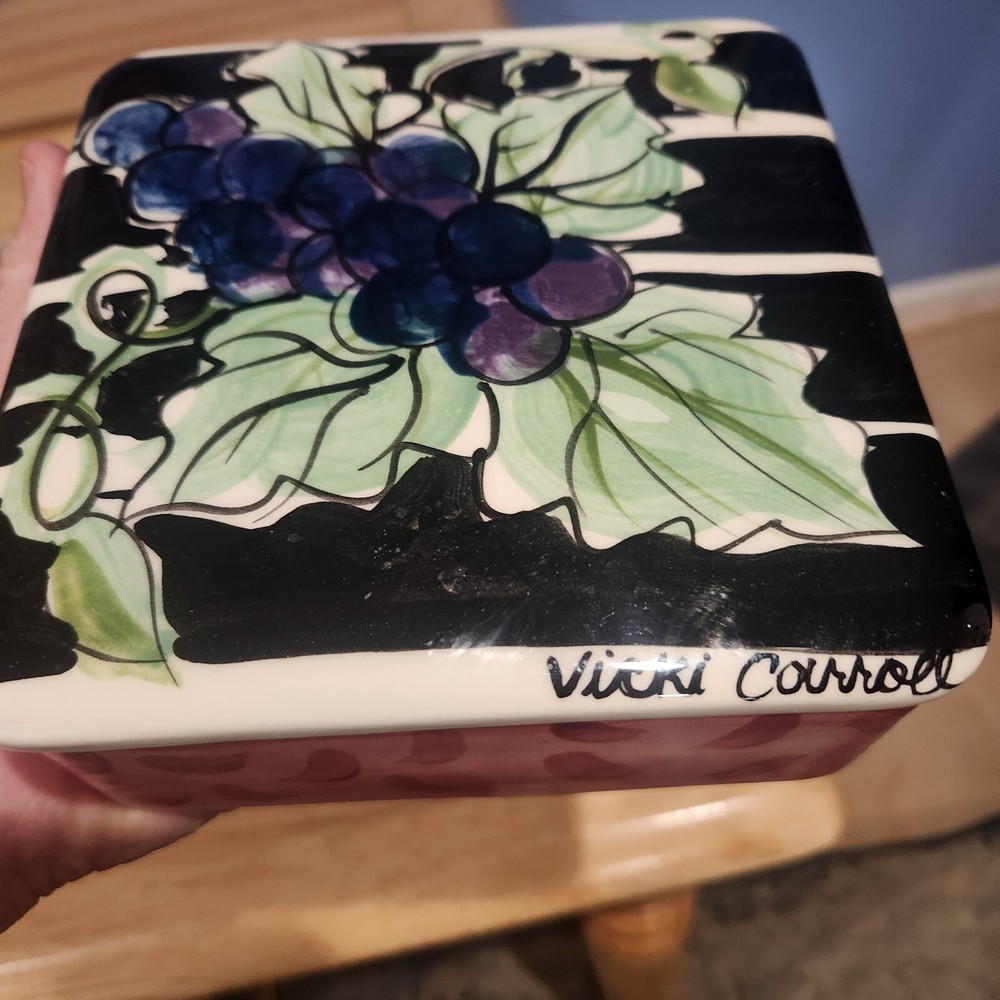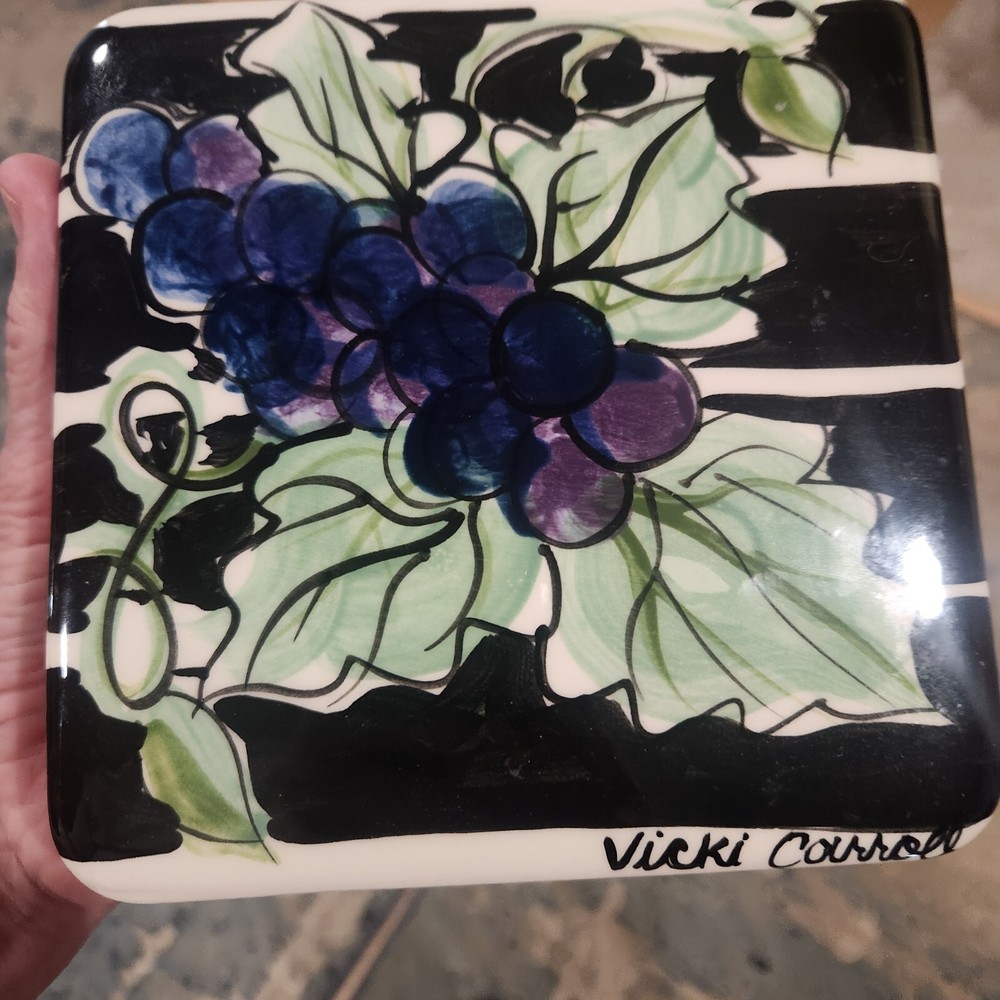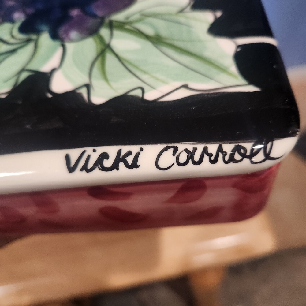 This beautiful trinket box by Vicki Corrall is the perfect addition to any collection. The box features a stunning hand-painted grape pattern on ceramic material and comes in its original packaging. The box is signed by the artist and is sure to impress any admirer of decorative pottery. The trinket box is a great gift idea for anyone who loves unique and beautiful pieces of art. It is perfect for storing jewelry or other small treasures and is sure to add a touch of elegance to any room
