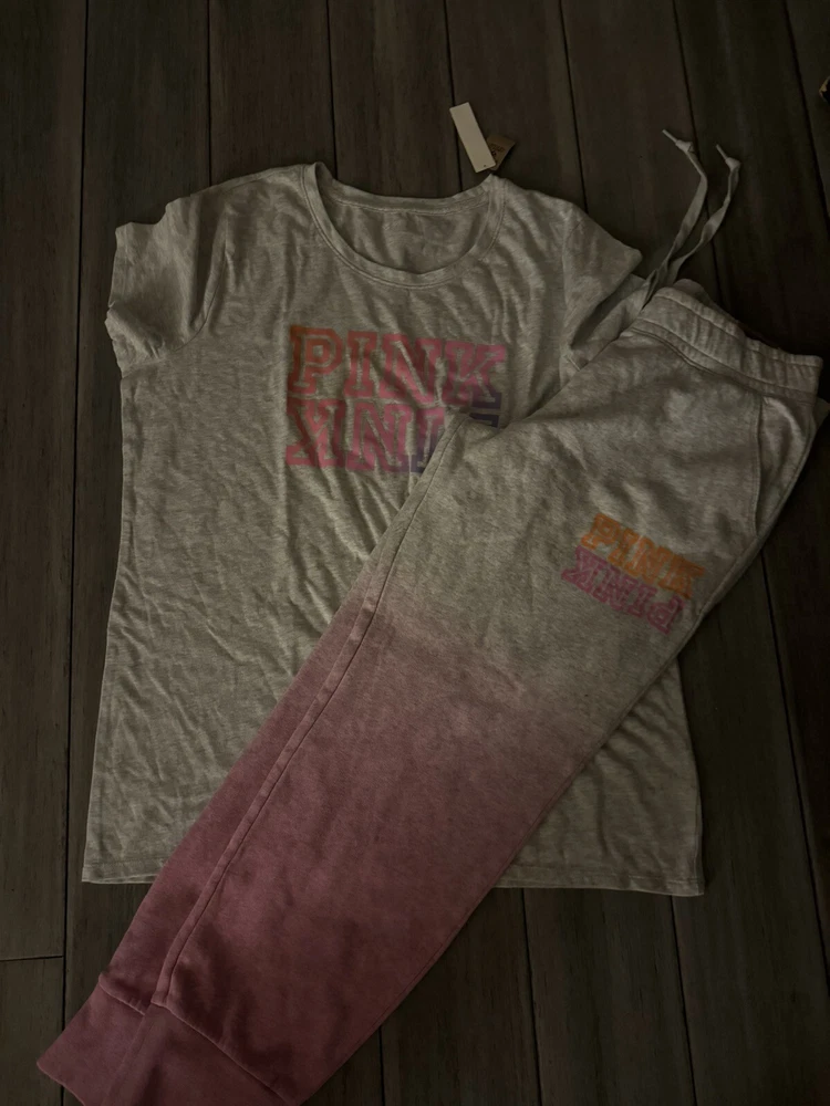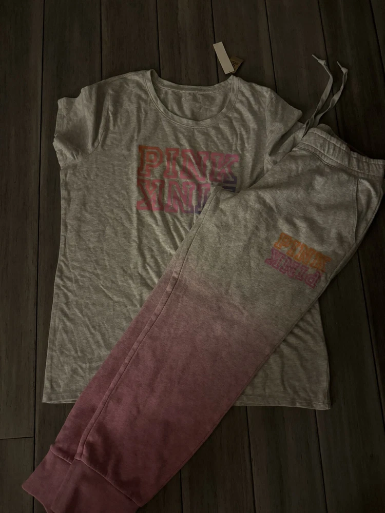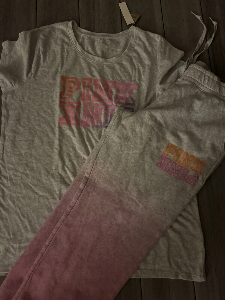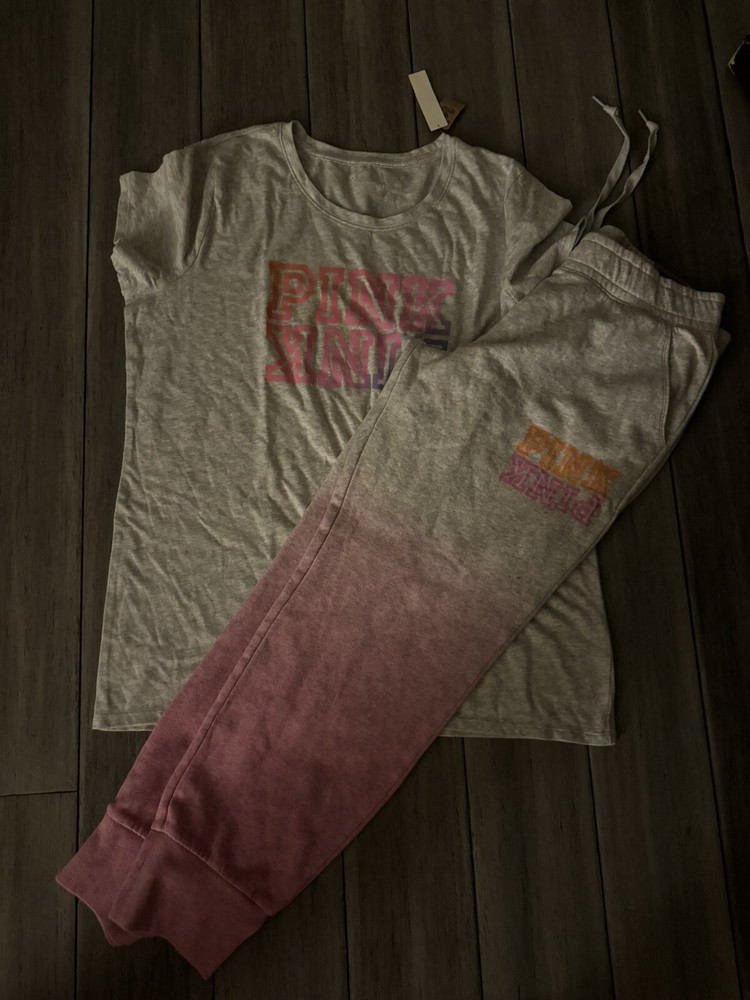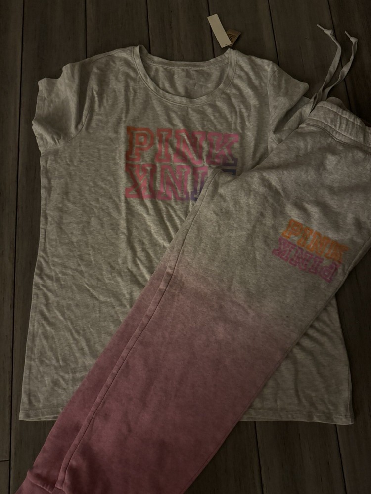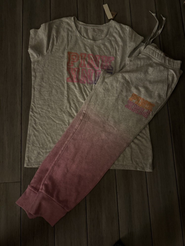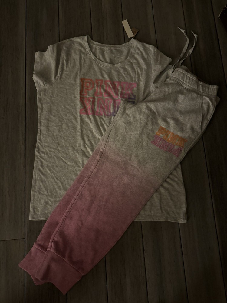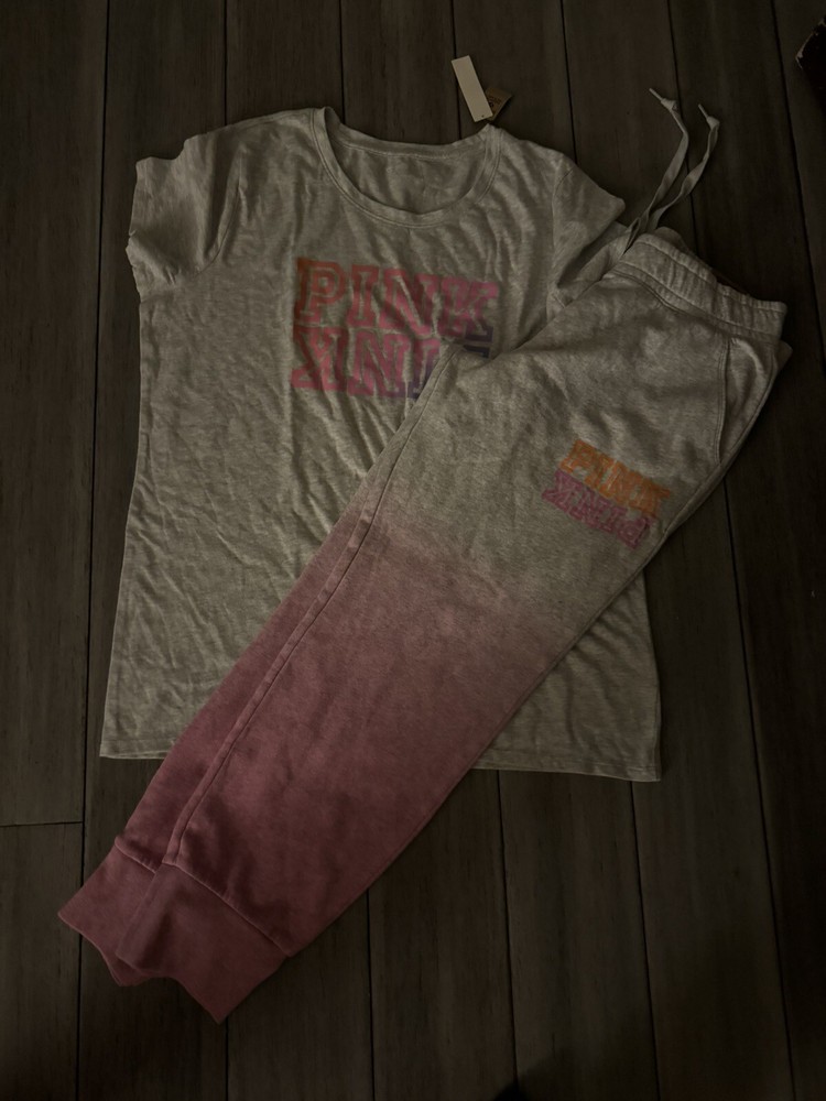 This Victoria's Secret Pink set in size XL/L top size XL bottom size L is a colorful addition to your casual wardrobe. The outfit includes a short sleeve tee shirt and comfortable campus sweatpants in a tie-dye pattern featuring shades of gray and pink. The pullover top has a crew neckline and logo accents, while the bottoms have a relaxed fit and drawstring closure. Made from a cotton blend material, this outfit is perfect for everyday wear and is not vintage. The dip-dye and ombre theme of the tie-dye pattern gives the set a unique and trendy look. Ideal for casual occasions, this set is from the Victoria's Secret Pink product line and will make a great addition to any fashion-forward woman's closet.