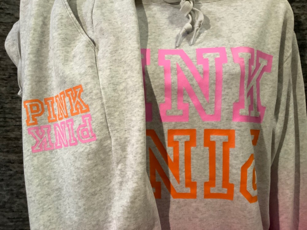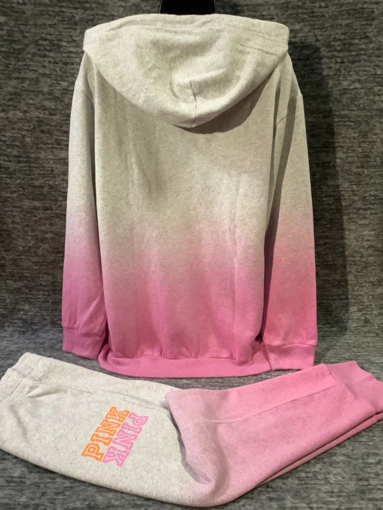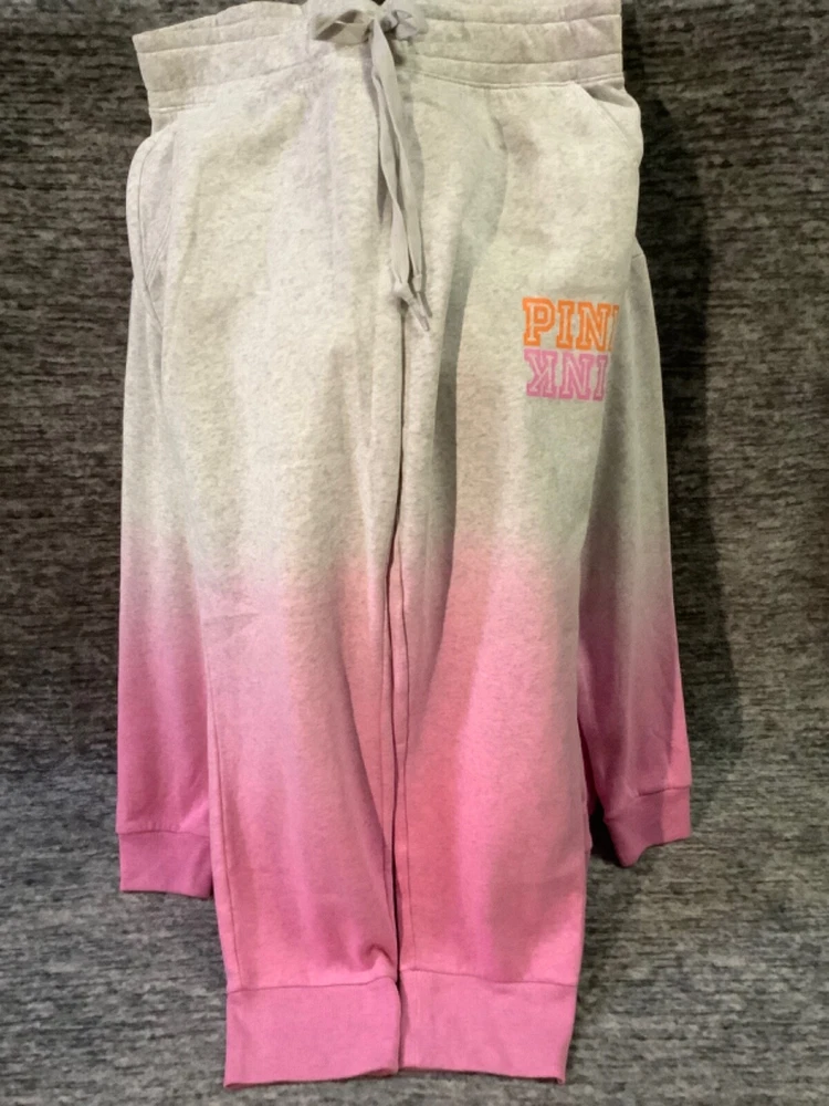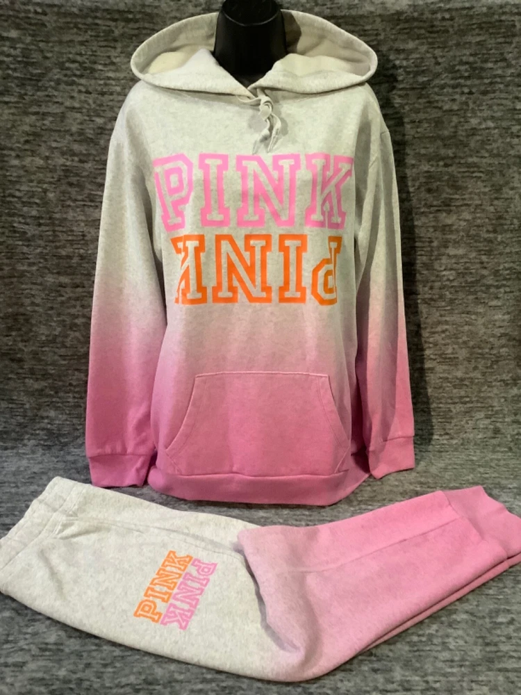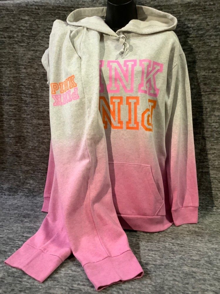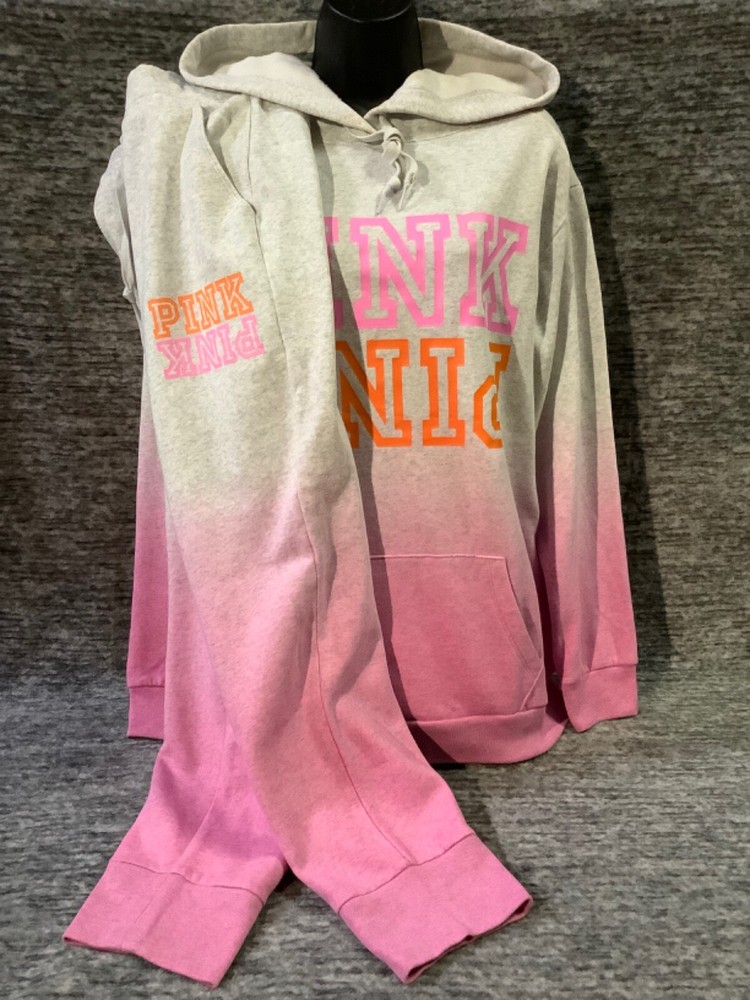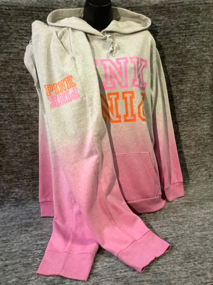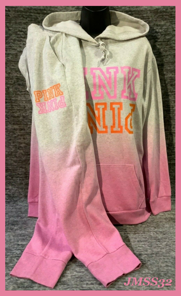 Victoria's Secret Pink Campus Hoodie and Skinny Jogger Pants Set Color: "Heather Stone Gray" and "Neon Bubblegum" ombre dip dye with neon pink and orange PINK logo Color might look little different depending on your screen, computer operating system, etc . BRAND NEW WITH TAGS SET SIZE: X-LARGE HOODIE: RELAXED OVERSIZED FIT Armpit to armpit approx. 25" Shoulder to hem approx. 28.5" Drawstring hood with adjustable string Kangaroo pocket Ribbed cuffs and hem Long cuffed sleeves Super soft fleece Imported 60% cotton 40% polyester SKINNY JOGGERS: RELAXED TAPERED SLIM FIT TAPERED FIT - roomier at the top and narrower towards the ankle High waist with adjustable drawstring Front pockets Ribbed banded bottom Full length Approx. 28" inseam Super soft fleece Imported 60% cotton 40% polyester SEE MY OTHER AUCTIONS FOR COORDINATING PIECES AND MORE GREAT DEALS!!! Please check out all the pictures and the measurements I have posted to make sure this is exactly what you're looking for!!! ♥ If everything is wonderful as expected kindly leave positive feedback...it will automatically be left for you in return!! ♥ Payment is expected within 2 days after close of the auction. Thank you for looking!