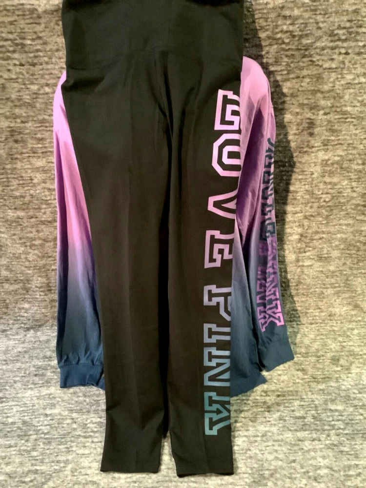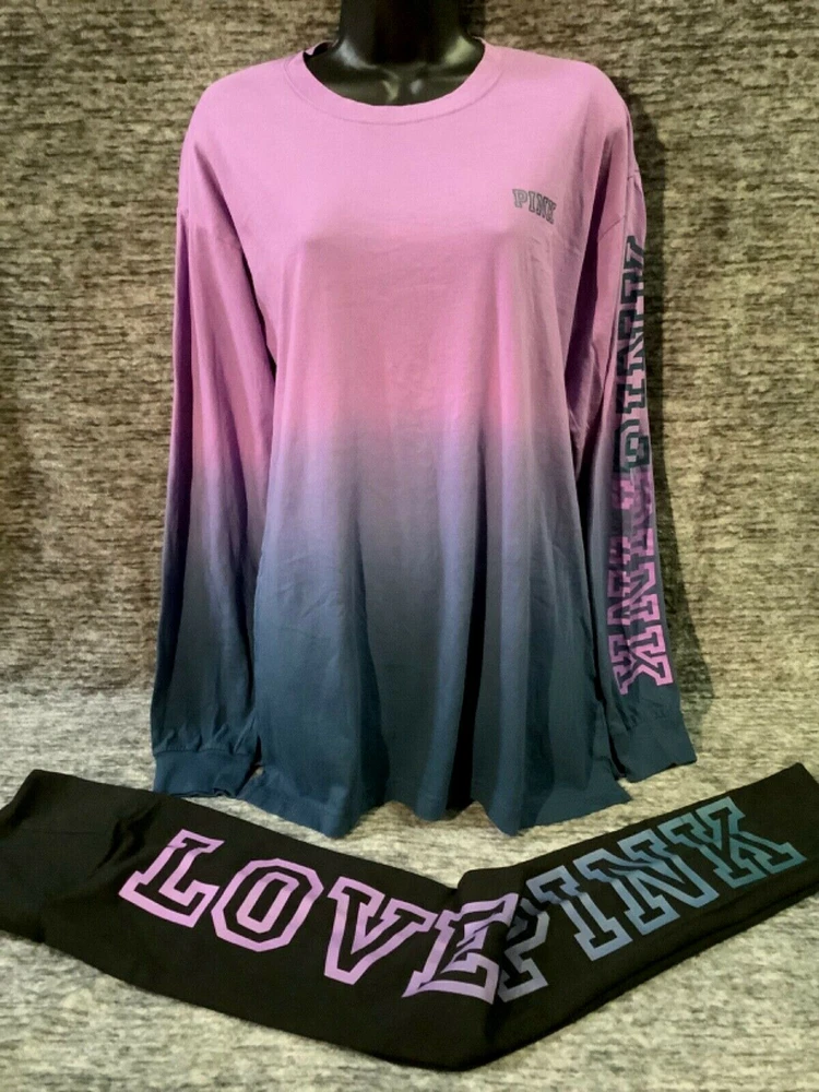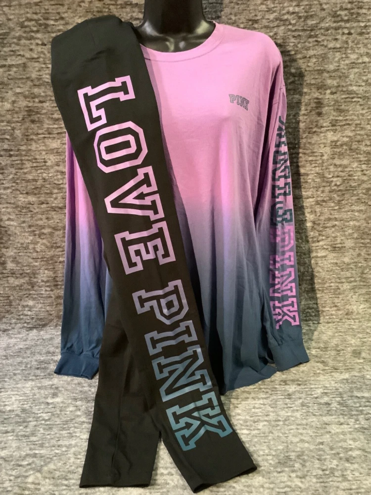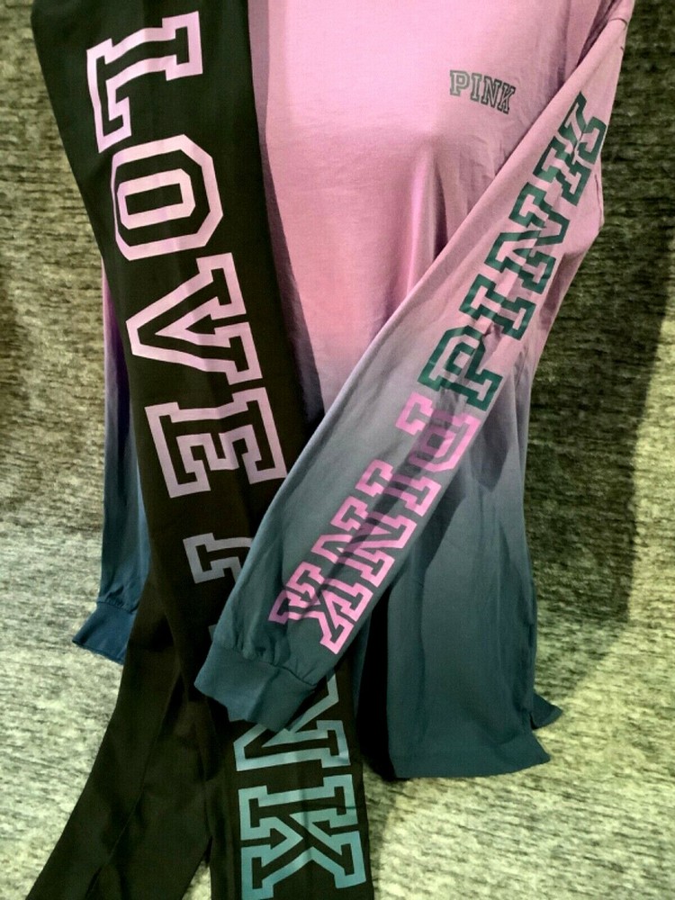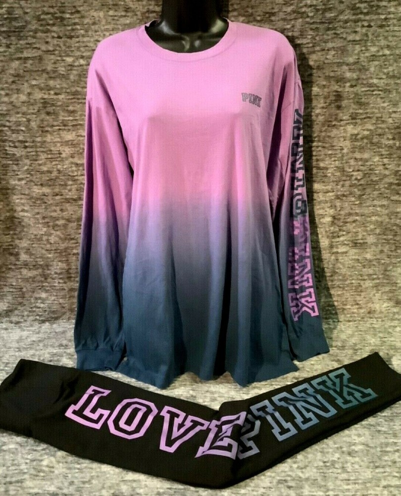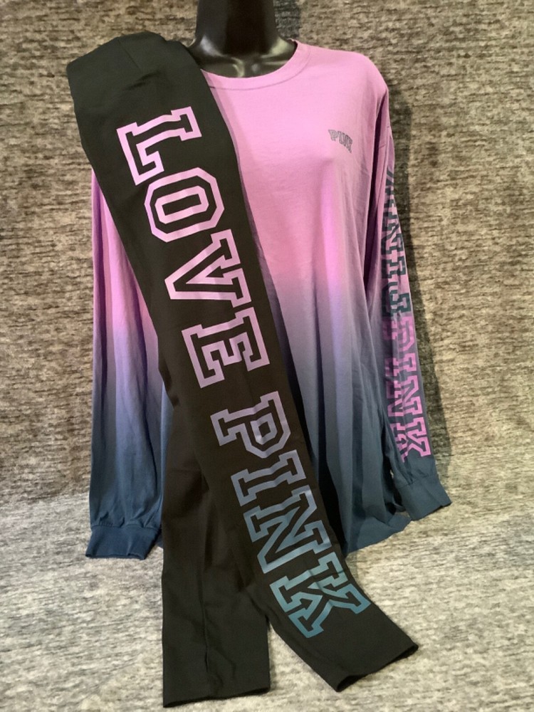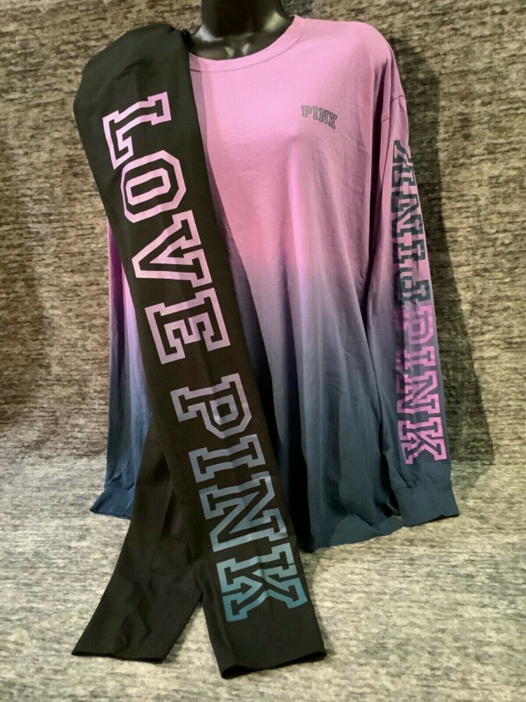 Victoria's Secret Pink Campus Tee Shirt and High Waist Leggings Set Color: Ombre dip dye "Amethyst Orchid and Blue Coral" with PINK logo Black with ombre dip dye "Amethyst Orchid and Blue Coral" LOVE PINK logo Color might look little different depending on your screen, computer operating system, etc. BRAND NEW WITH TAGS SET SIZE: LARGE TEE SHIRT: RELAXED OVERSIZED FIT Armpit to armpit approx. 23" Shoulder to hem approx. 28.5" Longer tunic length with approx. 2.5" side slits Small PINK logo on the front Ombre dip dye PINK logo (2X) on sleeve Crew neck Long cuffed sleeves Imported 100% cotton LEGGINGS: RELAXED SLIM FIT High waist Large hidden pocket Full length Inseam approx. 28.5" Imported 87% cotton 13% elastane SEE MY OTHER AUCTIONS FOR COORDINATING PIECES AND MORE GREAT DEALS!!! Please check out all the pictures and the measurements I have posted to make sure this is exactly what you're looking for!!! β™₯ If everything is wonderful as expected kindly leave positive feedback...it will automatically be left for you in return!! β™₯ Payment is expected within 2 days after close of the auction. Thank you for looking!