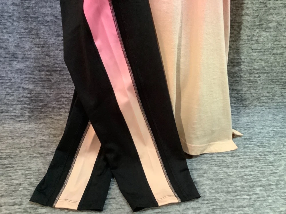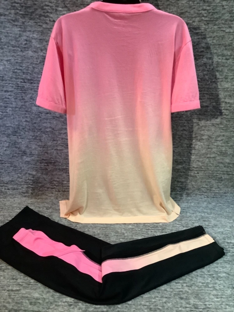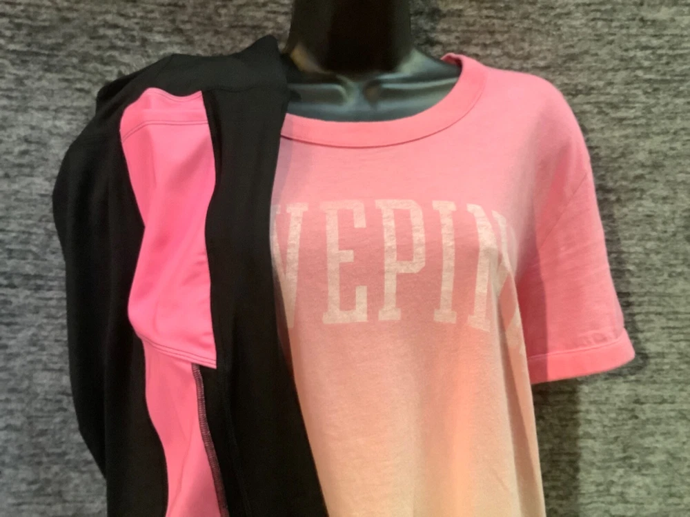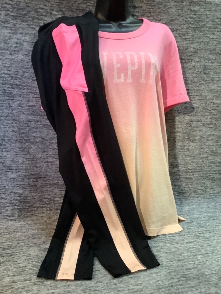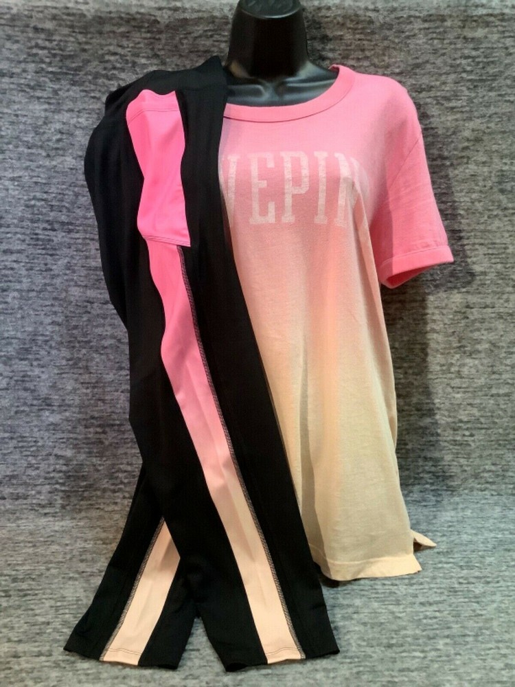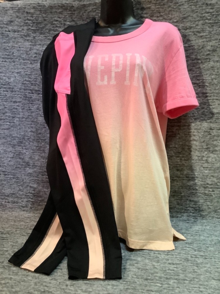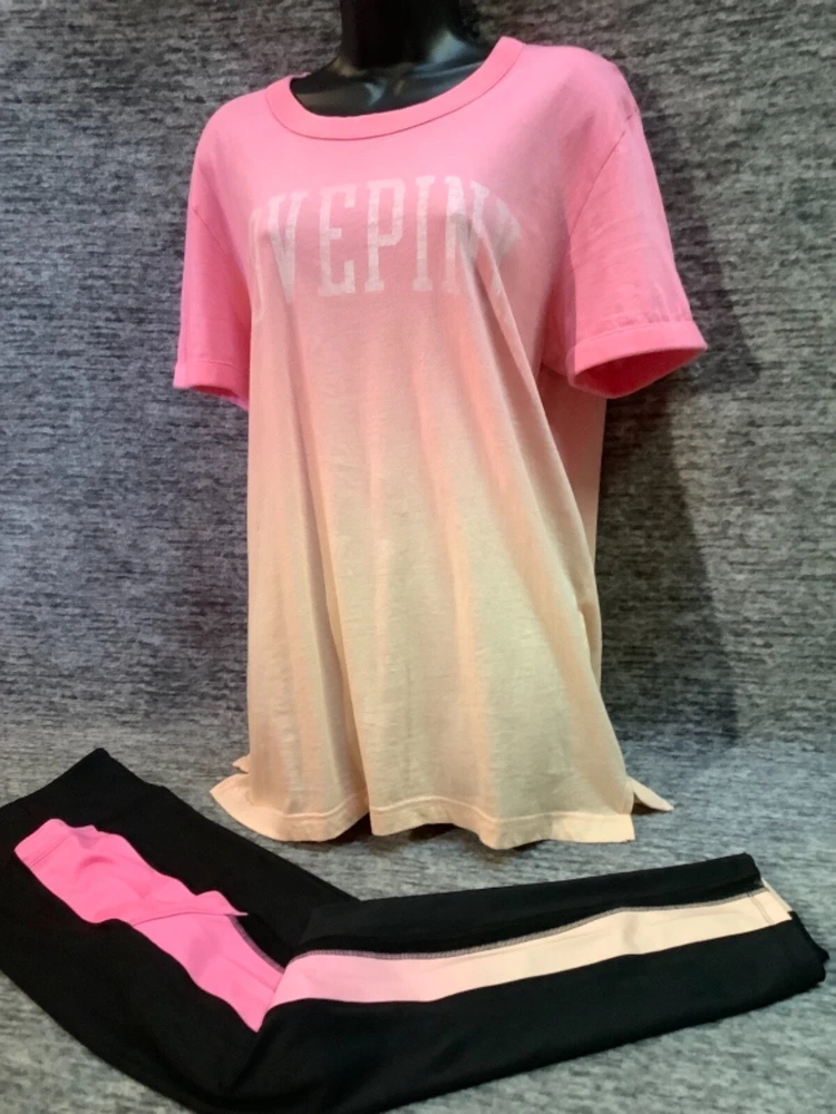 Victoria's Secret Pink Campus Short Sleeve Tee Shirt and Ultimate 7/8 Ankle Leggings Color: Dip Dye Ombre "Peach Aura" and "Neon Bubblegum" pink with white LOVE PINK logo Black with Dip Dye Ombre " Peach Aura" and "Neon Bubblegum" stripes and black mesh Color might look little different depending on your screen, computer operating system, etc. BRAND NEW WITH TAGS SET SIZE: X- LARGE TEE SHIRT: RELAXED OVERSIZED FIT Armpit to armpit approx. 24" Shoulder to hem approx. 29" Longer tunic length with approx. 2.5" side slits Ringer crew neck White "washed-like" LOVE PINK logo on the front Short sleeves Ribbed trims on neck and sleeves Lightweight Imported 100% cotton ULTIMATE LEGGINGS: RELAXED SLIM FIT High waist Smoothing V waistband and body-hugging fit Squat proof ~ blackout fabric ~ best butt 4-way stretch ~ breathable ~ sweat wicking ~ quick dry fabric Sheer, fine mesh detail along side panels Two phone pockets at sides Interior key/card pocket at waistband 7/8 ankle length Inseam approx. 25" Imported 77% recycled polyester 23% elastane SEE MY OTHER AUCTIONS FOR COORDINATING PIECES AND MORE GREAT DEALS!!! Please check out all the pictures and the measurements I have posted to make sure this is exactly what you're looking for!!! ♥ If everything is wonderful as expected kindly leave positive feedback...it will automatically be left for you in return!! ♥ Payment is expected within 2 days after close of the auction. Thank you for looking!