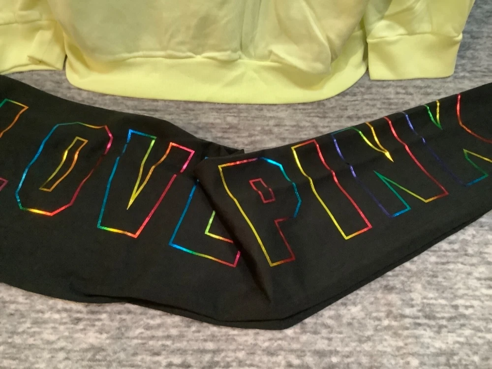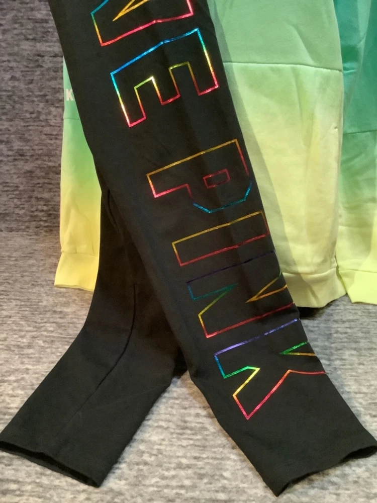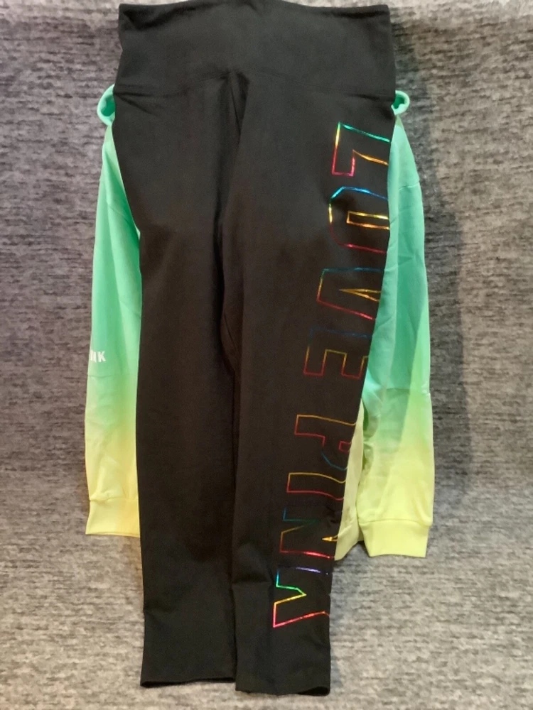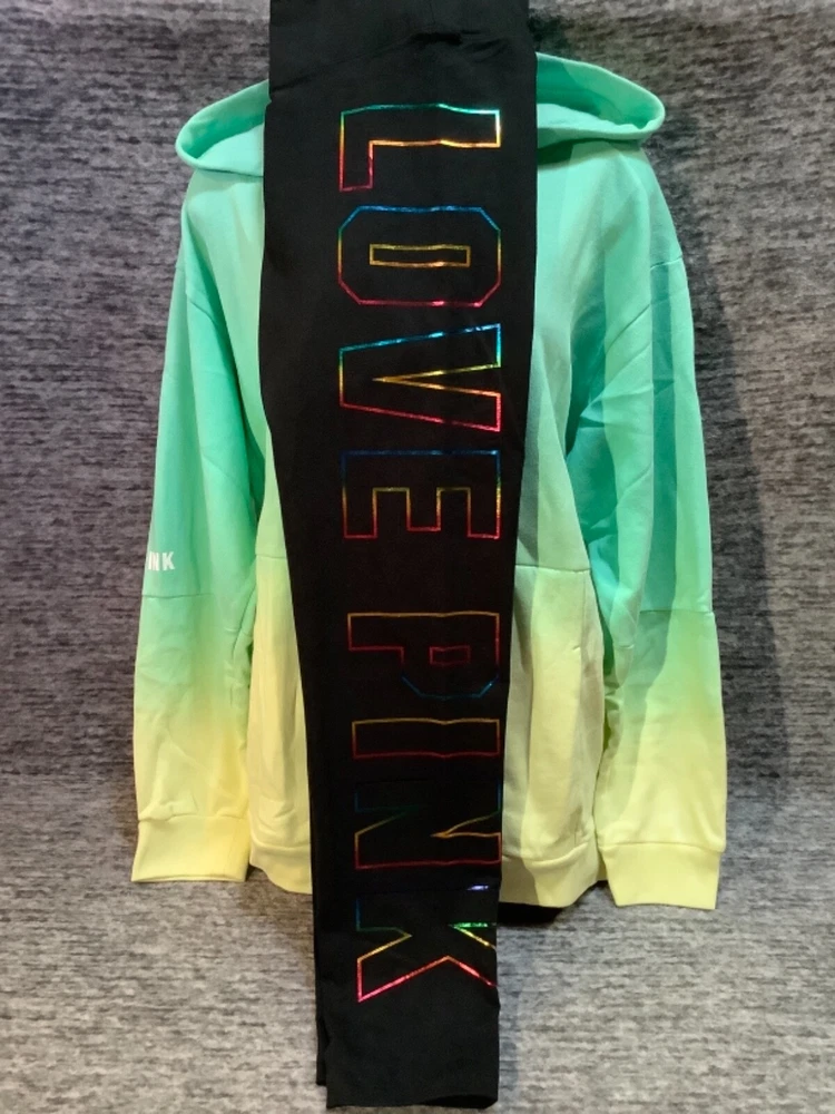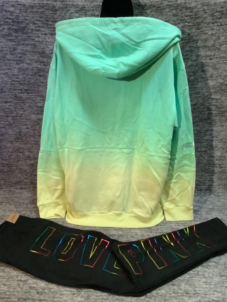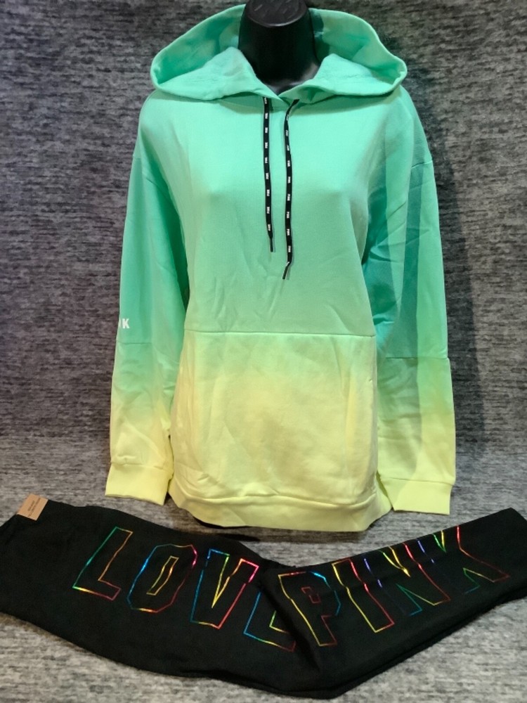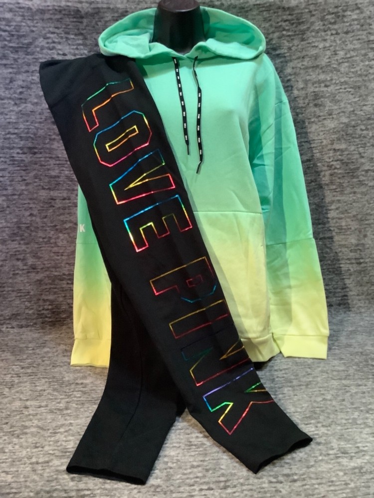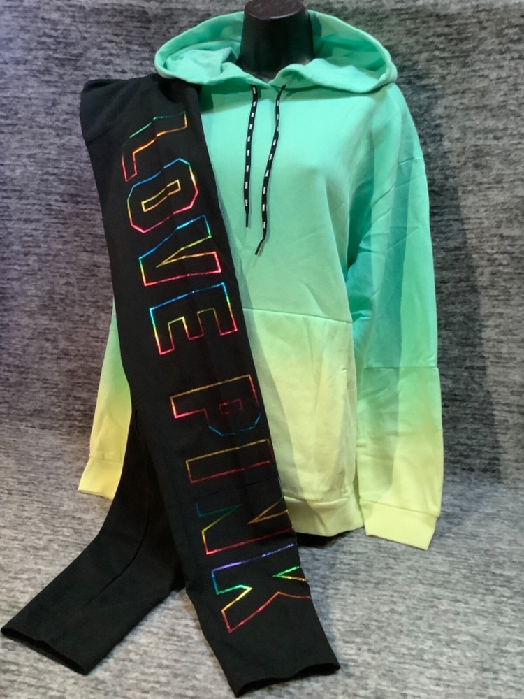 Victoria's Secret Pink Pullover Hoodie and High Waist Leggings Set Color: Dip Dye Ombre "Got a Mint" with black and white PINK logo Black with bling ombre rainbow foil LOVE PINK logo Color might look little different depending on your screen, computer operating system, etc. BRAND NEW WITH TAGS SET SIZE: LARGE HOODIE: RELAXED OVERSIZED FIT Armpit to armpit approx. 25" Shoulder to hem approx. 28" Drawstring hood Black string with repeated white PINK logo Kangaroo pocket Dropped shoulders Long cuffed sleeves Ribbed cuffs and hem Super soft fleece Imported 60% cotton 40% polyester LEGGINGS: RELAXED SLIM FIT High waist Large hidden pocket Full length Inseam approx. 28.5" Imported 87% cotton 13% elastane SEE MY OTHER AUCTIONS FOR COORDINATING PIECES AND MORE GREAT DEALS!!! Please check out all the pictures and the measurements I have posted to make sure this is exactly what you're looking for!!! β₯ If everything is wonderful as expected kindly leave positive feedback...it will automatically be left for you in return!! β₯ Payment is expected within 2 days after close of the auction. Thank you for looking!
