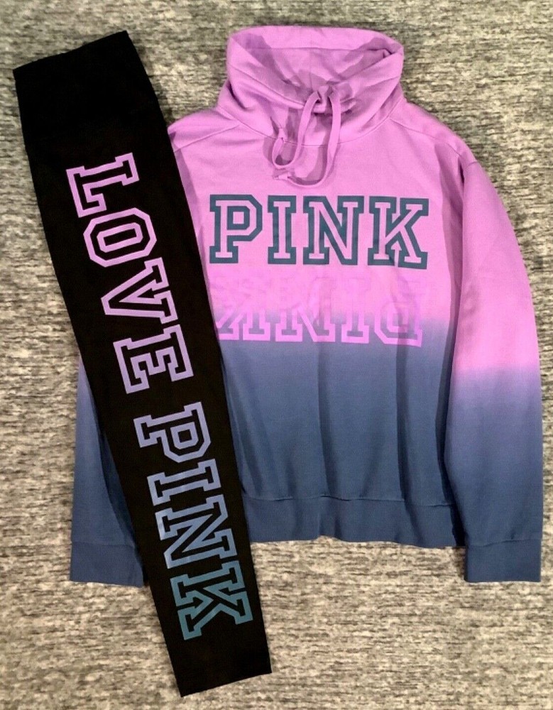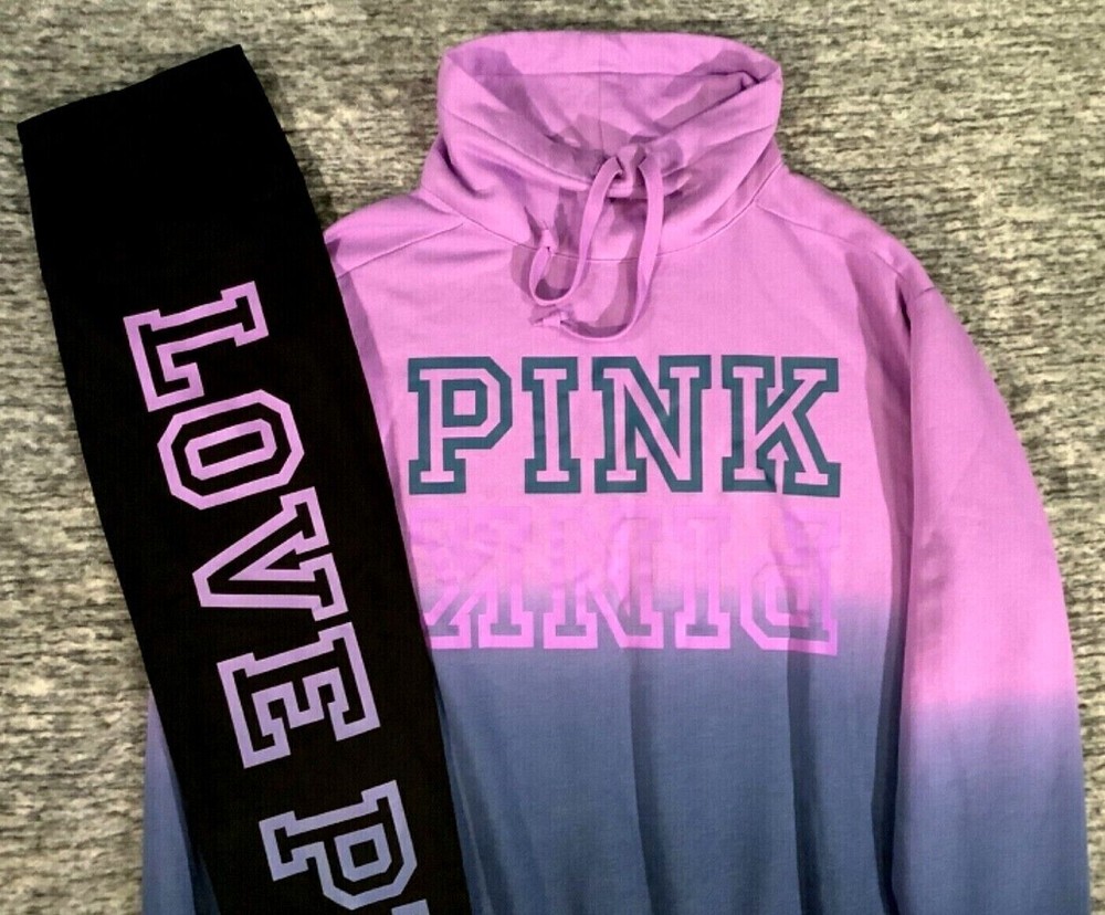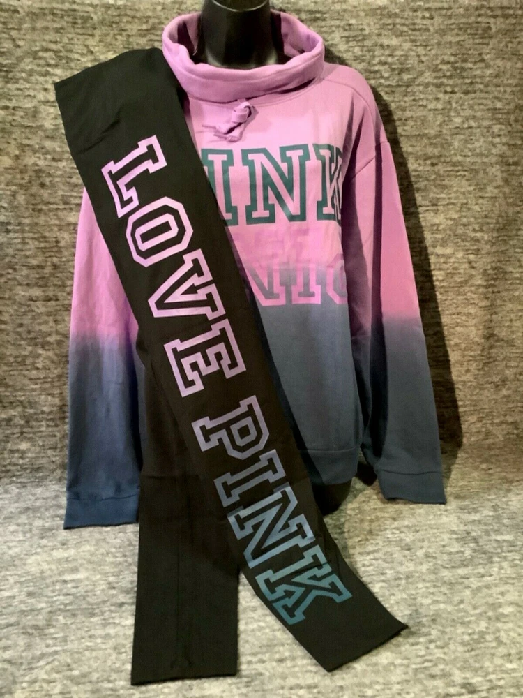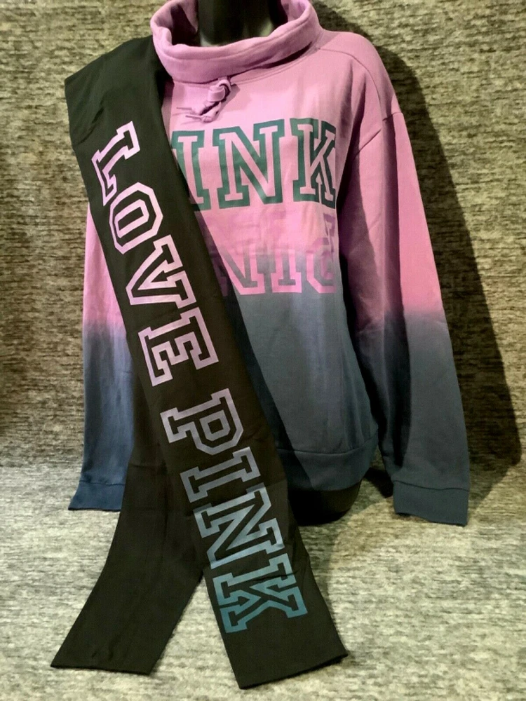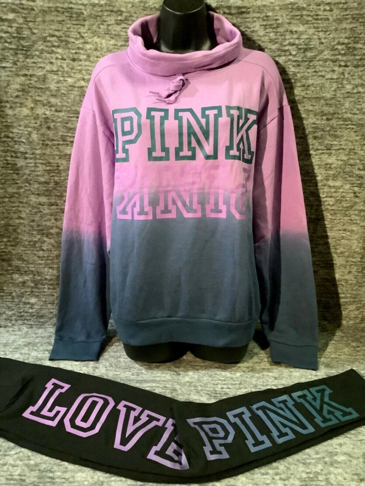 Victoria's Secret Pink Bling Cowl Neck Pullover and High Waist Leggings Set Color: "Amethyst Orchid and Blue Coral" with PINK logo Black with ombre dip dye "Amethyst Orchid and Blue Coral" LOVE PINK logo Color might look little different depending on your screen, computer operating system, etc. BRAND NEW WITH TAGS SET SIZE: LARGE PULLOVER and X-LARGE LEGGINGS PULLOVER: RELAXED OVERSIZED FIT Armpit to armpit approx. 27" Hips approx. 23" Shoulder to hem approx. 26" Cowl neck with adjustable drawstring Long sleeves Ribbed cuffs and hem Super soft fleece Imported 60% cotton 40% polyester LEGGINGS: RELAXED SLIM FIT High waist Large hidden pocket Full length Inseam approx. 28.5" Imported 87% cotton 13% elastane SEE MY OTHER AUCTIONS FOR COORDINATING PIECES AND MORE GREAT DEALS!!! I MAY HAVE *JUST WHAT YOU'VE BEEN LOOKING FOR* Please check out all the pictures and the measurements I have posted to make sure this is exactly what you're looking for!!! β₯ If everything is wonderful as expected kindly leave positive feedback...it will automatically be left for you in return!! β₯ Payment is expected within 2 days after close of the auction. Thank you for looking!