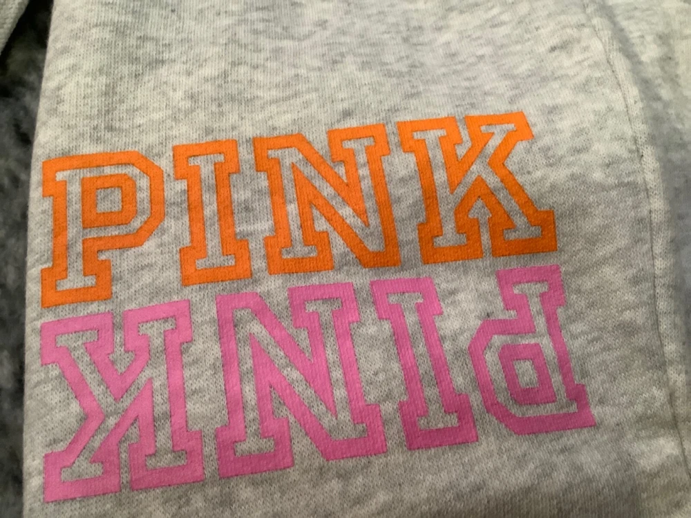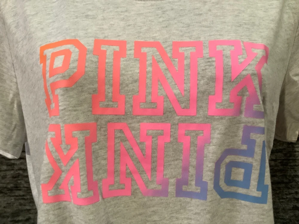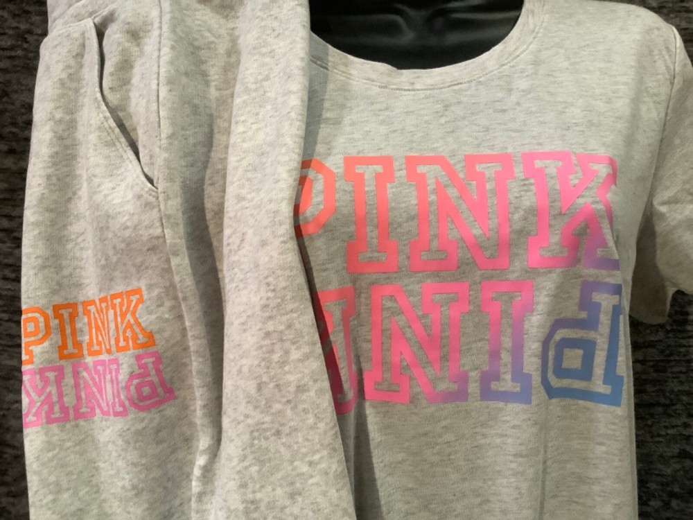 Victoria's Secret Pink Perfect Short Sleeve Tee Shirt and Skinny Jogger Pants Set Color: "Heather Stone Gray" with ombre rainbow PINK logo "Heather Stone Gray" and "Neon Bubblegum" pink ombre dip dye ...