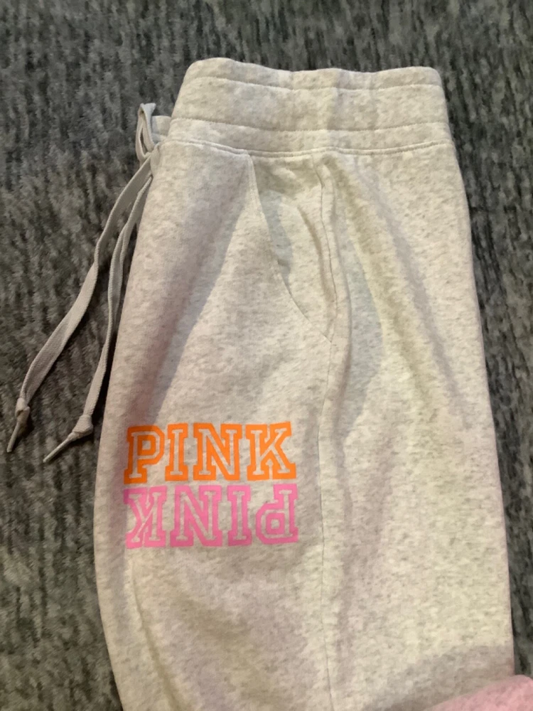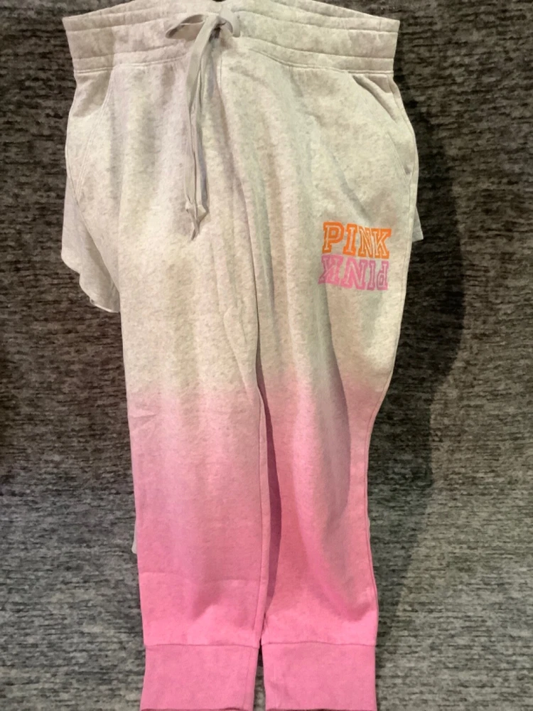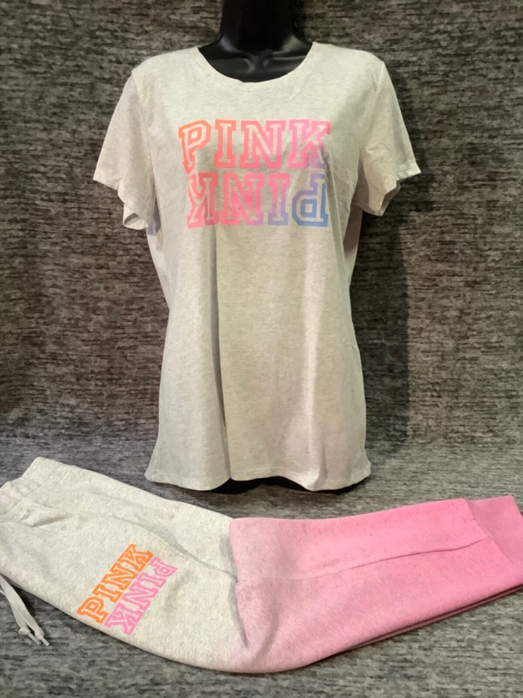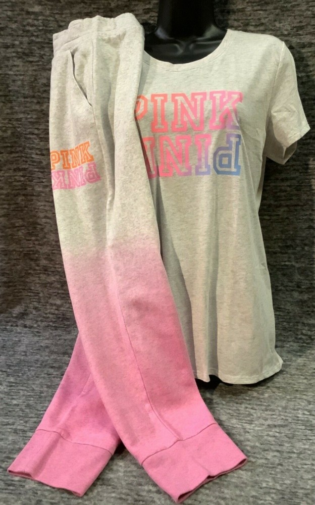 Victoria's Secret Pink Perfect Short Sleeve Tee Shirt and Skinny Jogger Pants Set Color: "Heather Stone Gray" with ombre rainbow PINK logo "Heather Stone Gray" and "Neon Bubblegum" pink ombre dip dye with neon pink and orange PINK logo Color might look little different depending on your screen, computer operating system, etc . BRAND NEW WITH TAGS TEE SHIRT: RELAXED SLIM FIT Armpit to armpit approx. 22" (L) 23" (XL) Shoulder to hem approx. 27.5" (L) 28" (XL) Crew neck Short sleeves Lightweight Imported 60% cotton 40% polyester SKINNY JOGGERS: RELAXED TAPERED SLIM FIT TAPERED FIT - roomier at the top and narrower towards the ankle High waist with adjustable drawstring Front pockets Ribbed banded bottom Full length Approx. 28" inseam Super soft fleece Imported 60% cotton 40% polyester SEE MY OTHER AUCTIONS FOR COORDINATING PIECES AND MORE GREAT DEALS!!! β™₯ If everything is wonderful as expected kindly leave positive feedback...it will automatically be left for you in return!! β™₯ Payment is expected within 2 days after close of the auction. Thank you for looking!