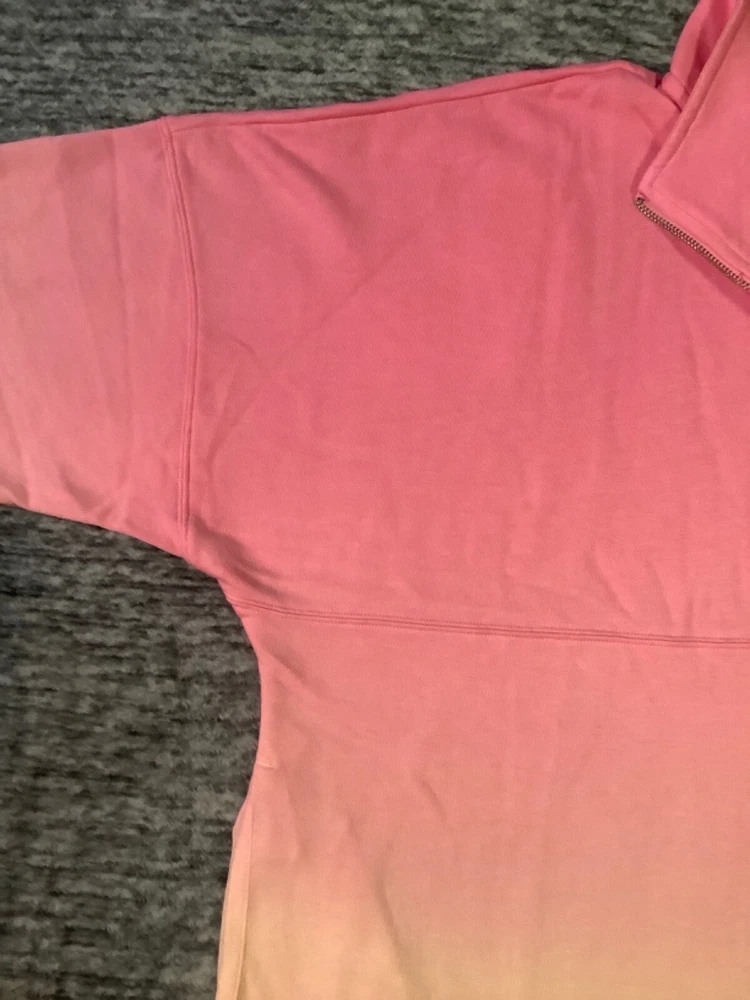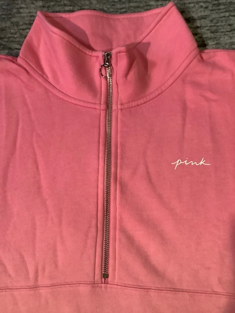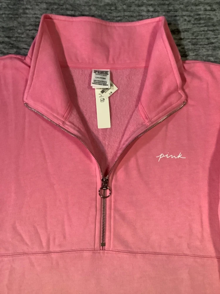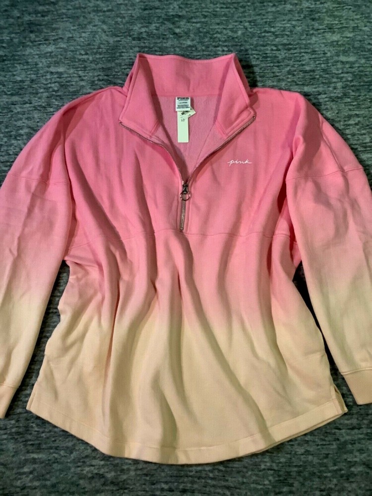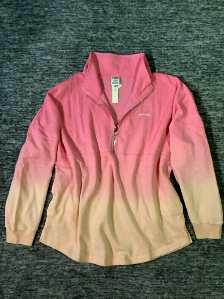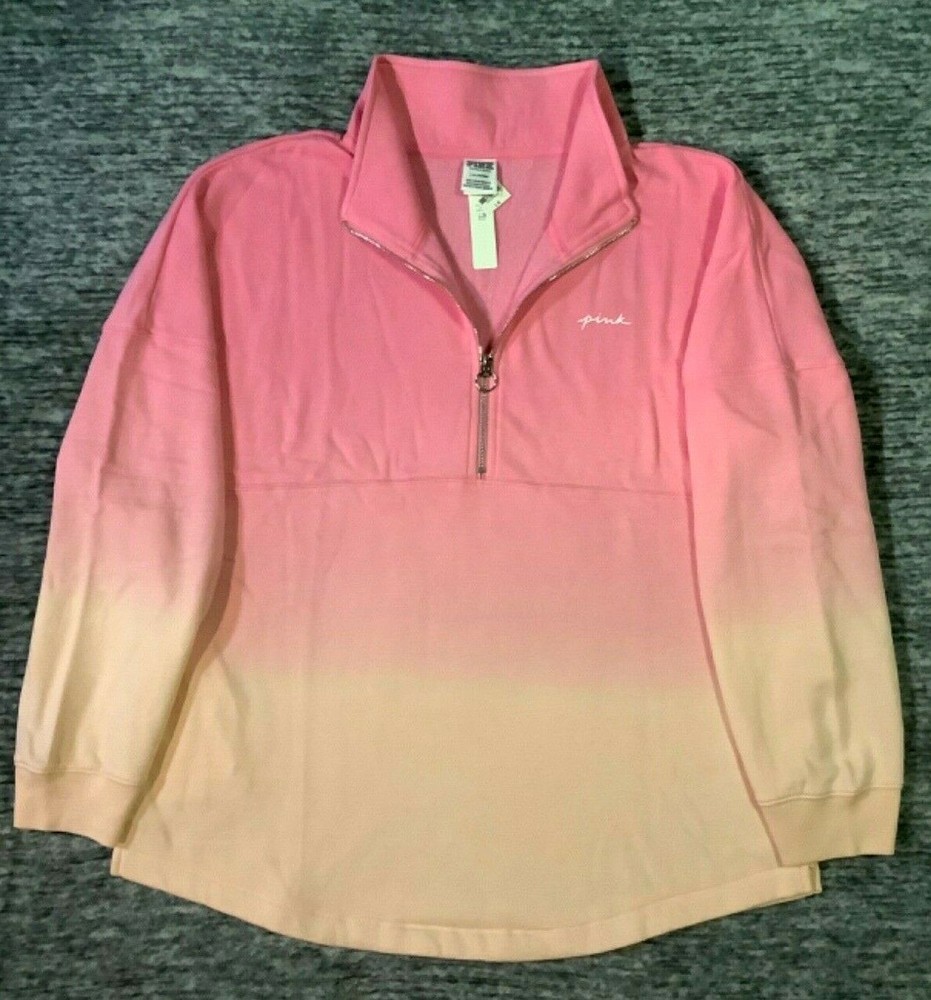 Victoria's Secret Pink Varsity Half Zip Pullover Color: "Bubblegum Pink" and "Peach Aura" ombre dip dye Each dip dye one-of-a-kind Color might look little different depending on your screen, computer operating system, etc. BRAND NEW WITH TAG RELAXED OVERSIZED FIT Armpit to armpit approx. 27" (L) 28" (XL) Hips approx. 25" (L) 26" (XL) Shoulder to hem approx. 26" (L) 27.5" (XL) side and 27" (L) 28" (XL) front (curved hem) Longer tunic length with approx. 2" side slits Half zip Mock neck / high neck Small white PINK logo on the front Side pockets Piecing details Dropped shoulders Long cuffed sleeves Curved hem with side slits Super soft fleece Imported 60% cotton 40% polyester SEE MY OTHER AUCTIONS FOR COORDINATING PIECES AND MORE GREAT DEALS!!! I MAY HAVE *JUST WHAT YOU'VE BEEN LOOKING FOR* Please check out all the pictures and the measurements I have posted to make sure this is exactly what you're looking for!!! ♥ If everything is wonderful as expected kindly leave positive feedback...it will automatically be left for you in return!! ♥ Payment is expected within 2 days after close of the auction. Thank you for looking!