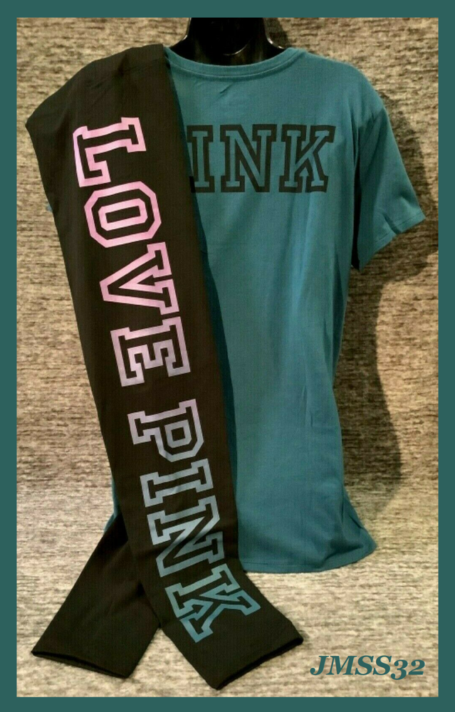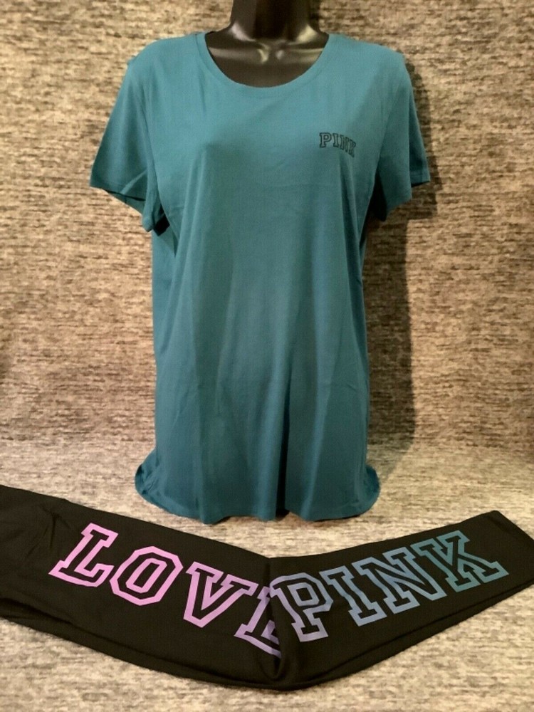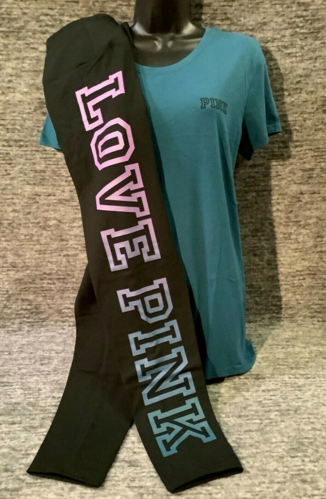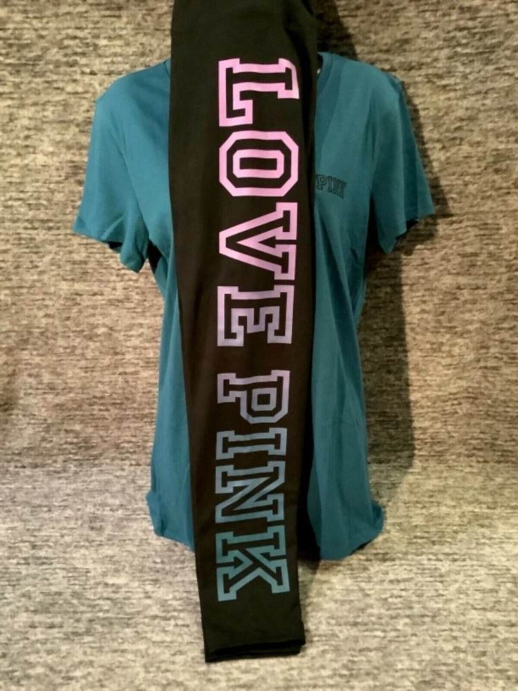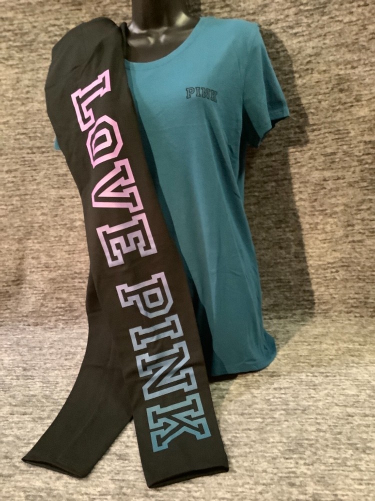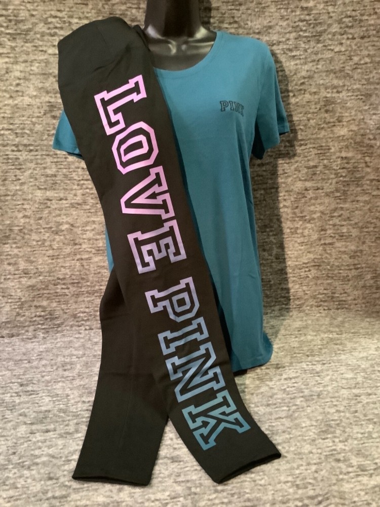 Victoria's Secret Pink Short Sleeve Tee Shirt and High Waist Leggings Set Color: "Blue Coral" with black PINK logo Black with ombre dip dye "Amethyst Orchid and Blue Coral" LOVE PINK logo Color might look little different depending on your screen, computer operating system, etc. BRAND NEW WITH TAGS SET SIZE: LARGE TEE SHIRT: RELAXED SLIM FIT Armpit to armpit approx. 21" Shoulder to hem approx. 28" Crew neck Small PINK logo on the front Short sleeves Imported 60% cotton 40% polyester LEGGINGS: RELAXED SLIM FIT High waist Large hidden pocket Full length Inseam approx. 28.5" Imported 87% cotton 13% elastane SEE MY OTHER AUCTIONS FOR COORDINATING PIECES AND MORE GREAT DEALS!!! Please check out all the pictures and the measurements I have posted to make sure this is exactly what you're looking for!!! ♥ If everything is wonderful as expected kindly leave positive feedback...it will automatically be left for you in return!! ♥ Payment is expected within 2 days after close of the auction. Thank you for looking!