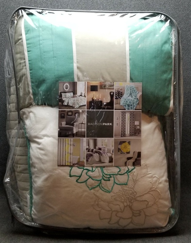 (The USPS, UPS and FedEx are experiencing delays due to high demand. While we guarantee that we will ship the item within one business day of payment, some shipments may be delayed in-transit and/or show fewer transit updates until they reach a local hub.) Up for sale is a Vienna 3 Piece Quilted Coverlet Set Aqua/ Multi-Color Comforter Set - King . As you can see from the pictures the box is in a bit of rough shape and the 2 shams and one of the pillows is not included. Also there are some threads missing from the flower pillow (shown in pics). But aside from that this set is otherwise new and comes exactly as you see it in the pictures, so buy with confidence. ( The item pictured is the actual item you will be receiving and only comes with what is shown in pictures ) Note: Be sure to double check and make sure that your Paypal address is current because we wouldn't want there to be some kind of mix up, right?