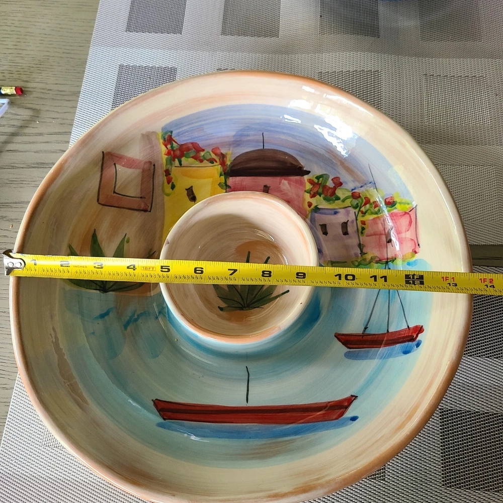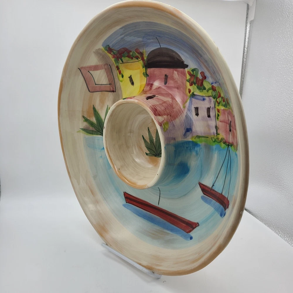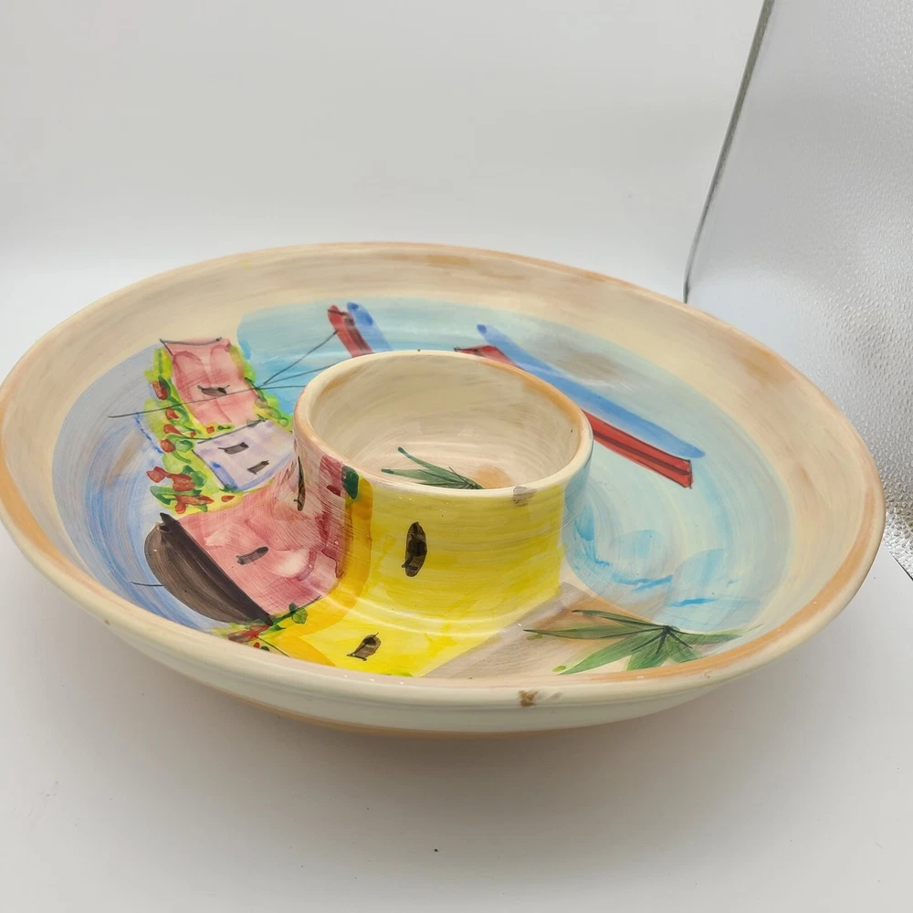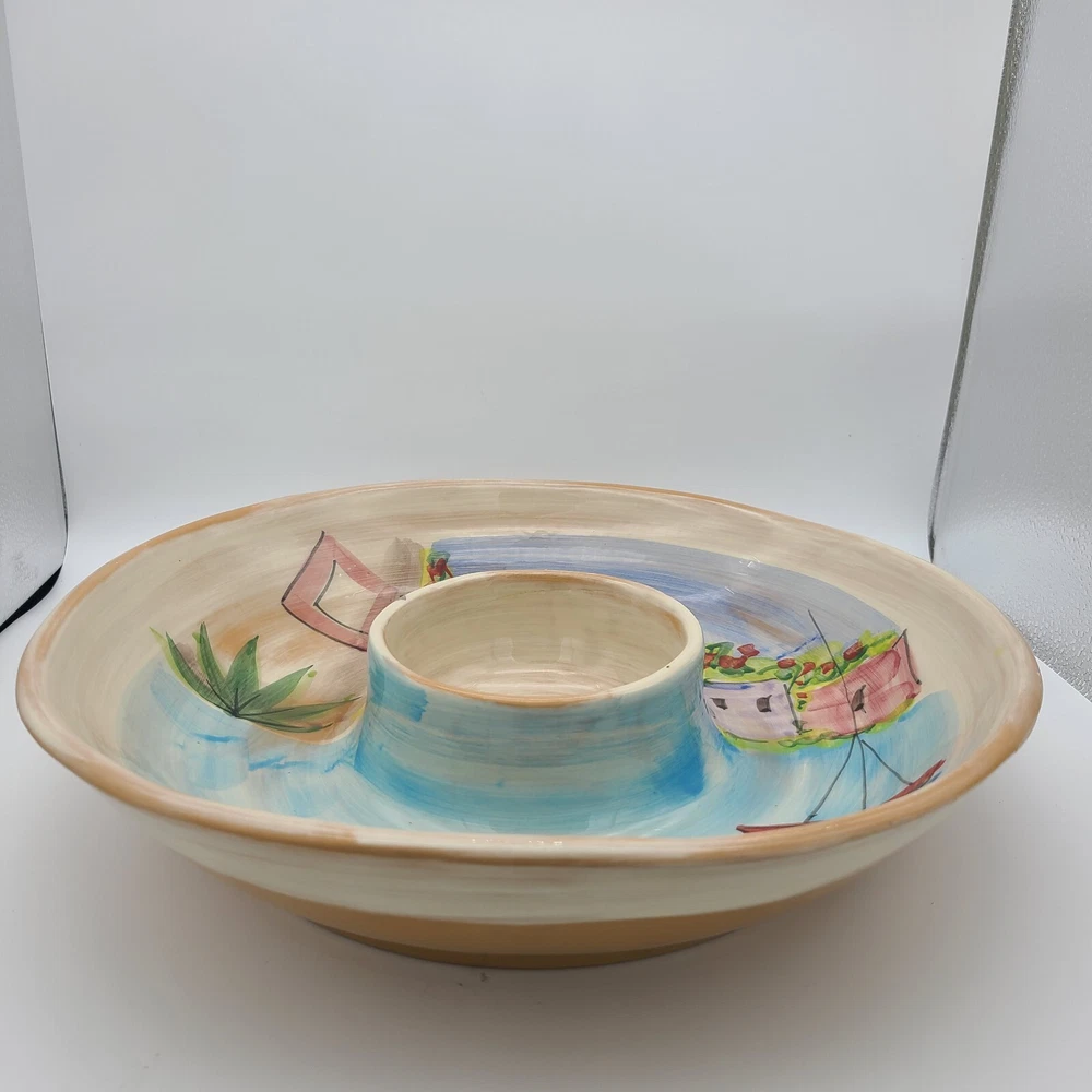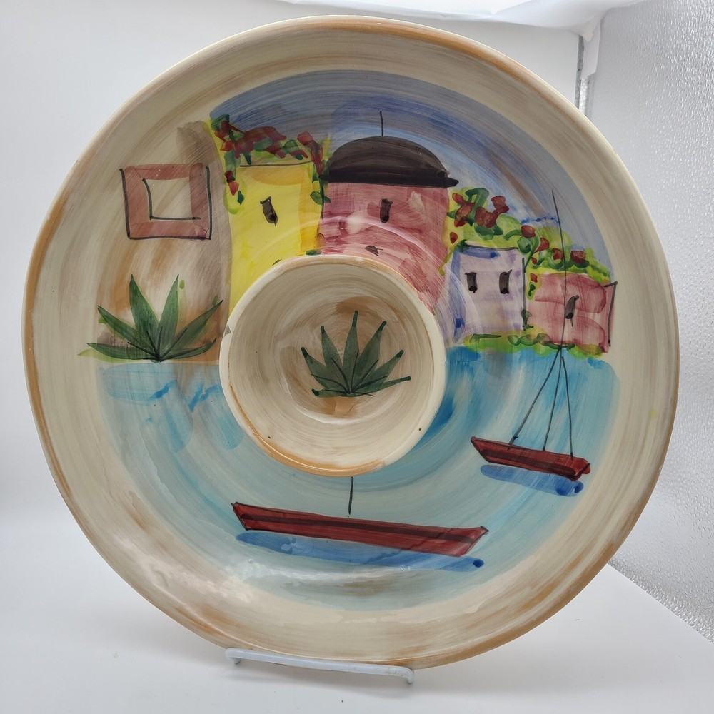 Vietri Chip & Dip Italy Pottery Large Bowl Tray Hand painted village boat Marina. 13.75" diam eter and about 3" deep Hand painted Condition: it doesn't have any cracks or creases, but it has one rim glaze chip, about 1" long. Please check my close up picture very carefully This is a wonderful serving tray by Vietri. Rare pattern. This tray can be used year round as it looks like spring summer, party and vacation!!