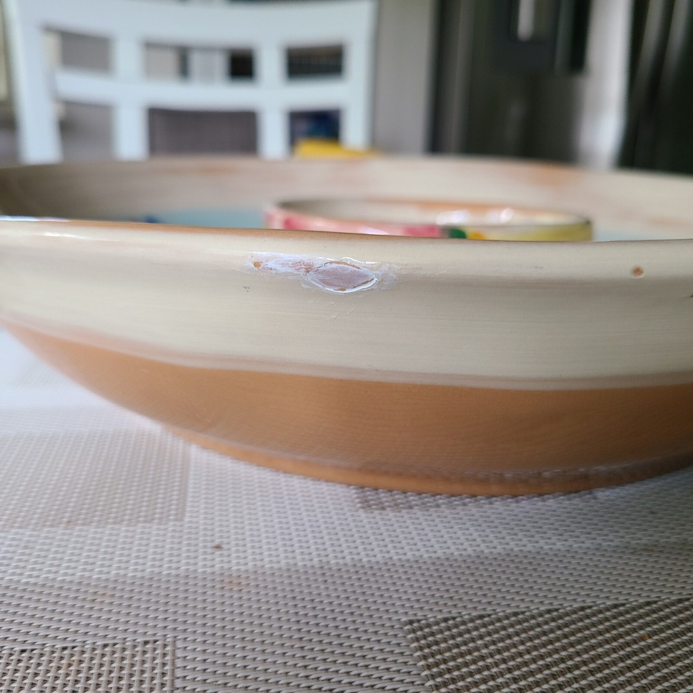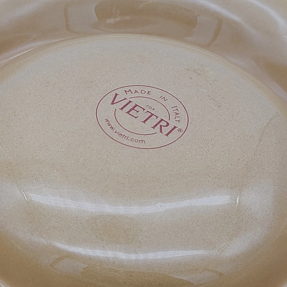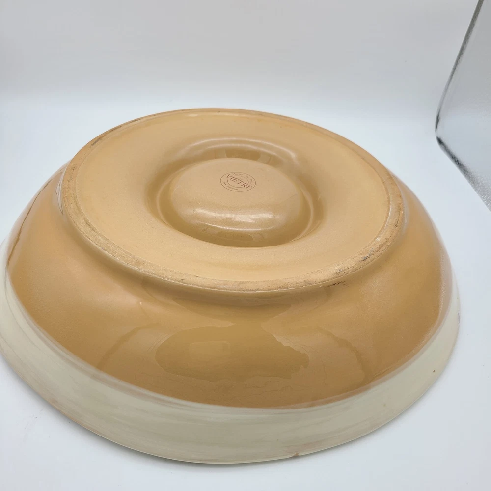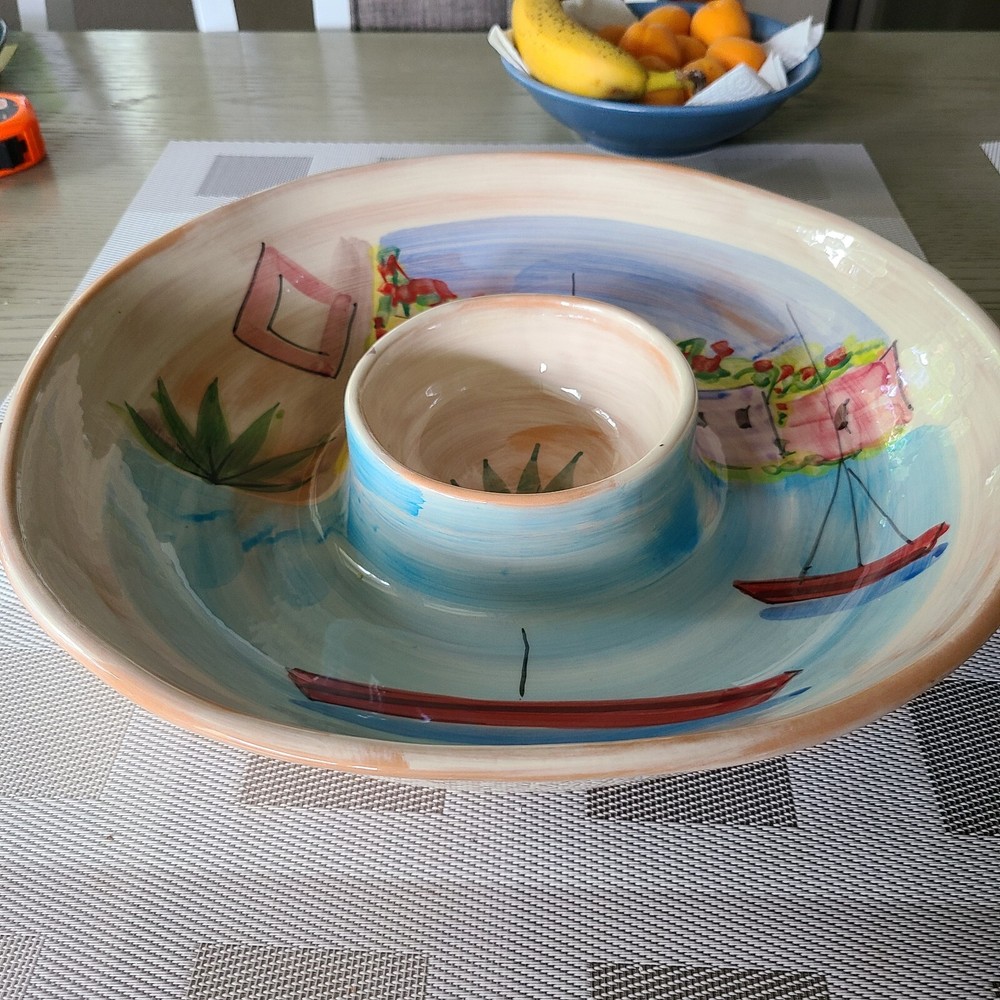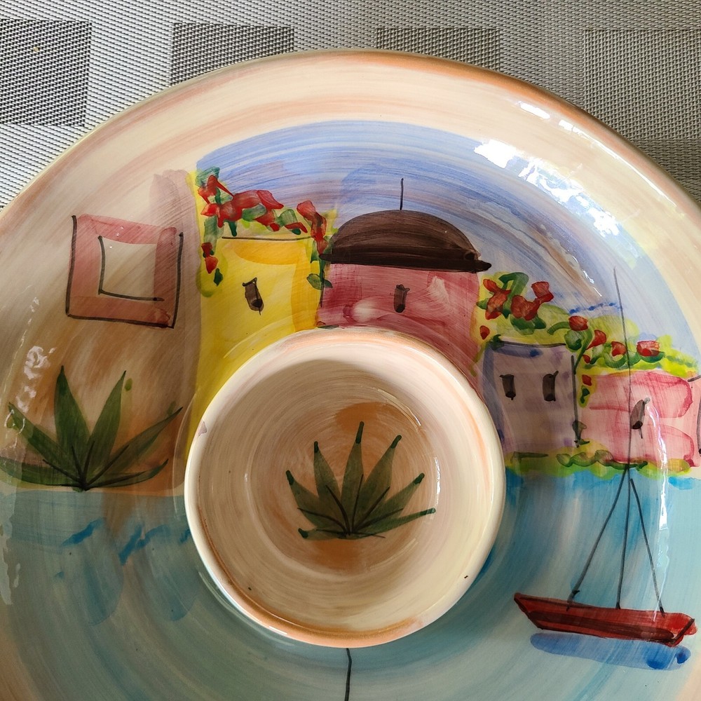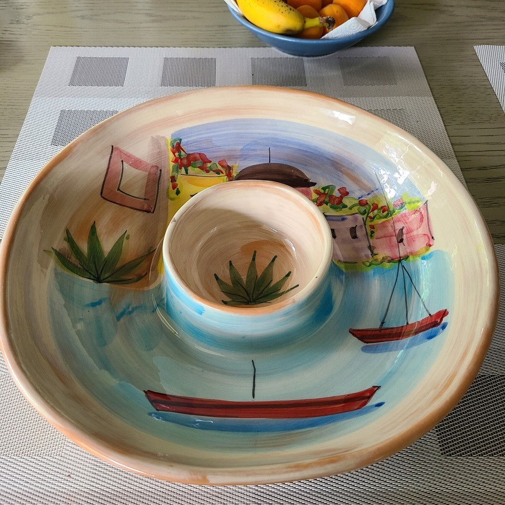 Vietri Chip & Dip Italy Pottery Large Bowl Tray Hand painted village boat Marina. 13.75" diam eter and about 3" deep Hand painted Condition: it doesn't have any cracks or creases, but it has one rim glaze chip, about 1" long. Please check my close up picture very carefully This is a wonderful serving tray by Vietri. Rare pattern. This tray can be used year round as it looks like spring summer, party and vacation!!